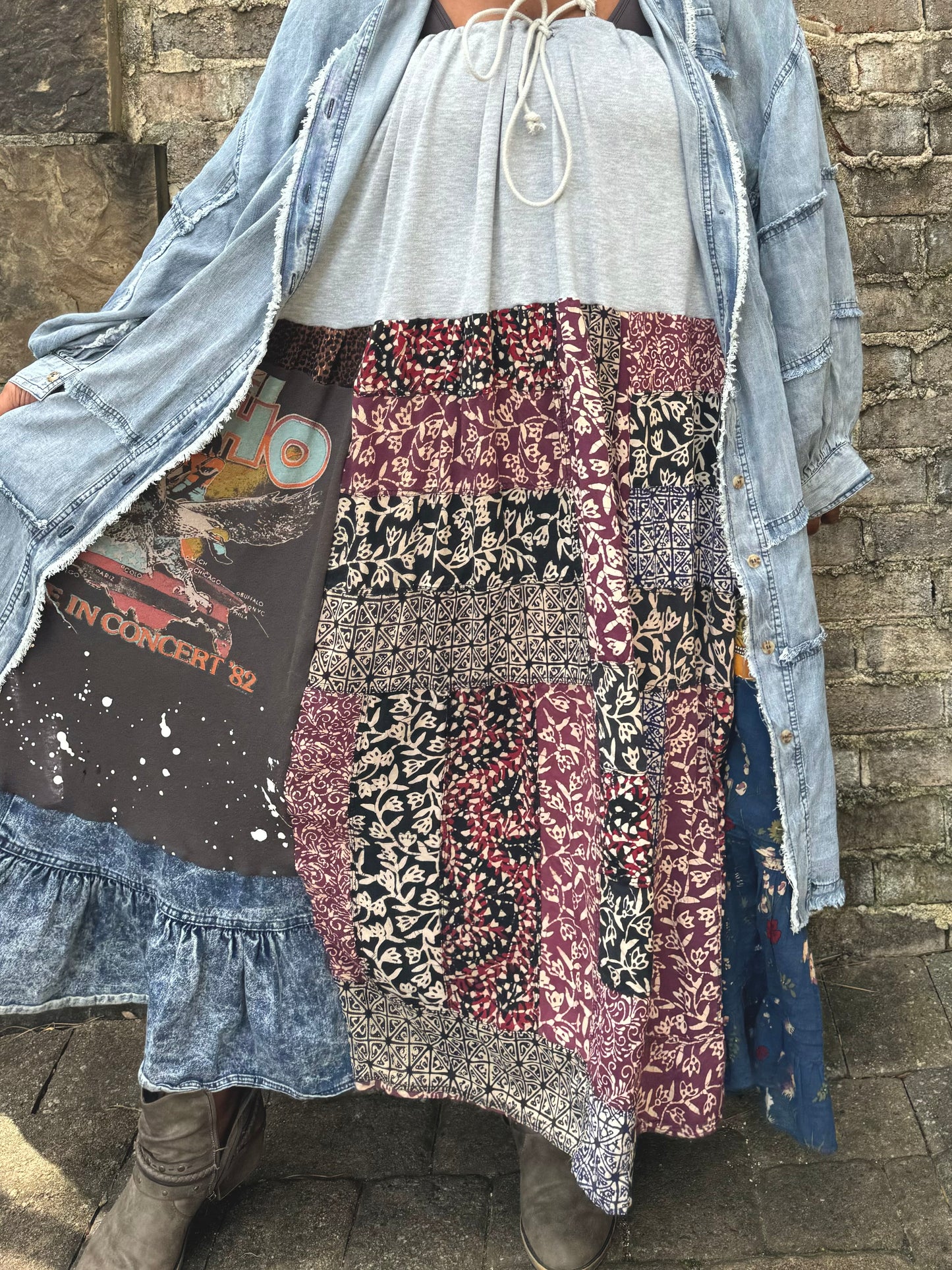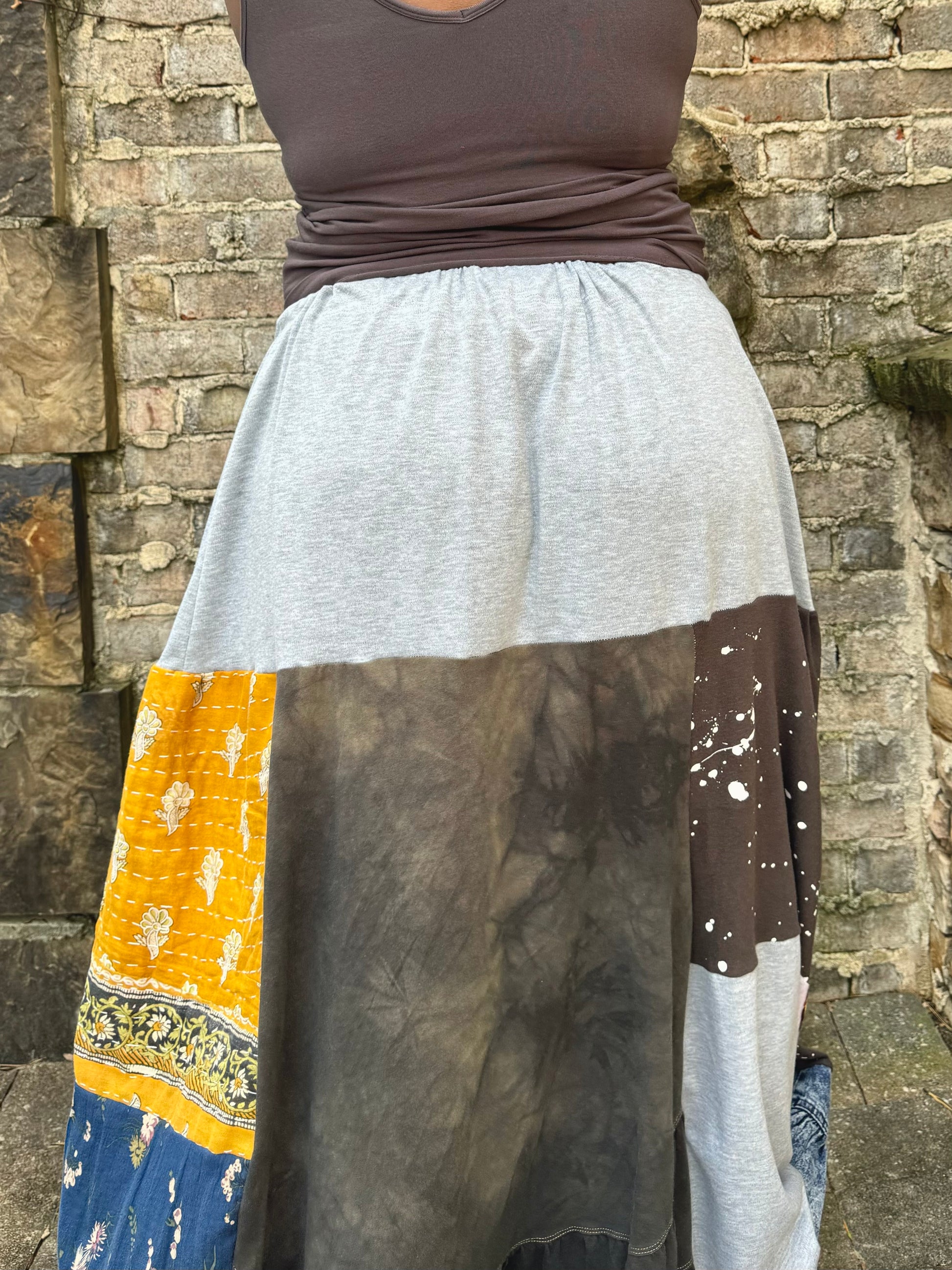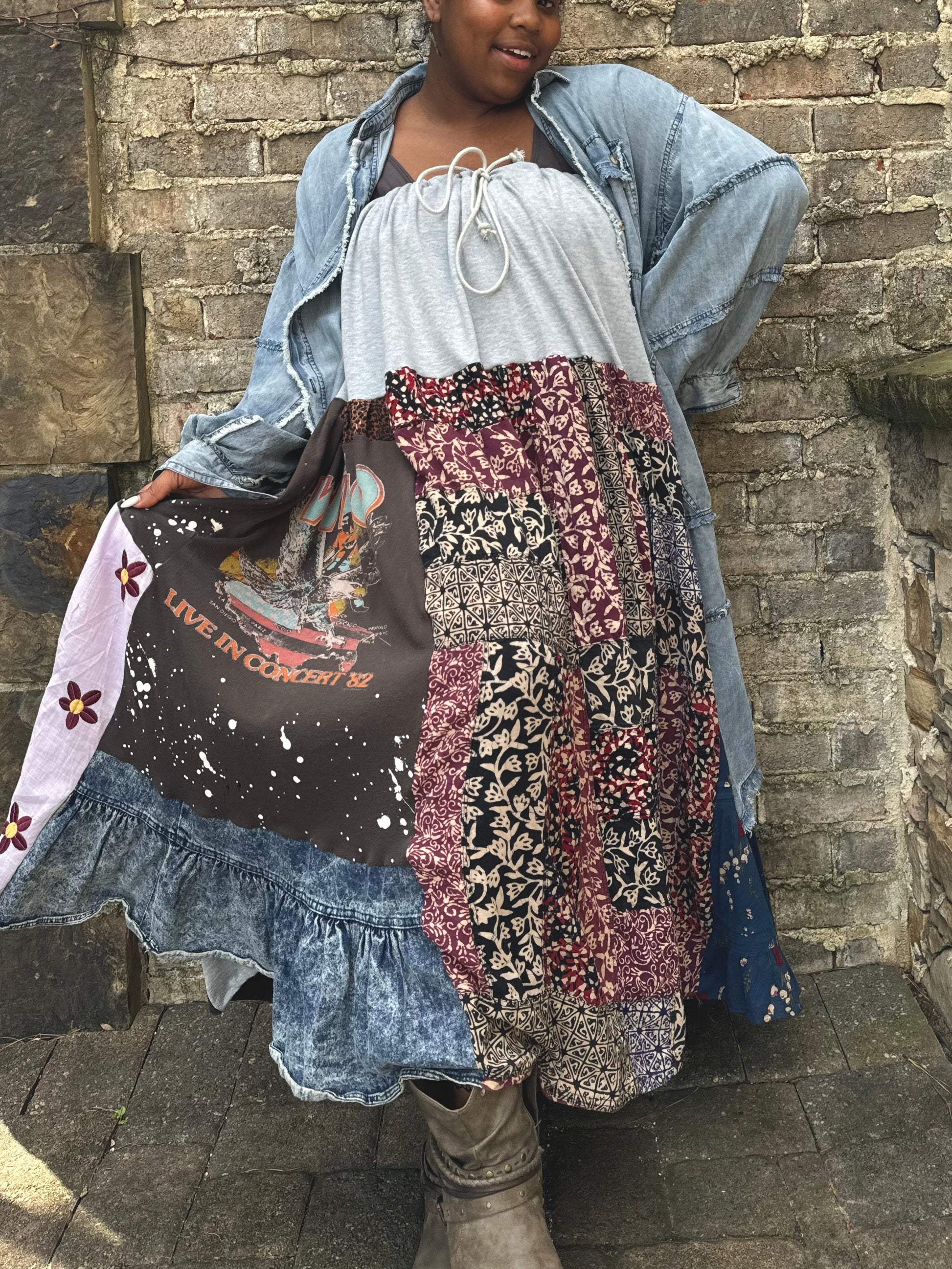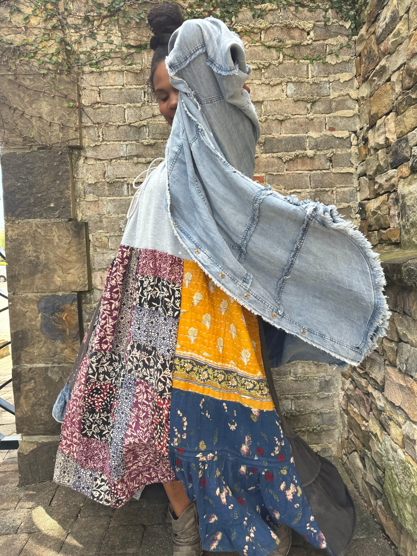 - All fabrics are hand arranged and cut into pieces to make a beautiful circle skirt.