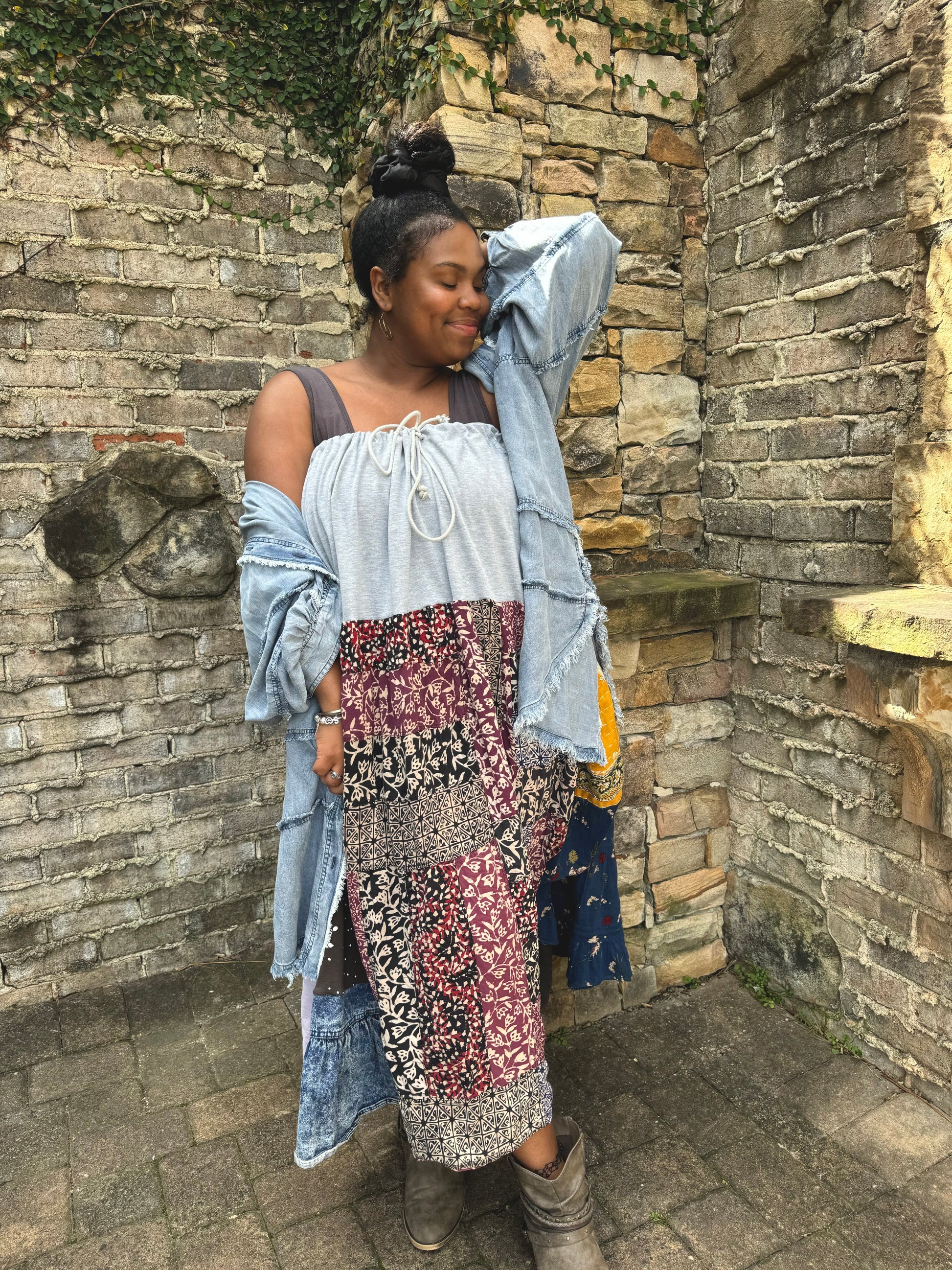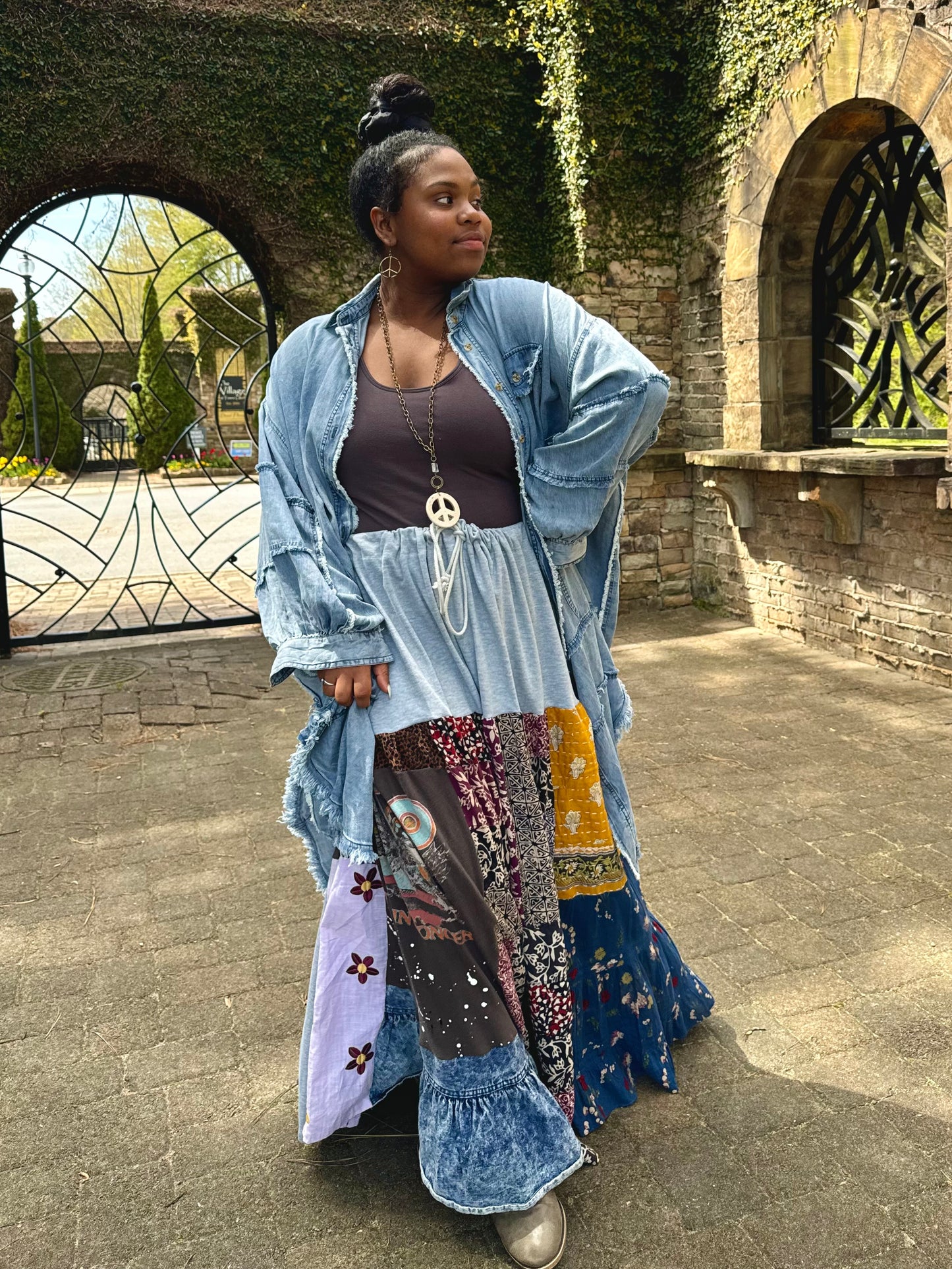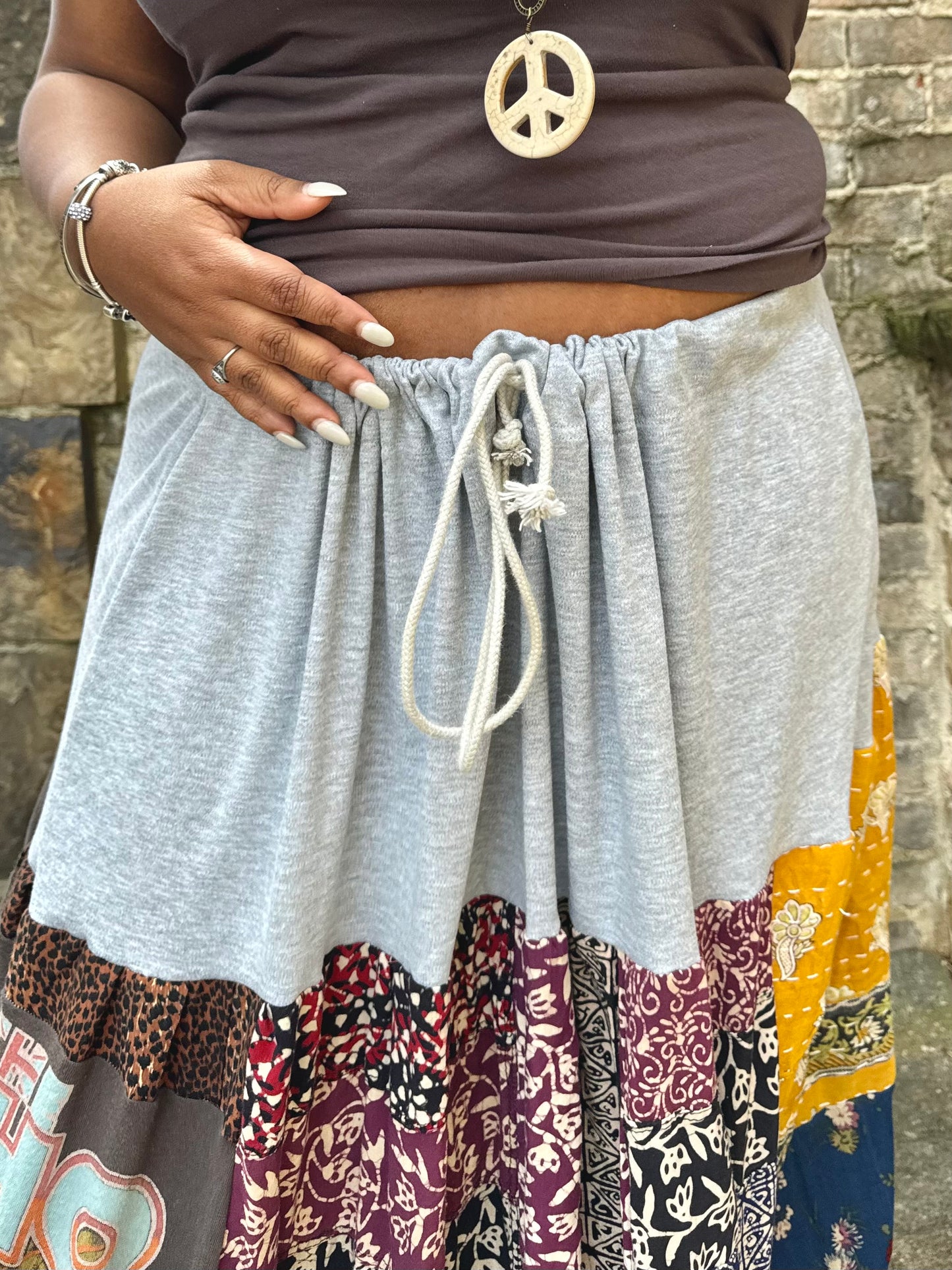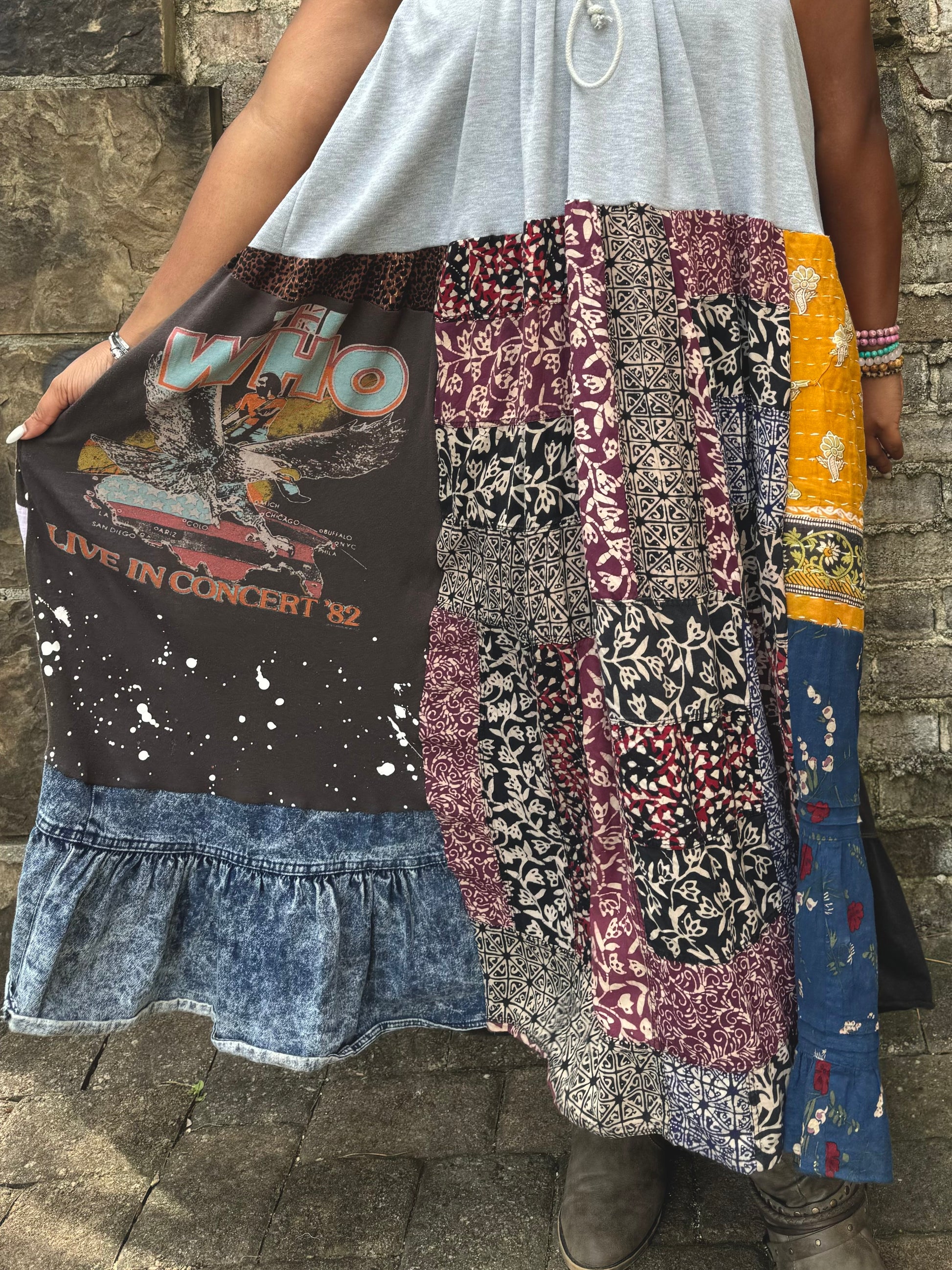 - All fabrics are hand arranged and cut into pieces to make a beautiful circle skirt.