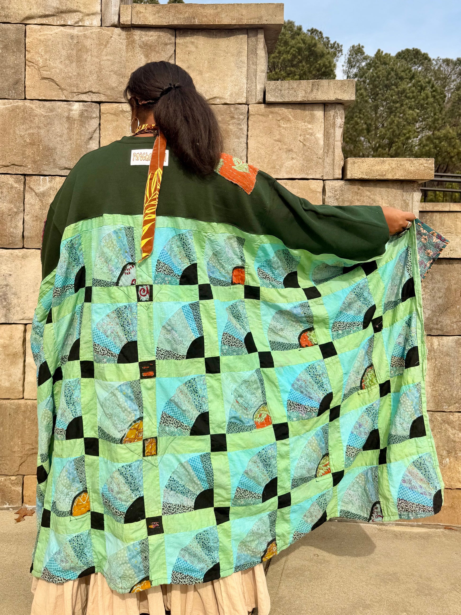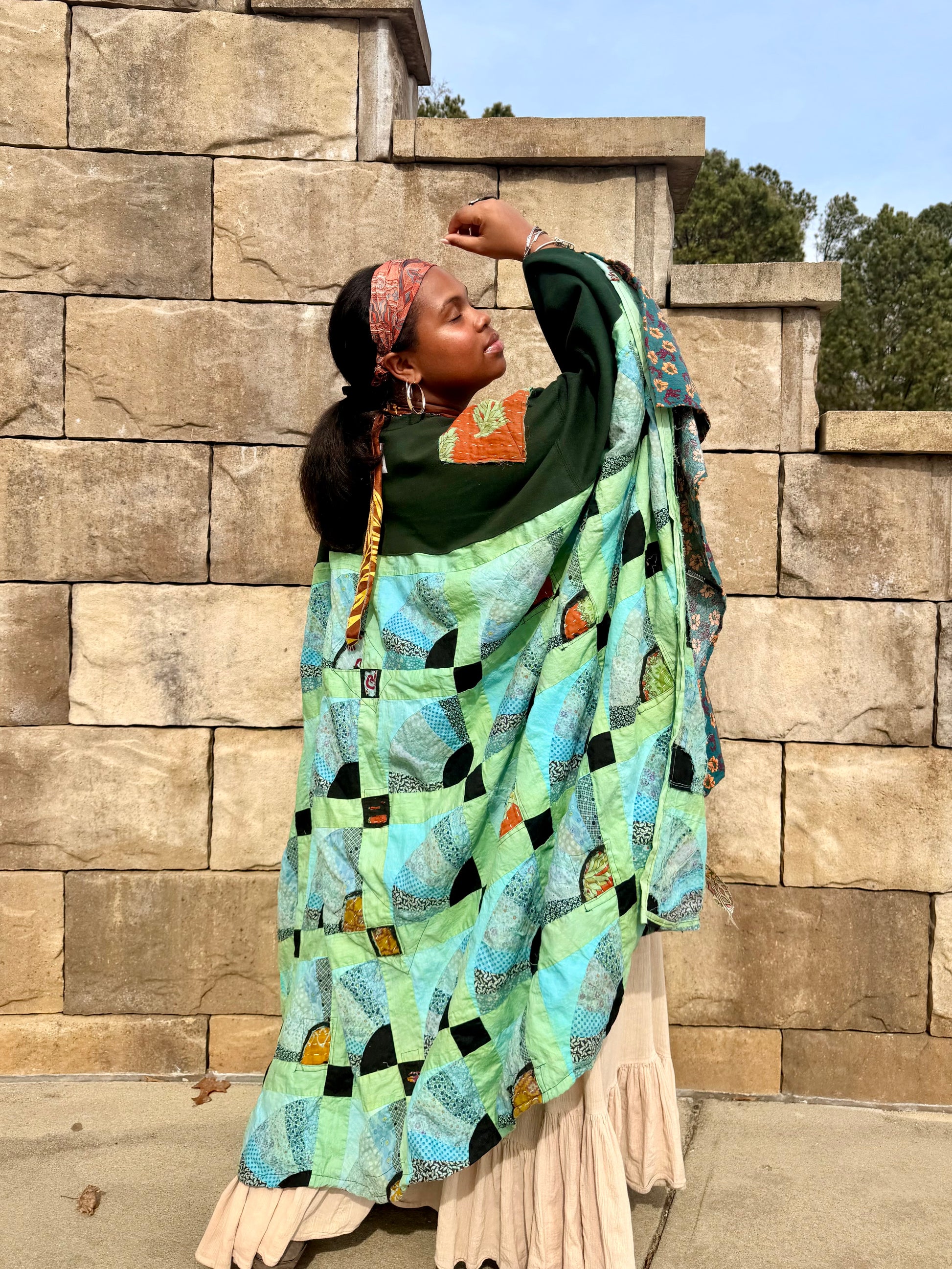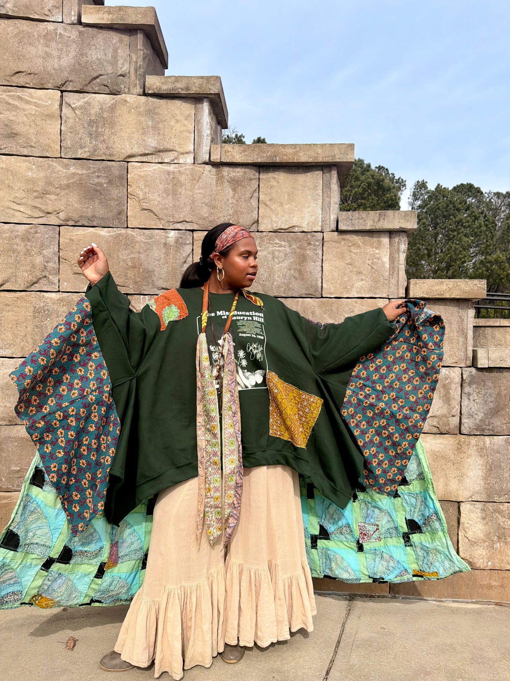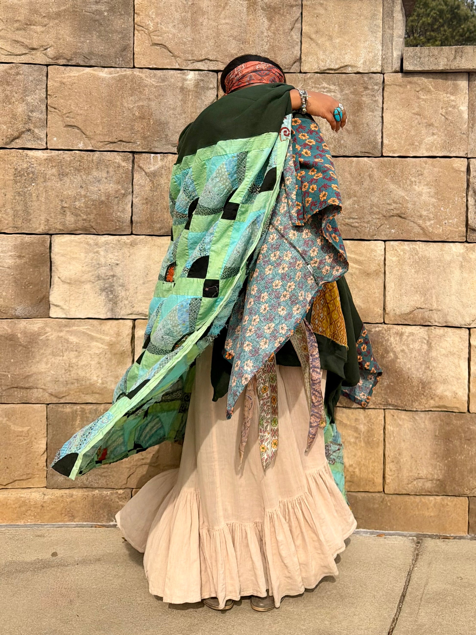 - Upcycled from a crewneck, quilt topper, and Kantha.