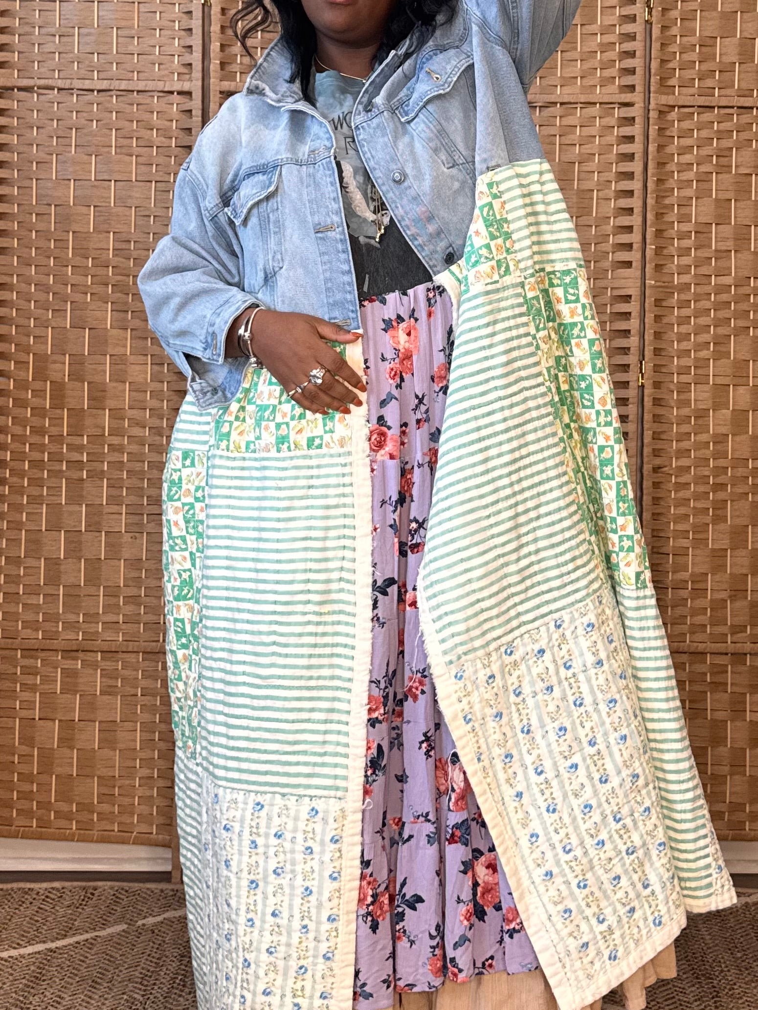 - Upcycled from a quilted bedspread and a waffle knit jacket.