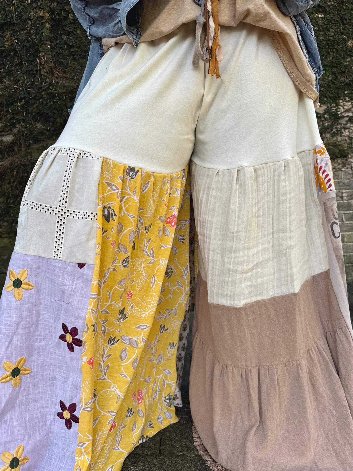- All fabrics are hand arranged and cut into pieces to make beautiful pant legs.