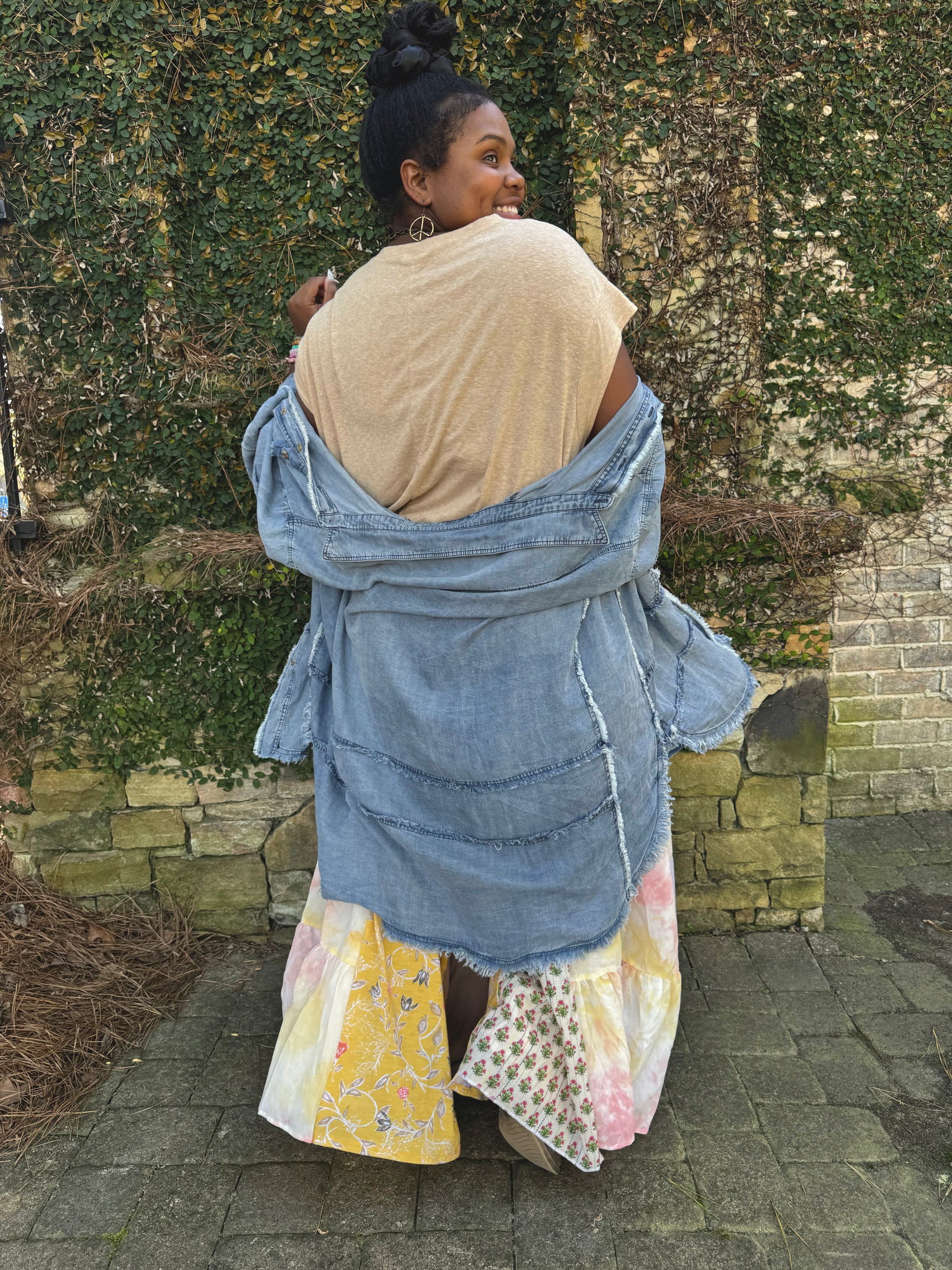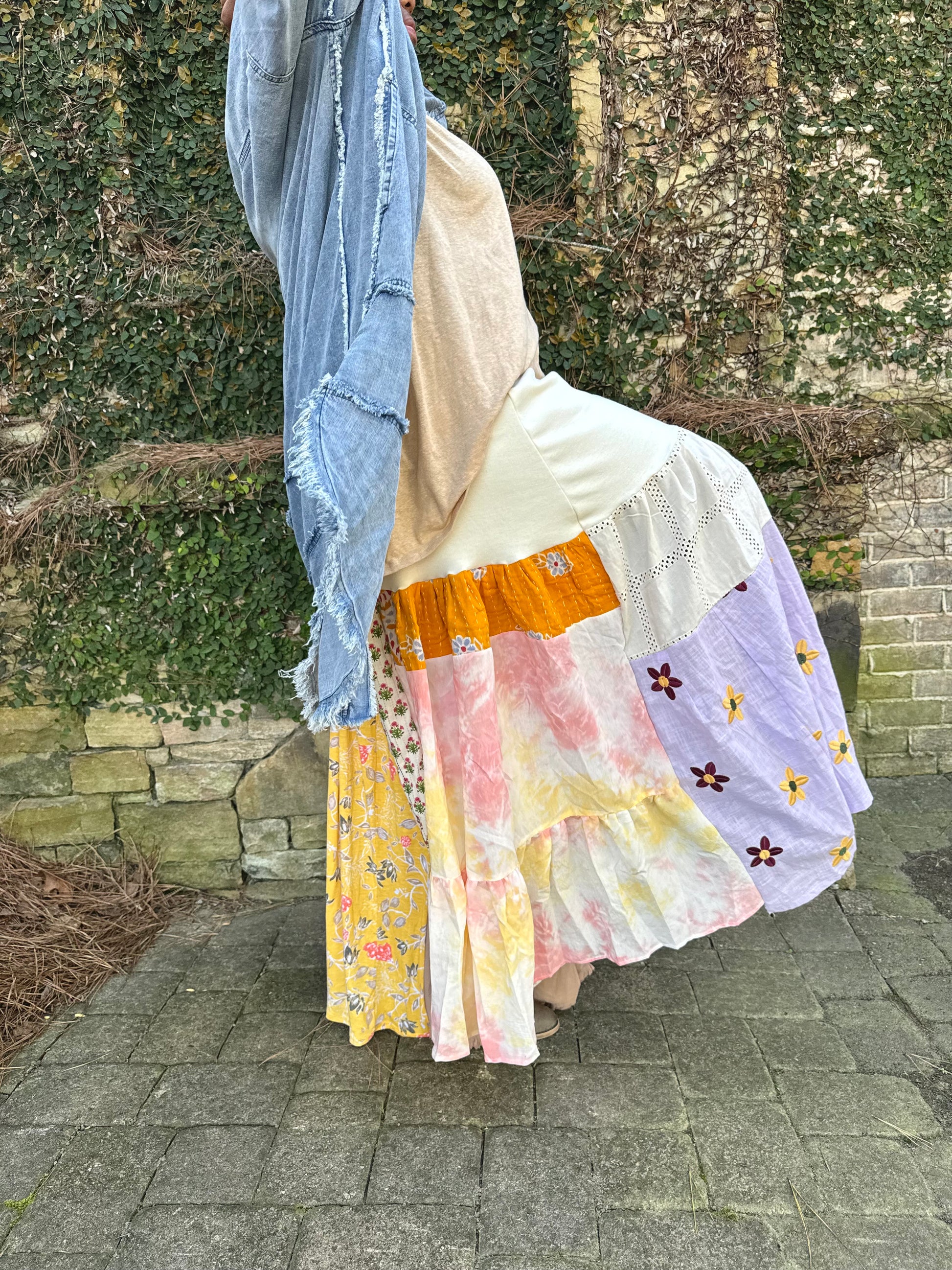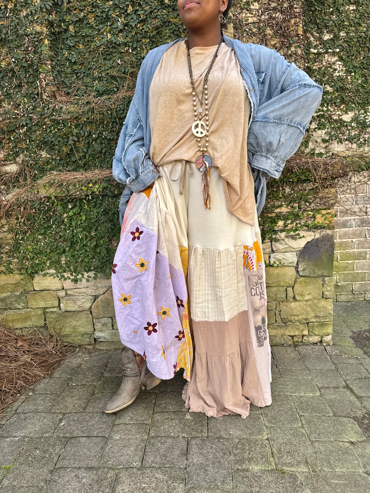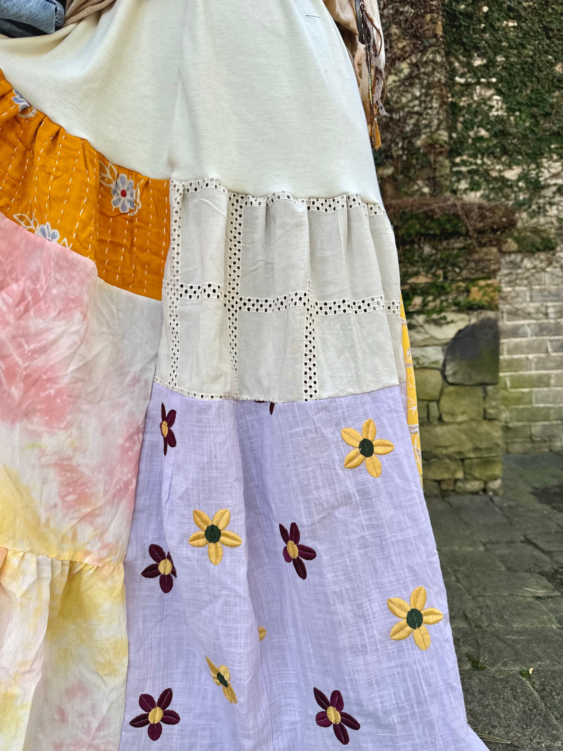 - Double lined tshirt fabric and a mix of fabrics from dresses and skirts.
