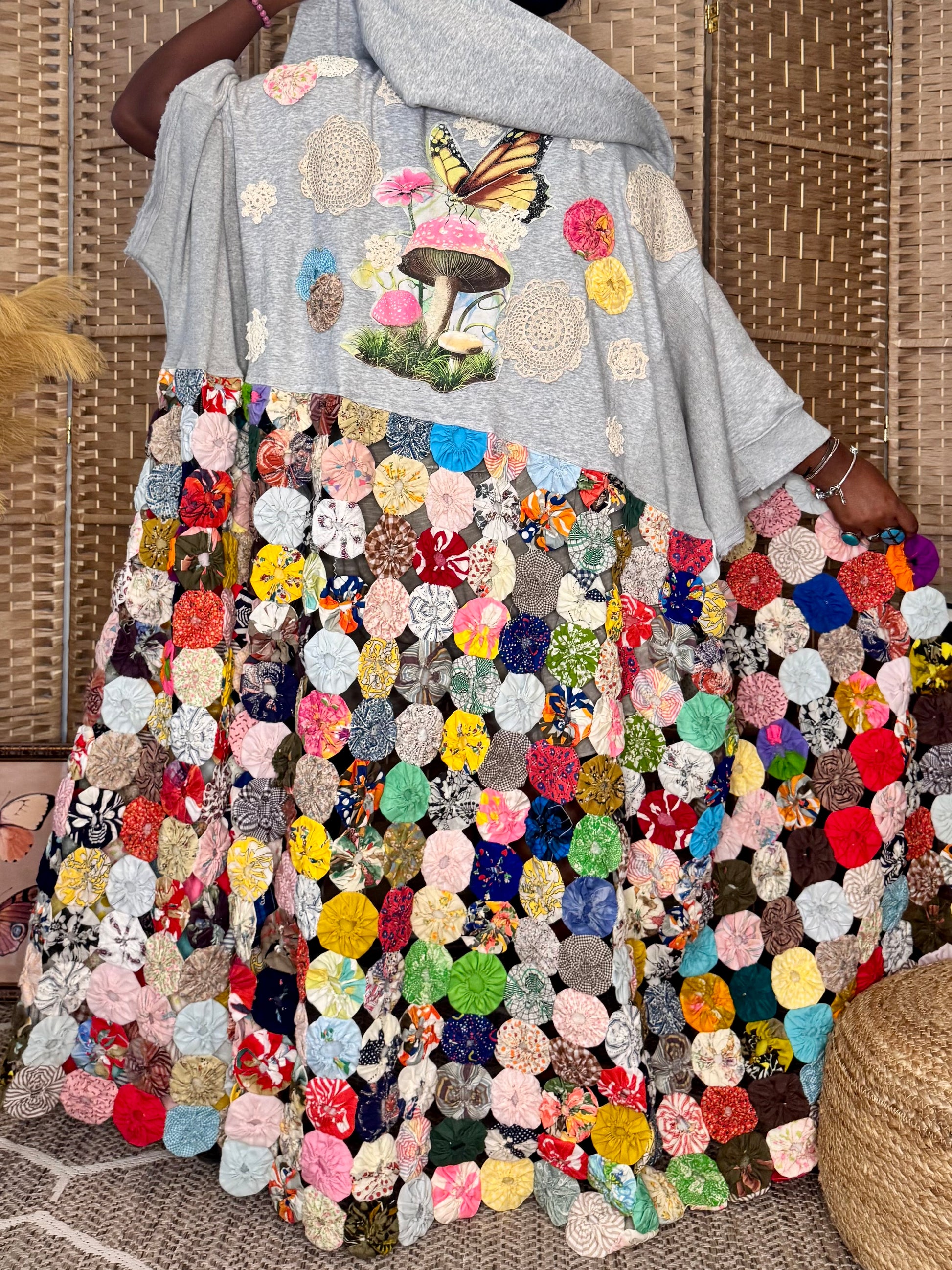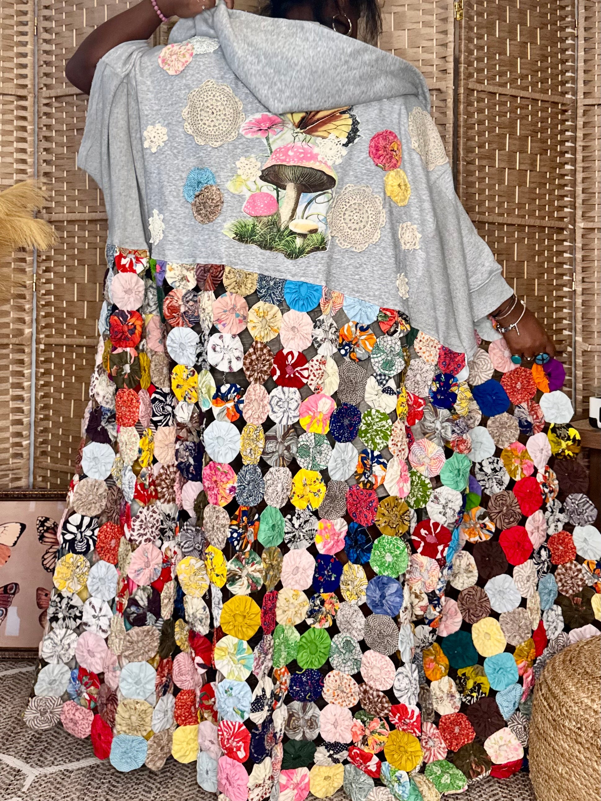 - Upcycled from a hand quilted bedspread, and a zip up jacket.