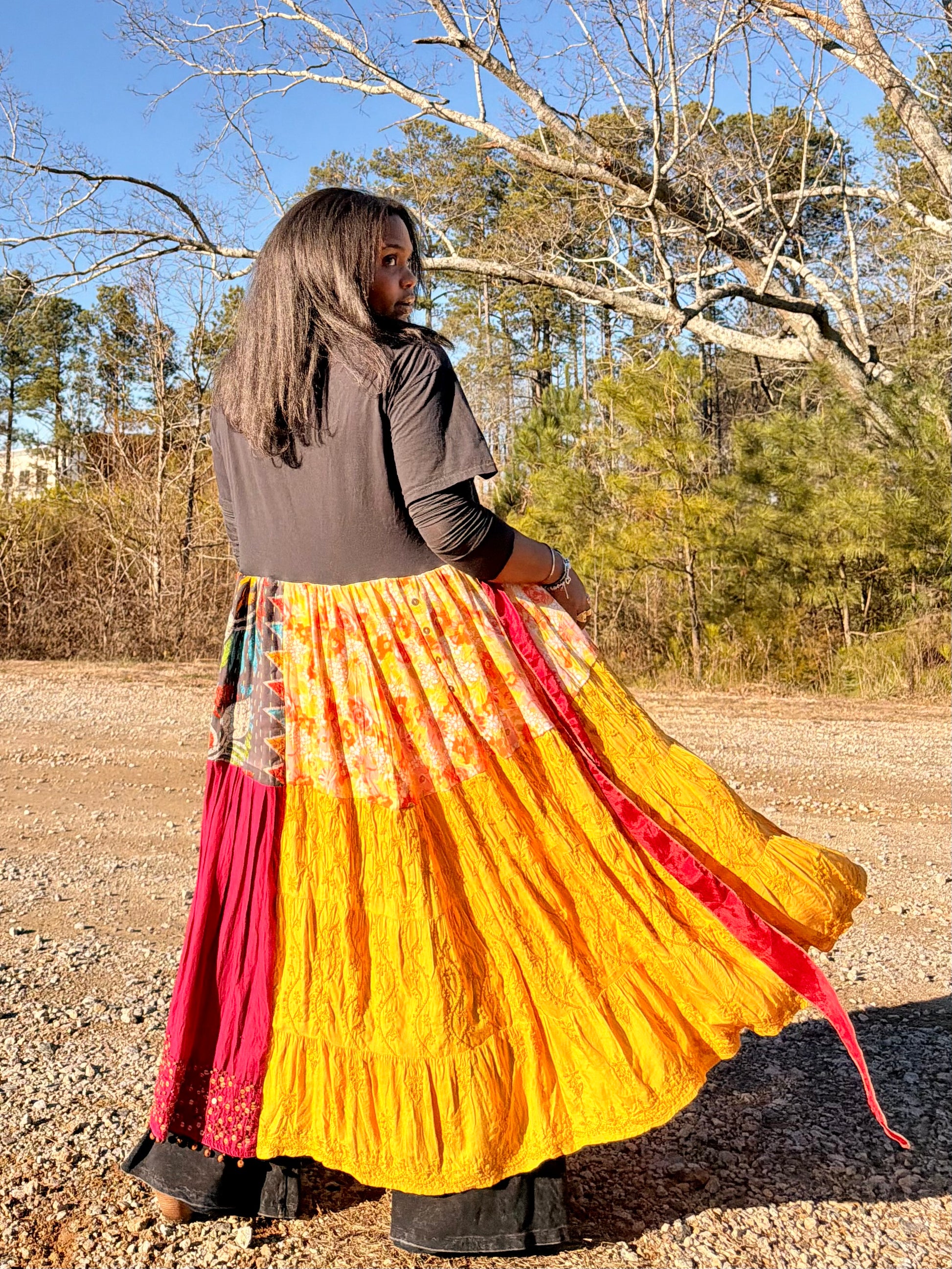 - All fabrics are hand arranged and cut into pieces to make a beautiful skirt.