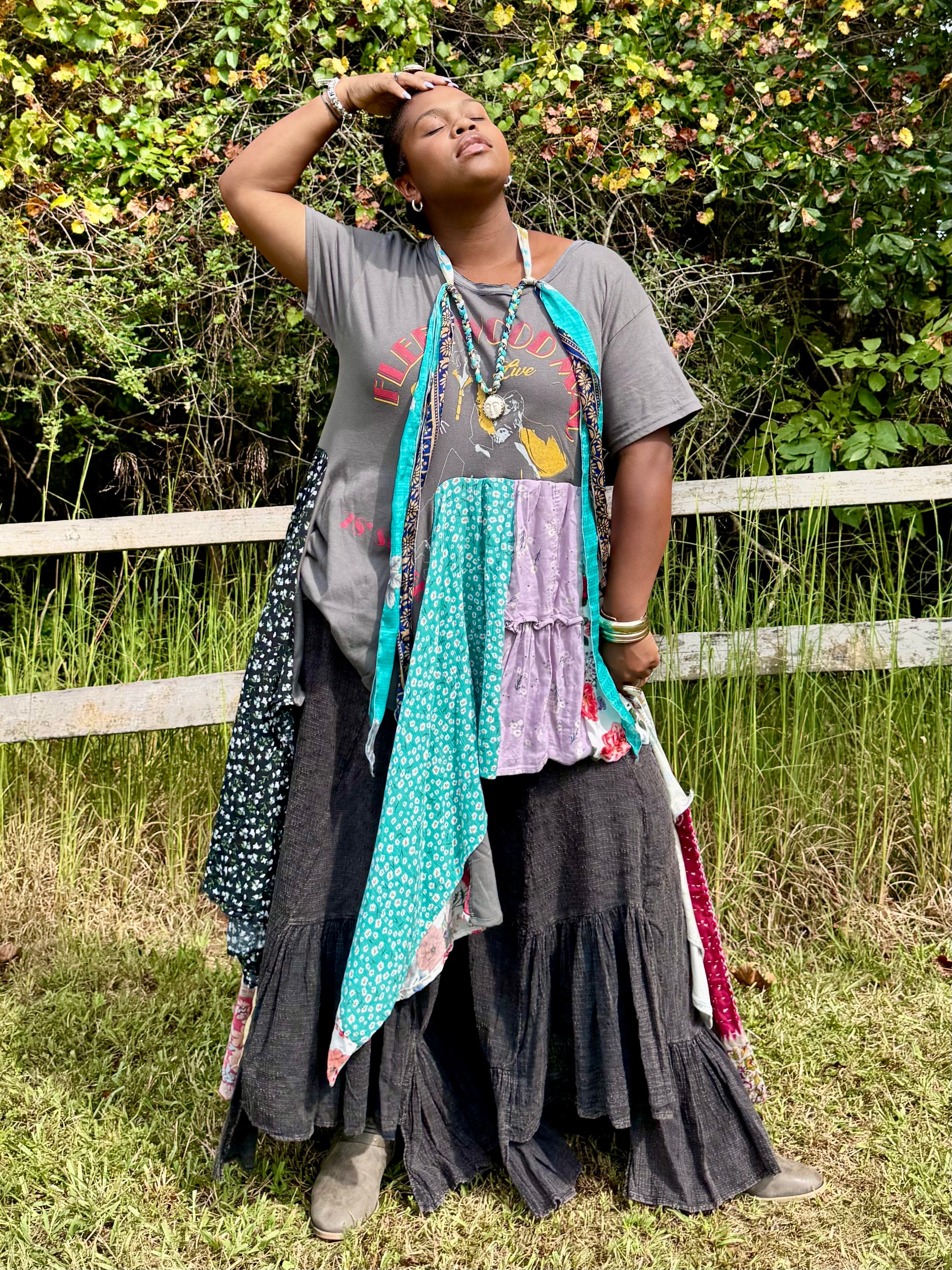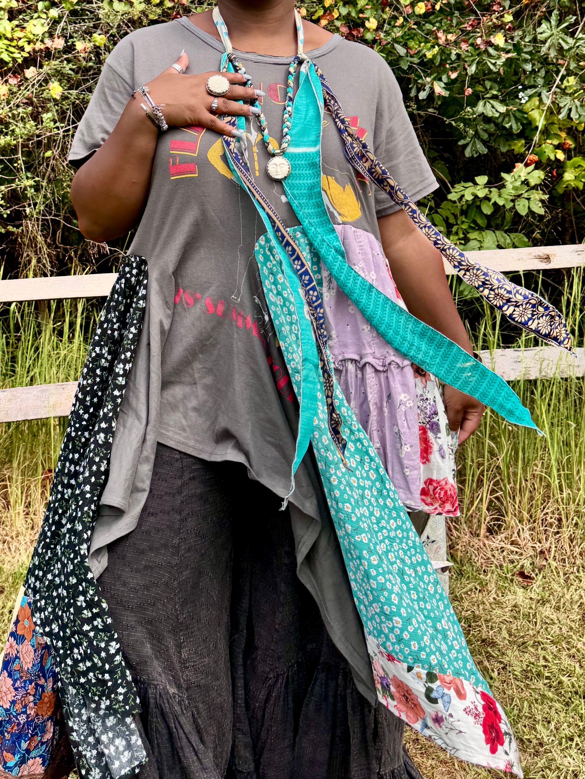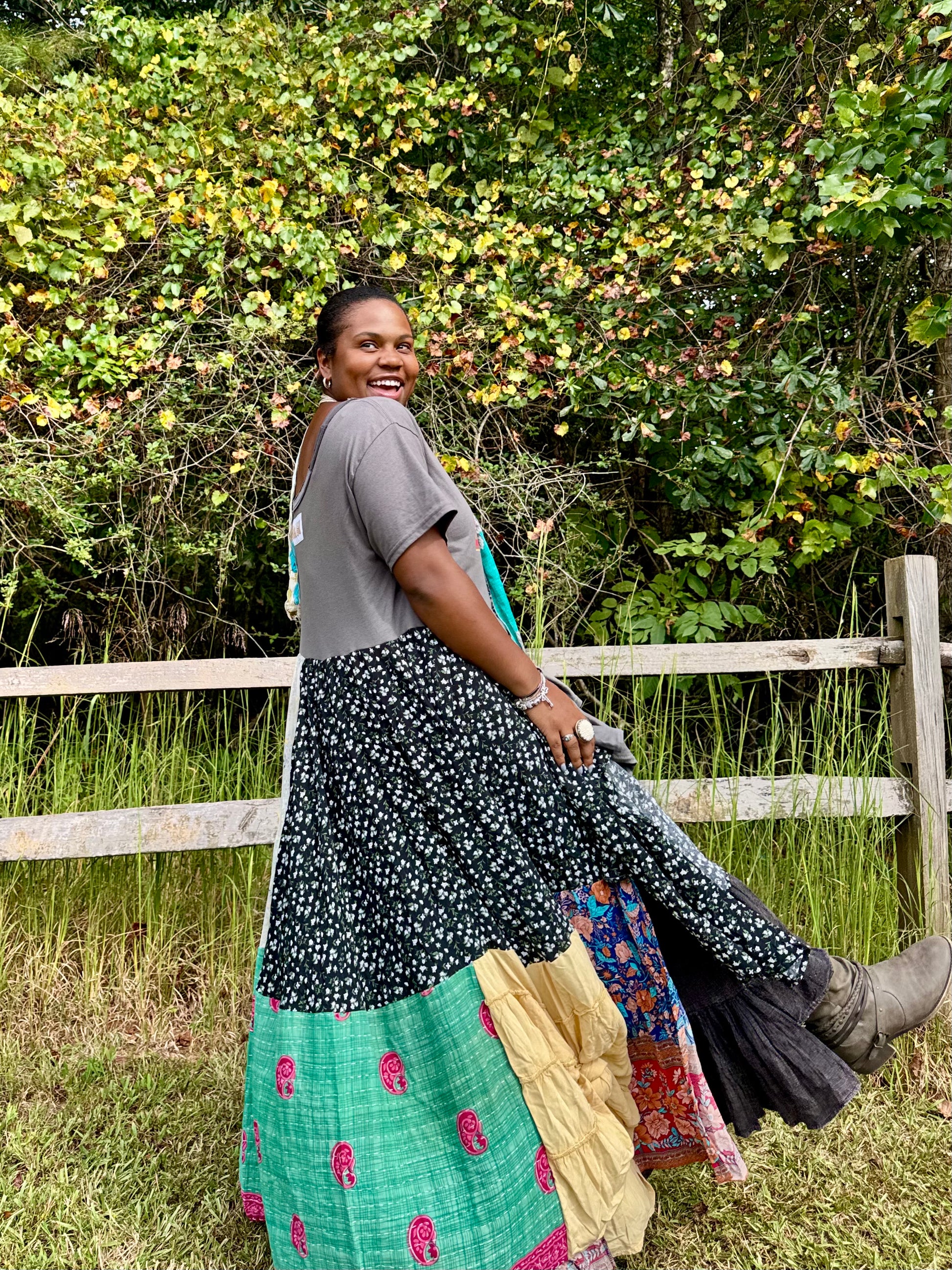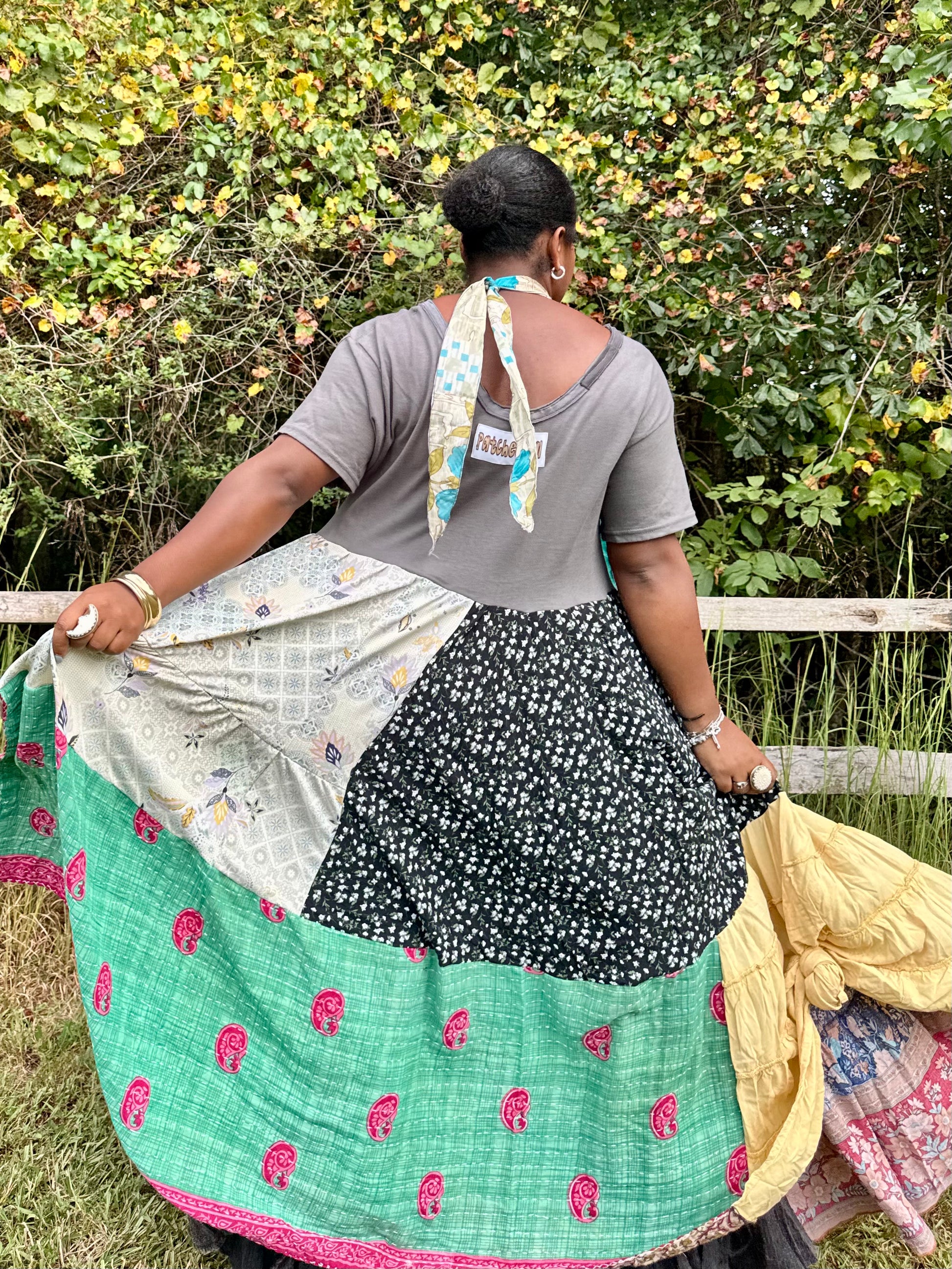- All fabrics are hand arranged and cut into pieces to make a beautiful skirt.
