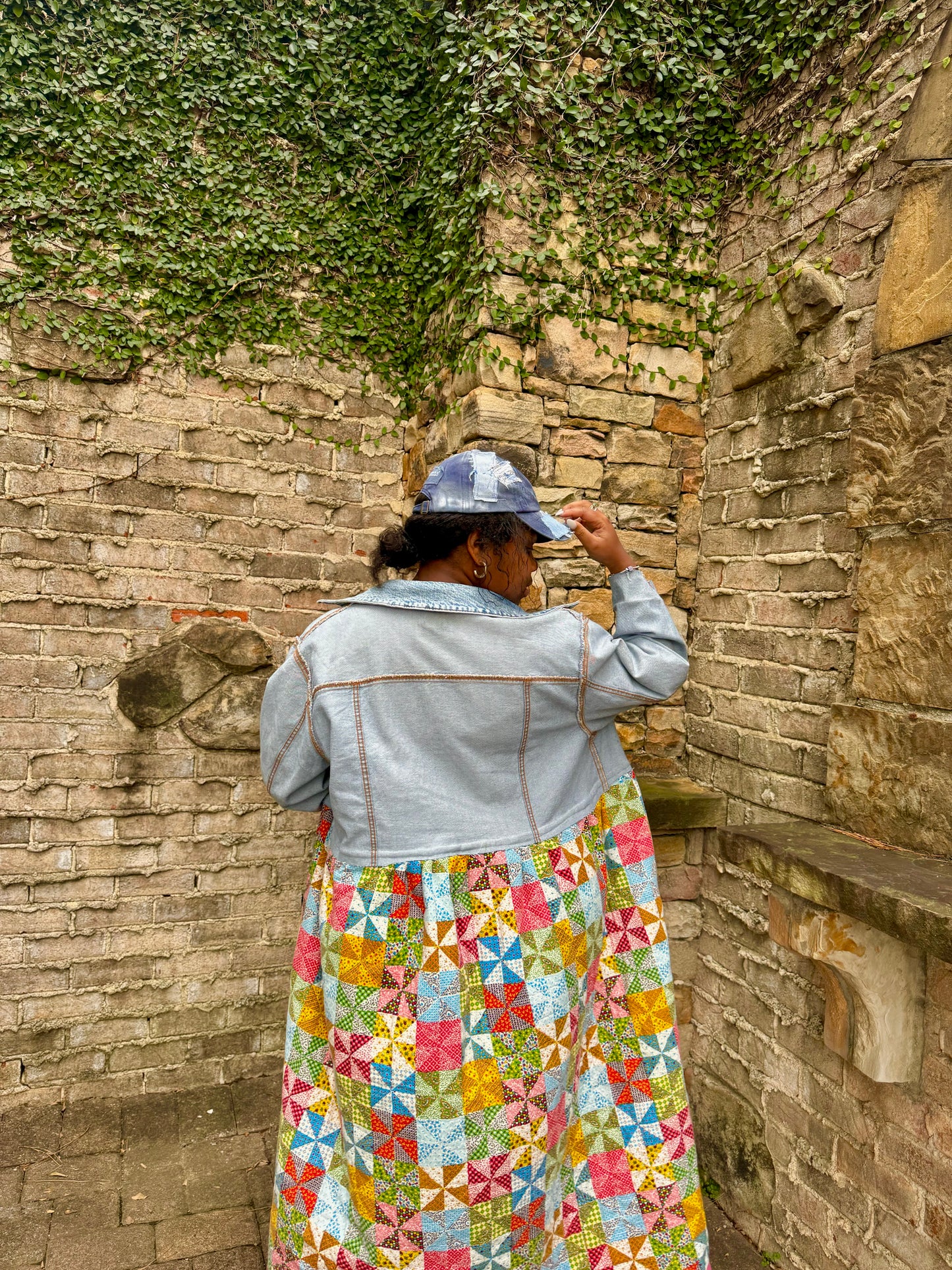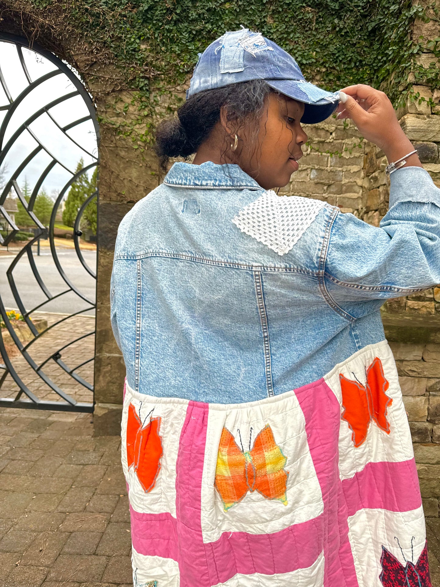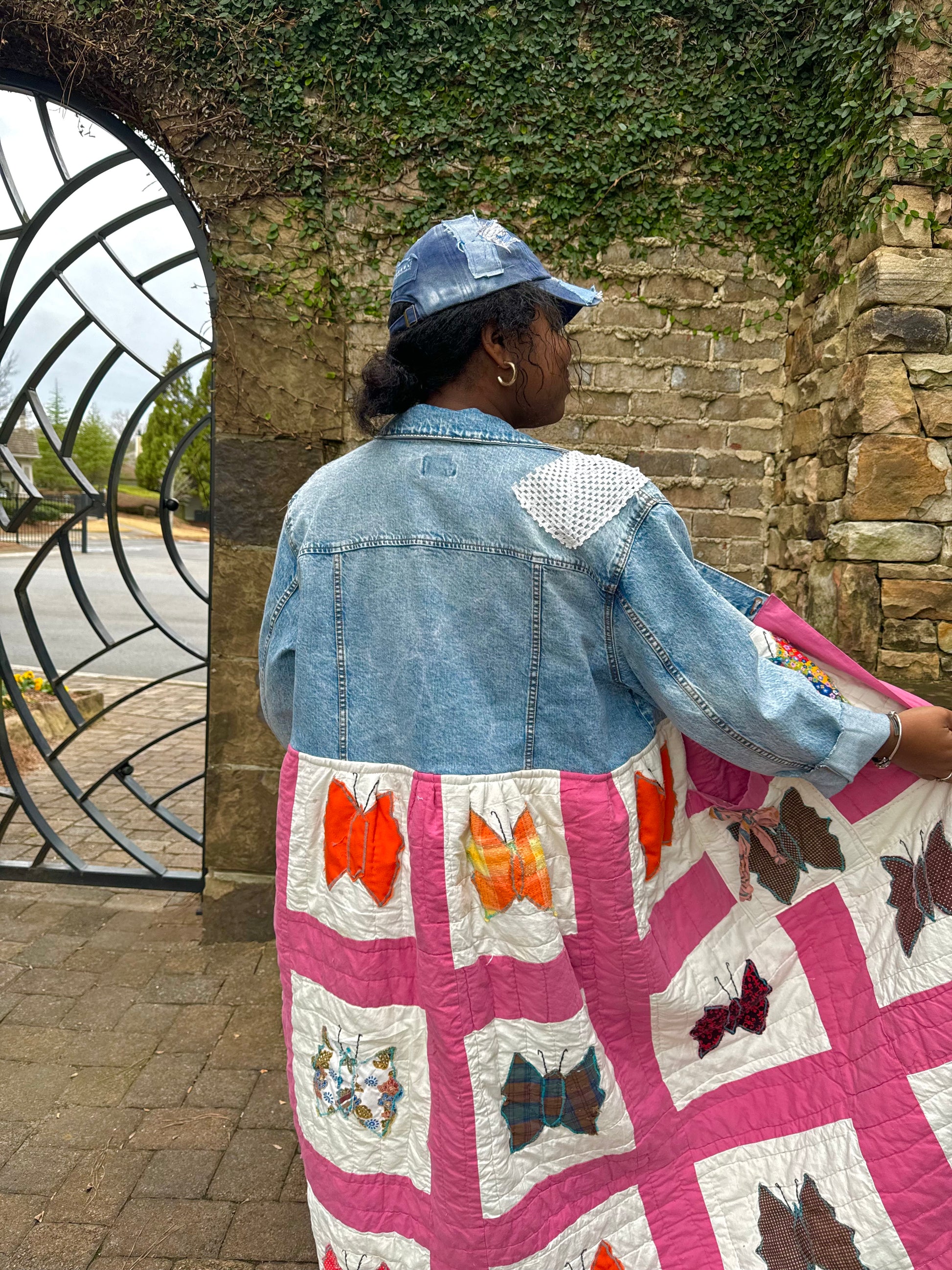- Upcycled from a quilted bedspread and a denim jacket.