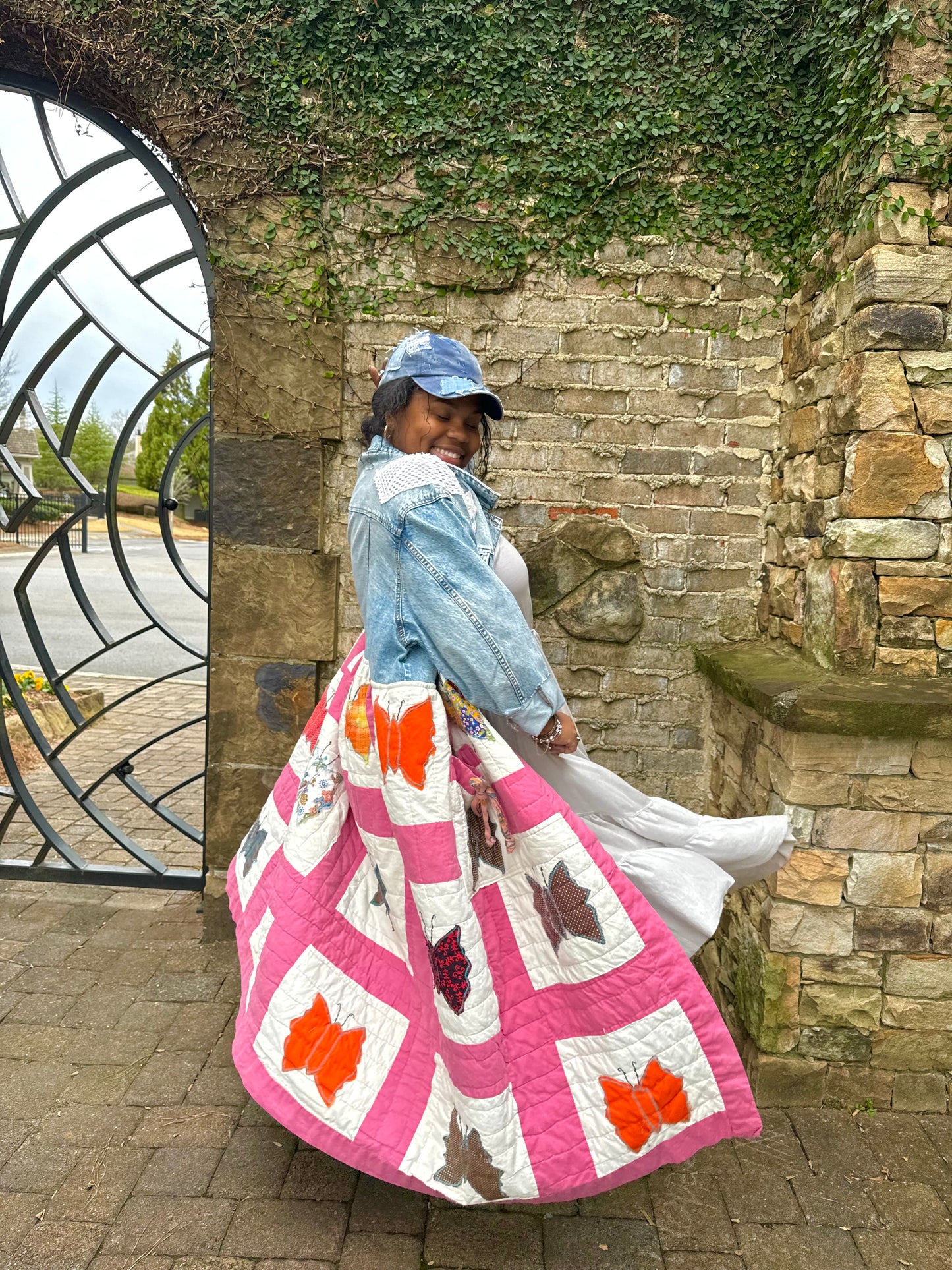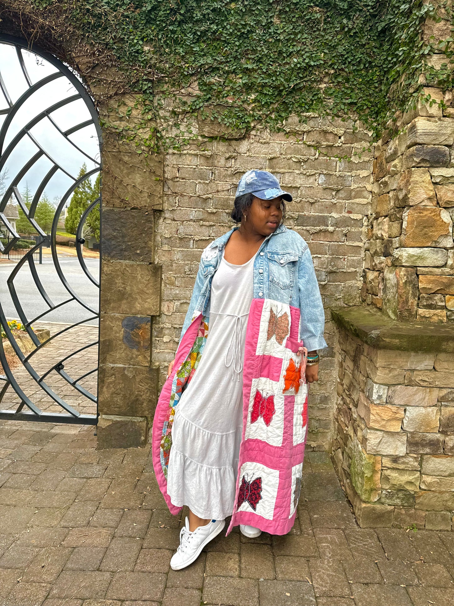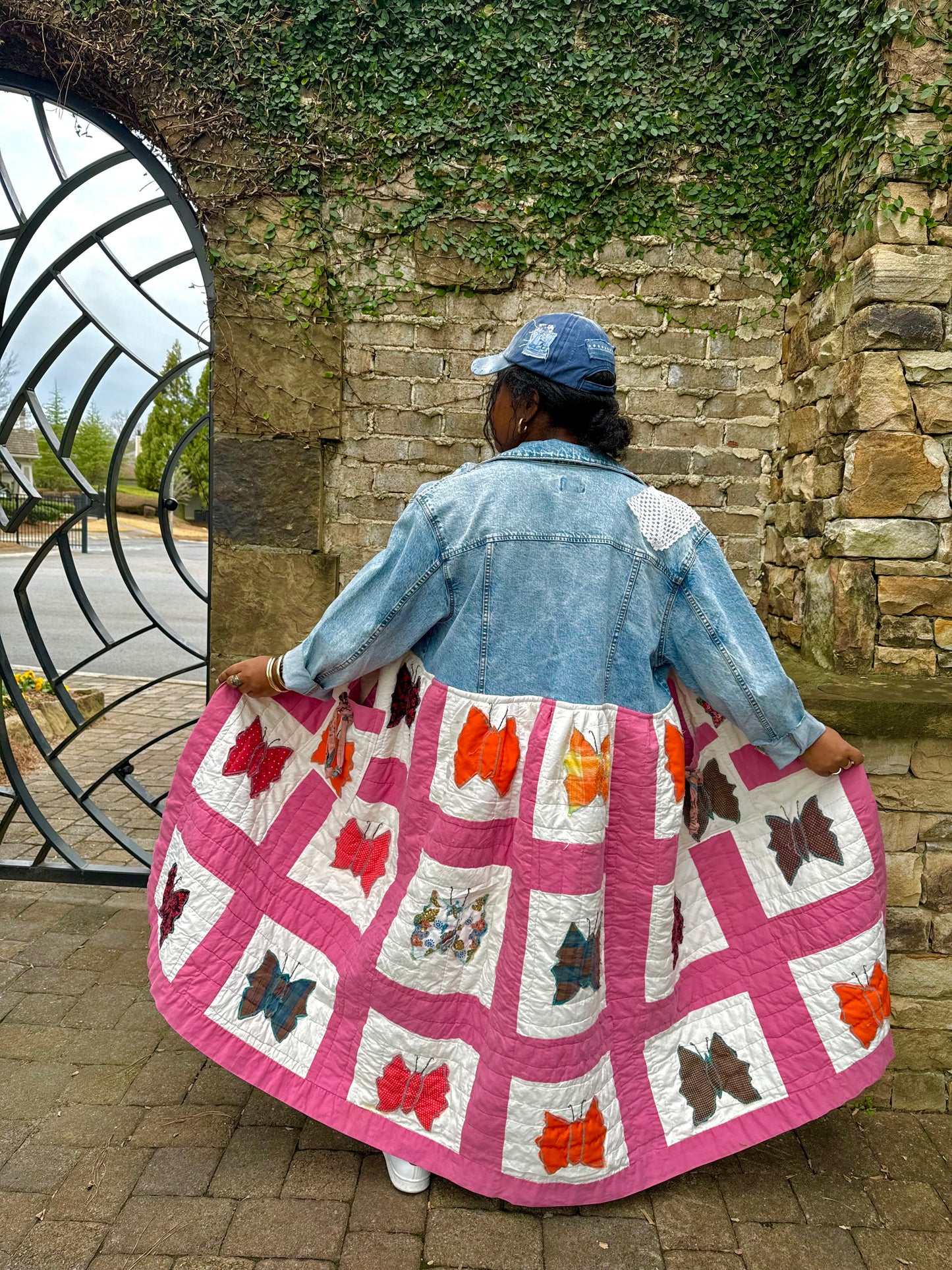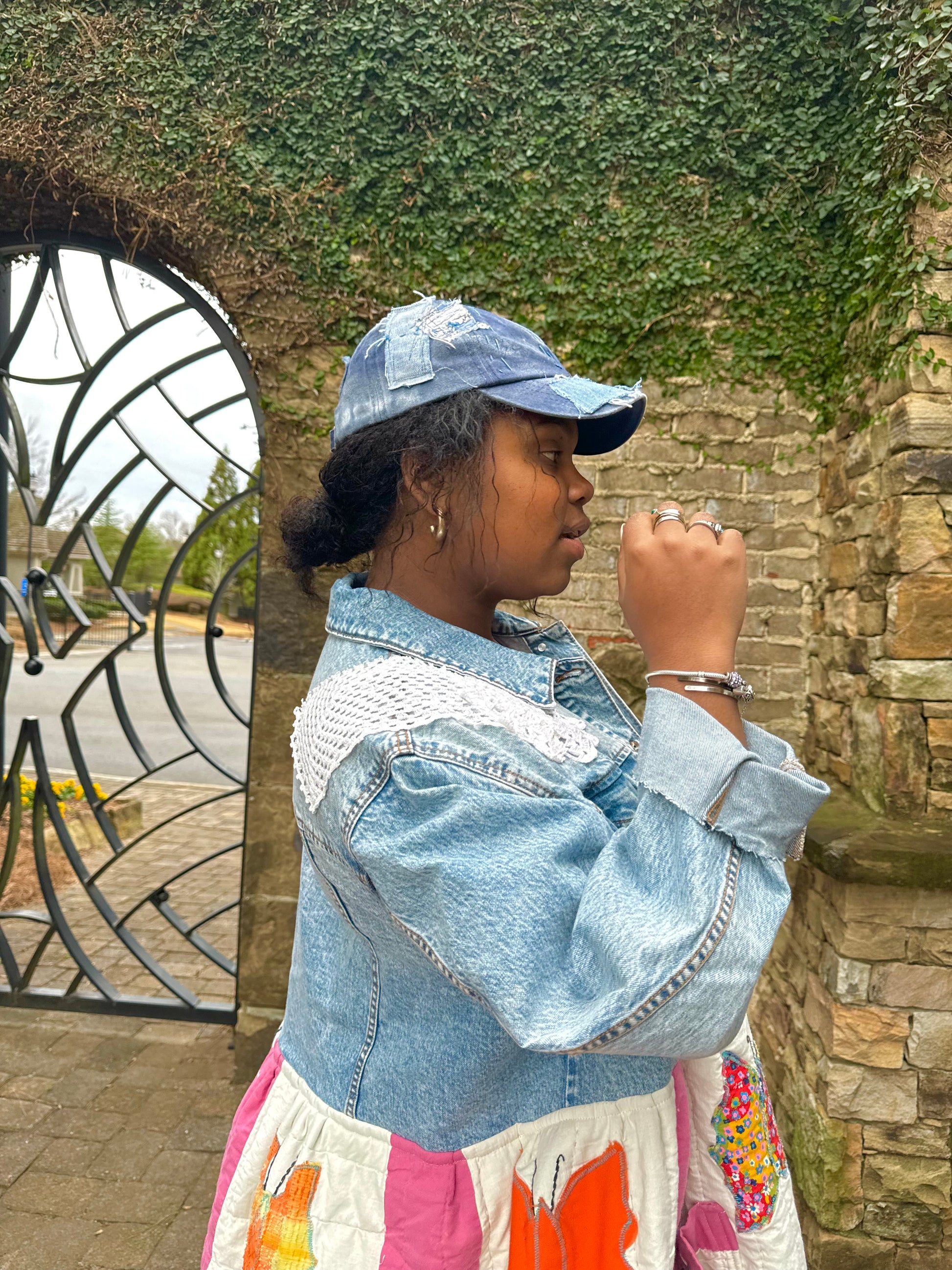 - Upcycled from a quilted bedspread and a denim jacket.