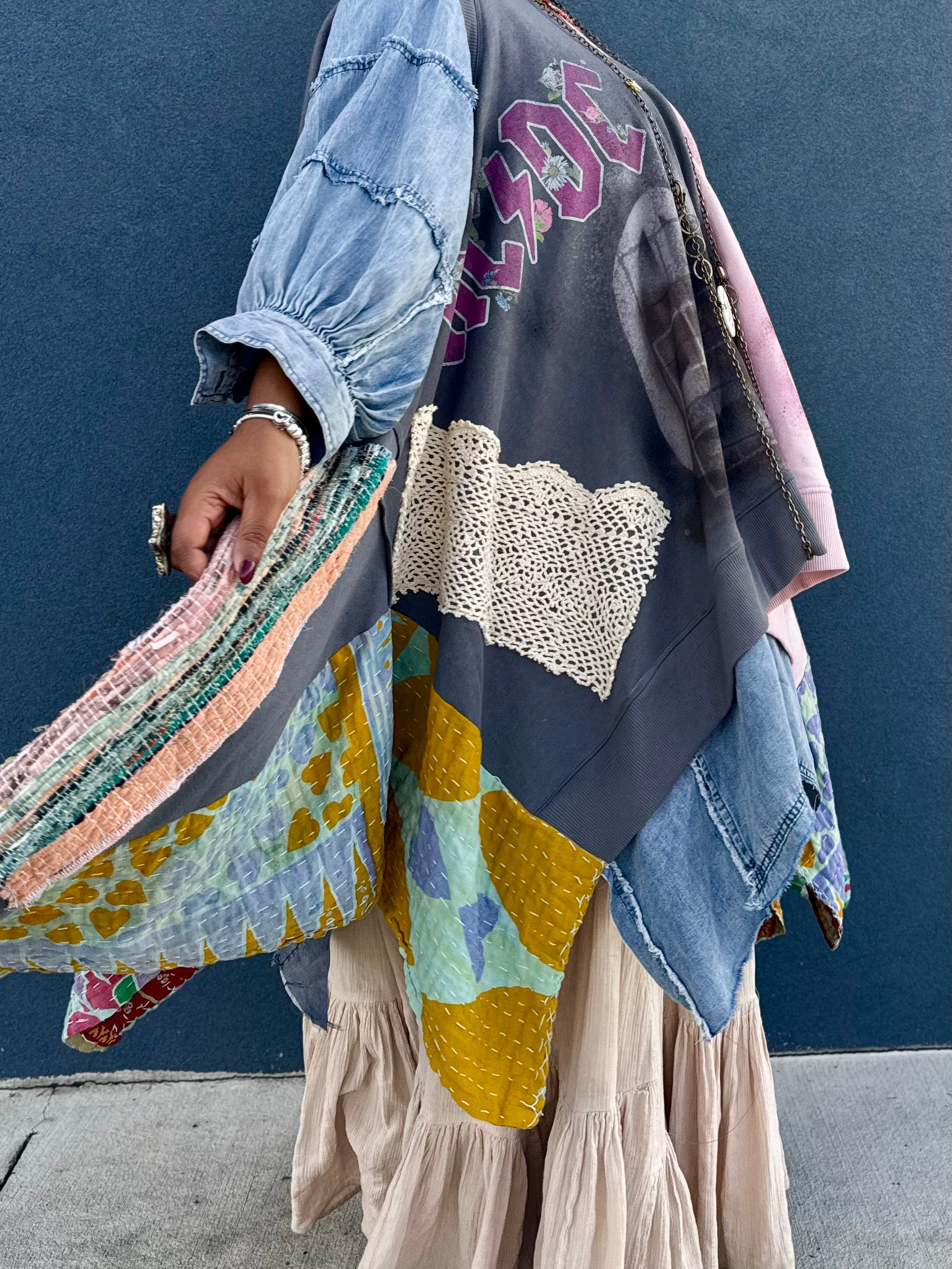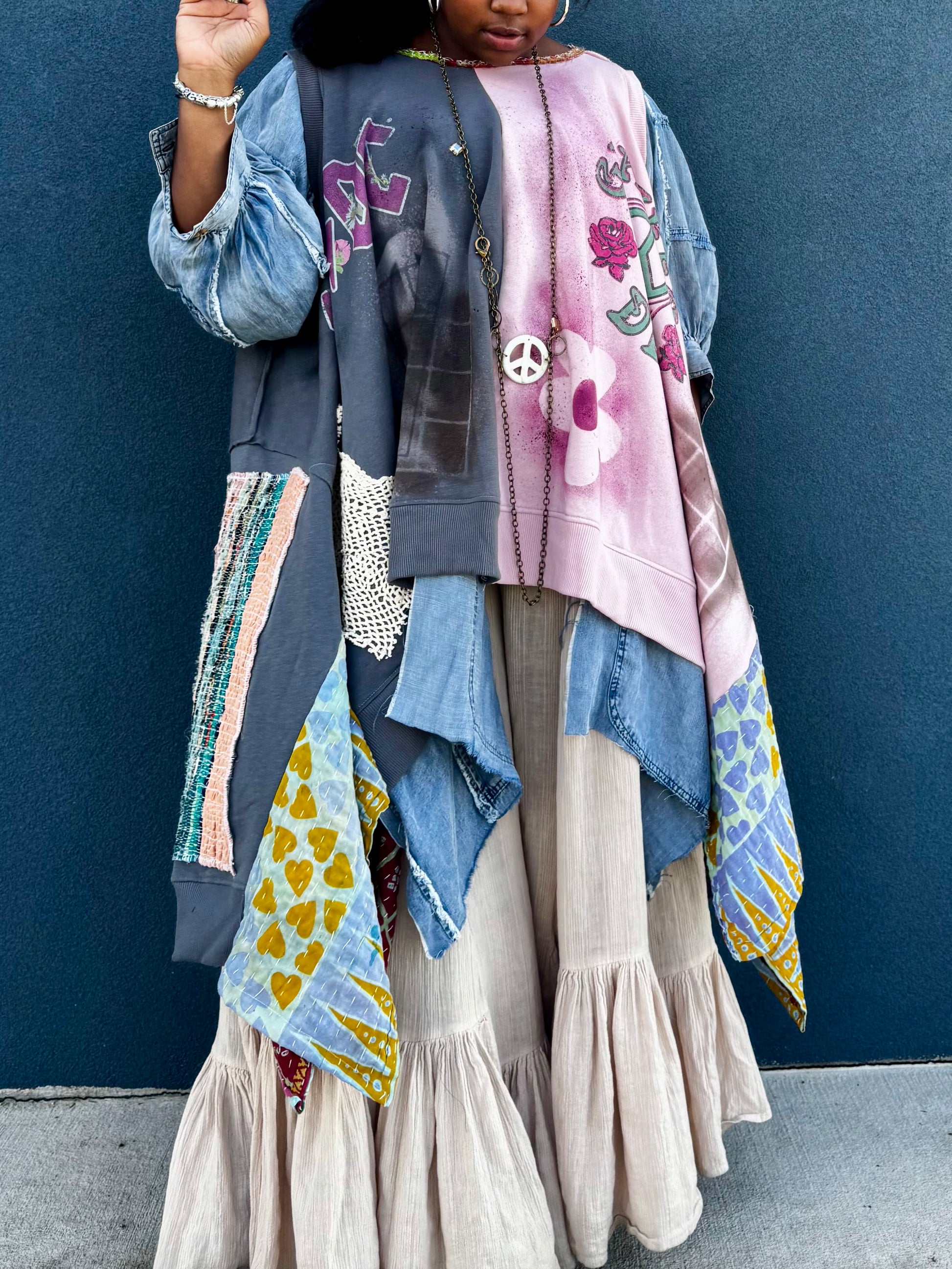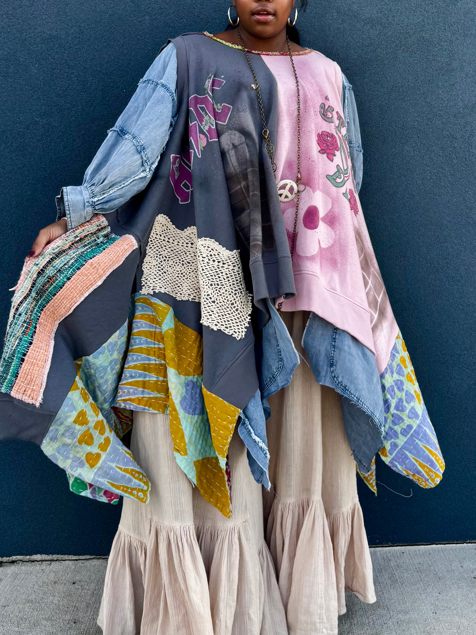 - Upcycled from a zip up jacket, lace doiley's, skirts, and table cloths.