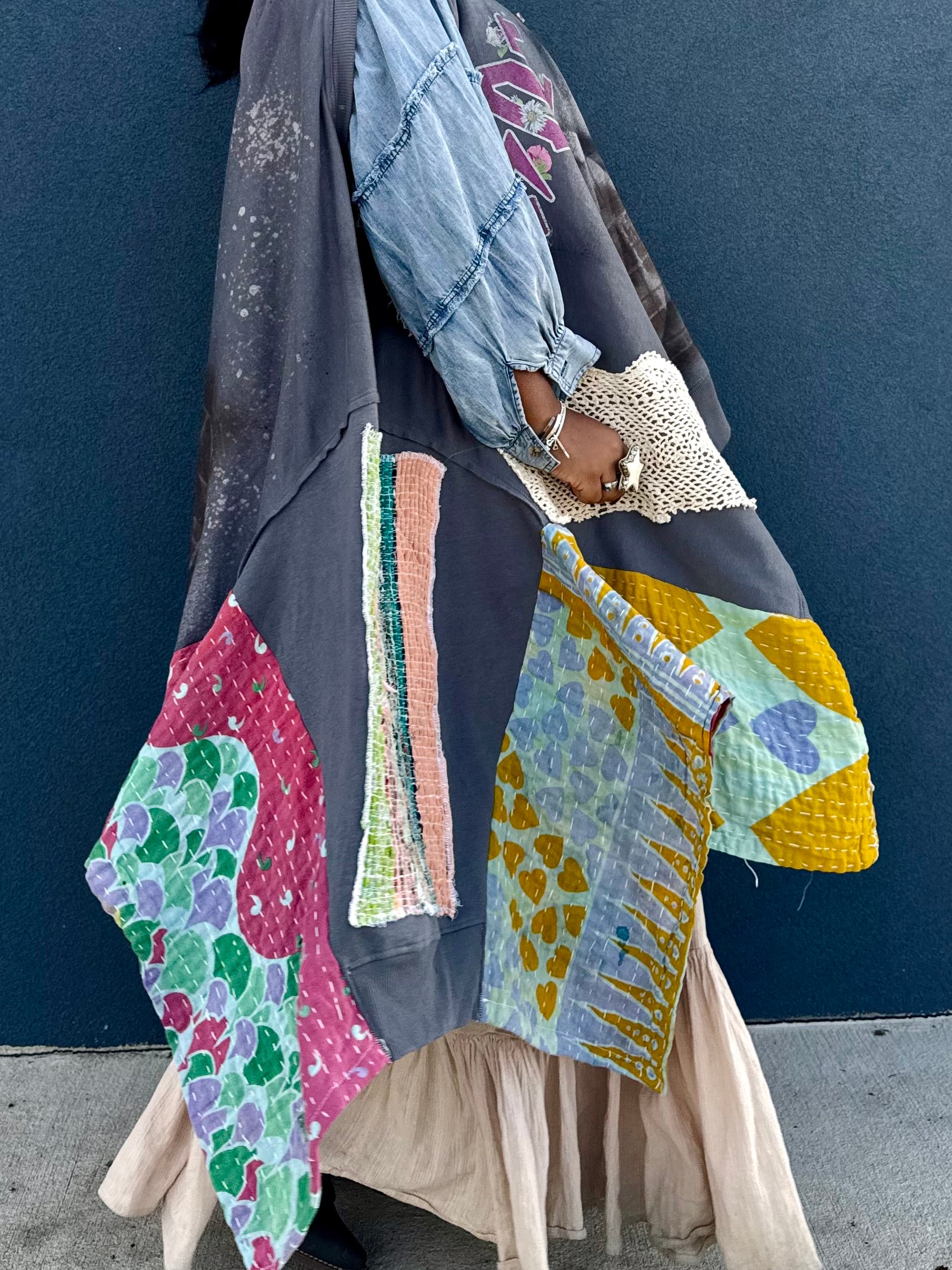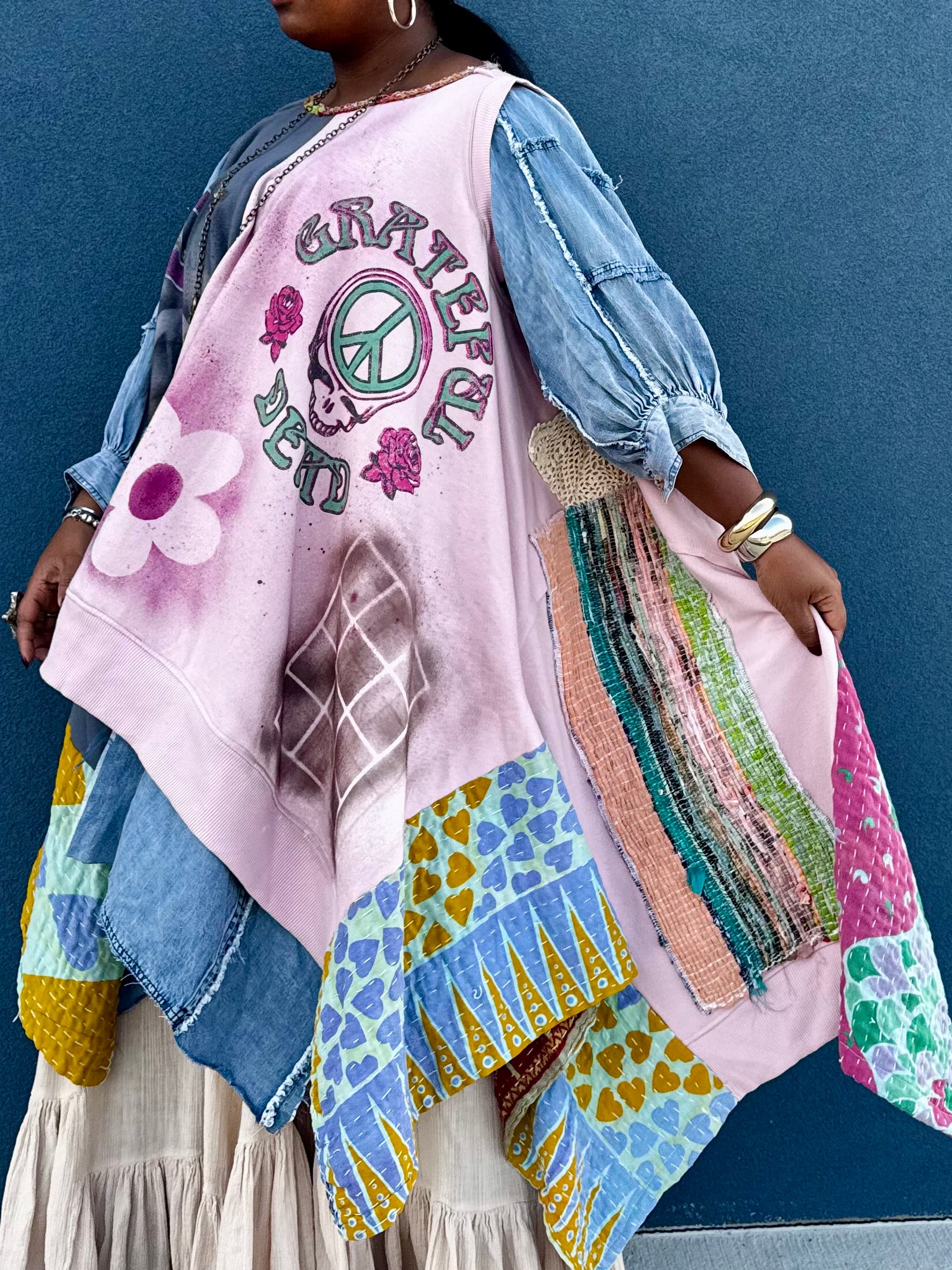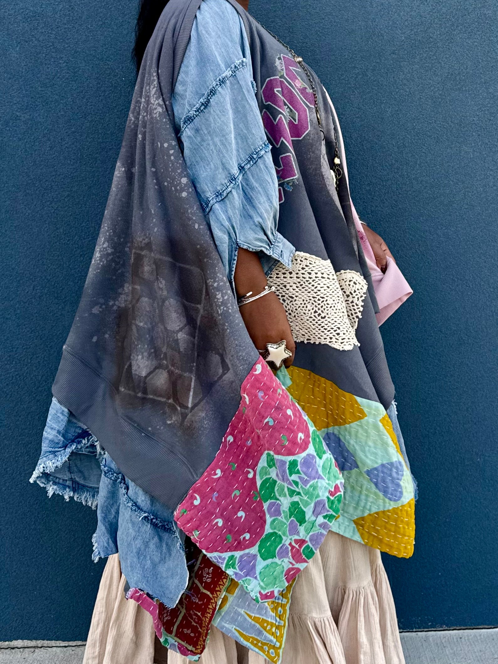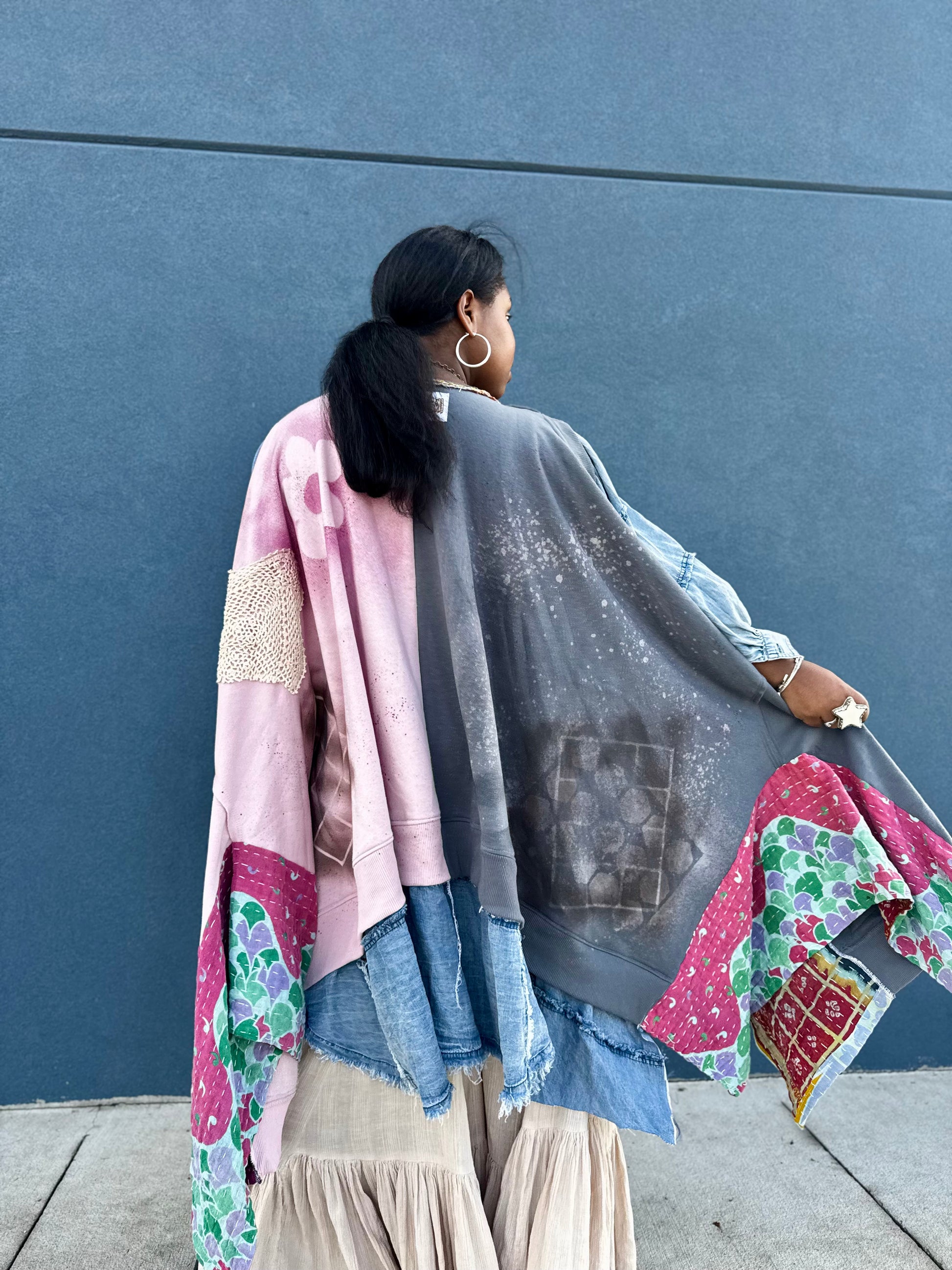 - Upcycled from a zip up jacket, lace doiley's, skirts, and table cloths.