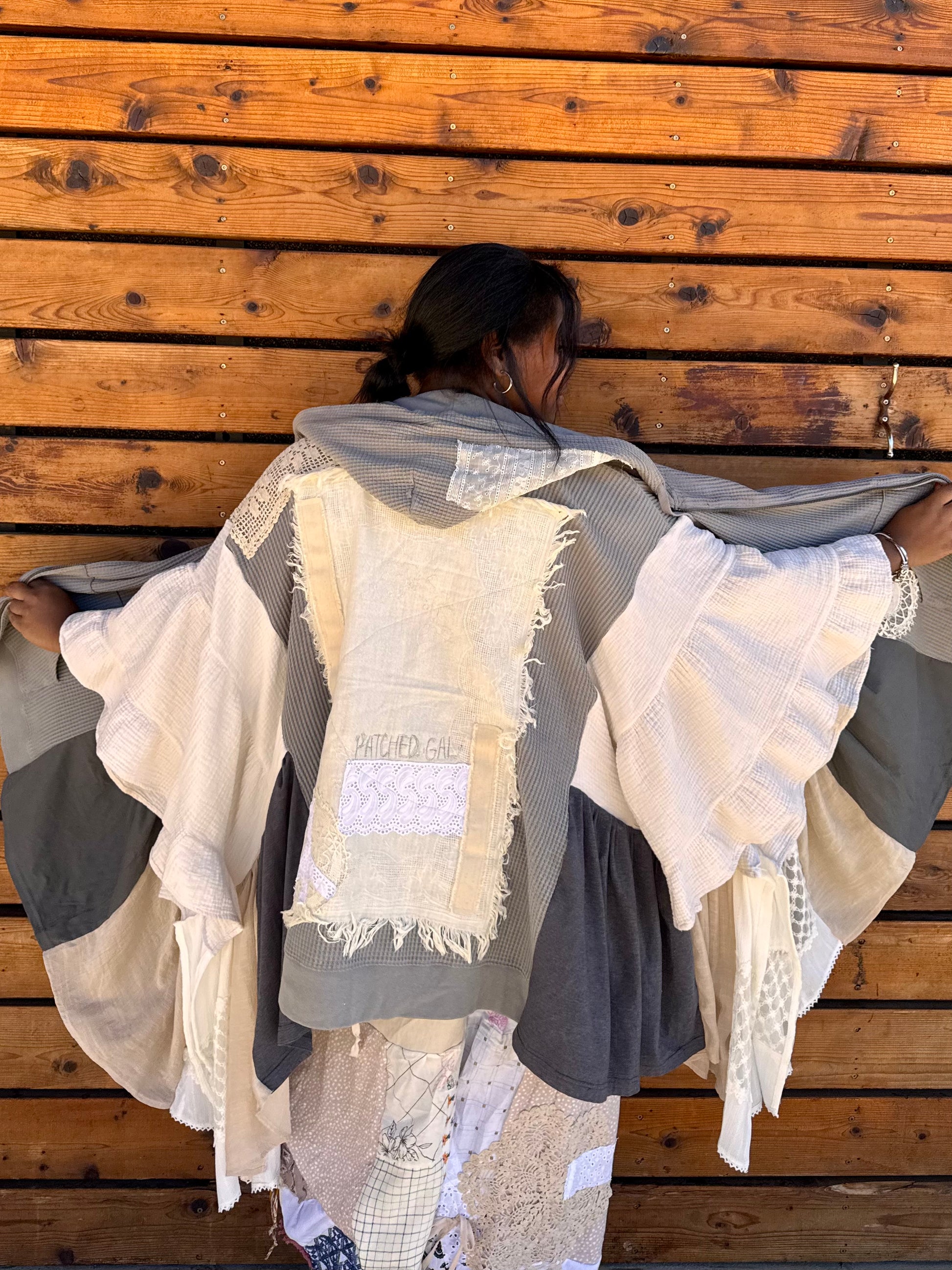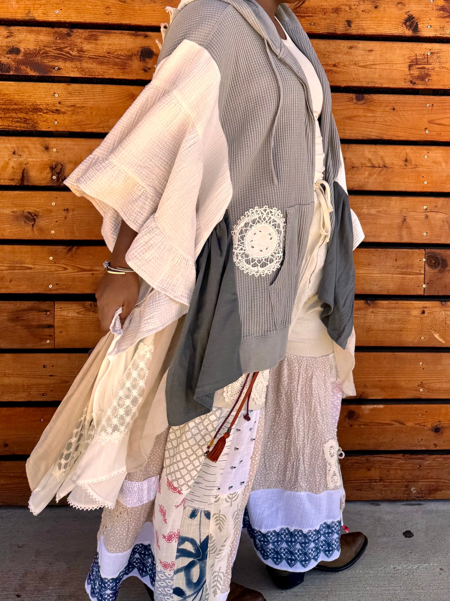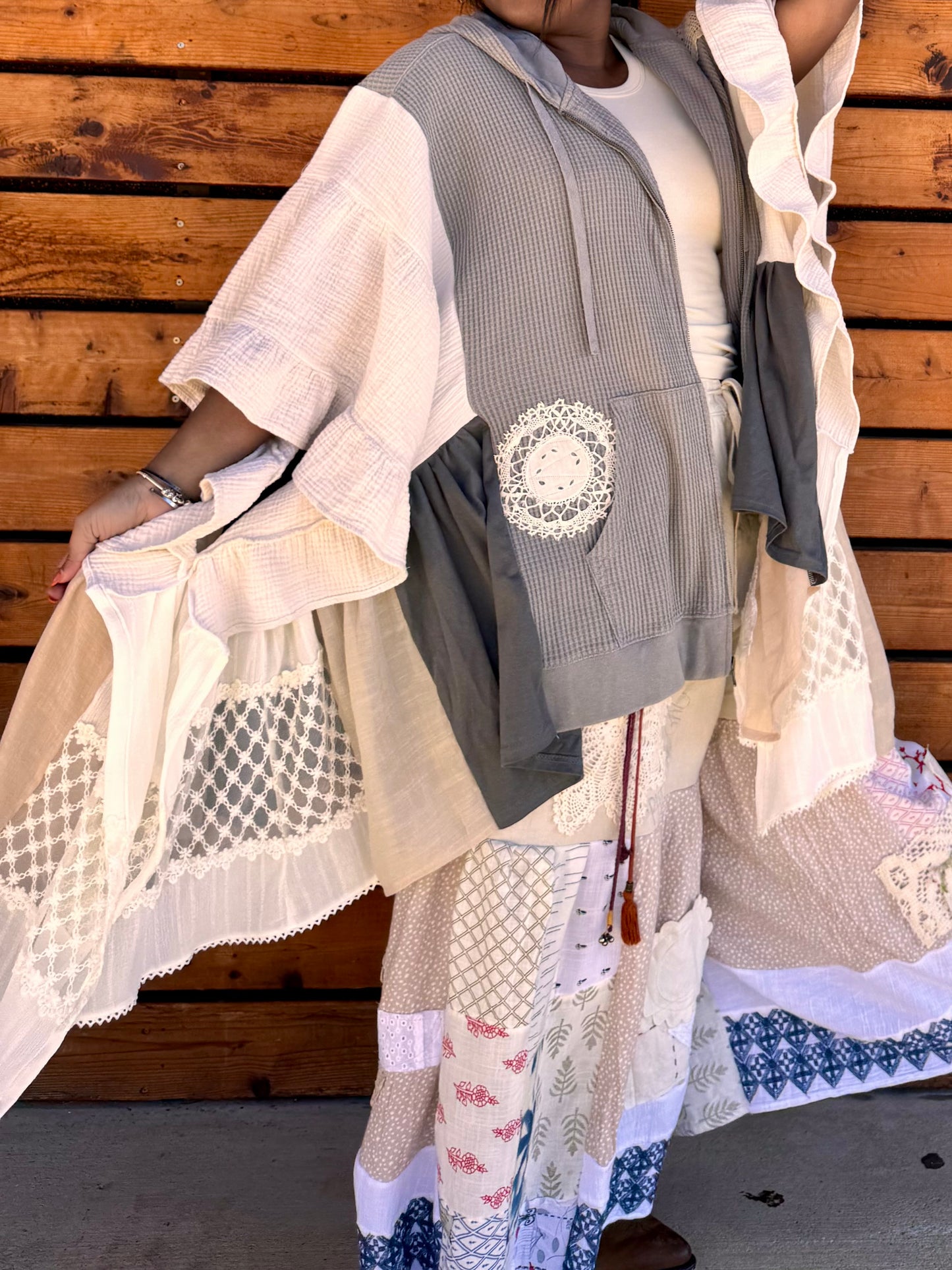 - Upcycled from a zip up jacket, lace doiley's, skirts, and table cloths.