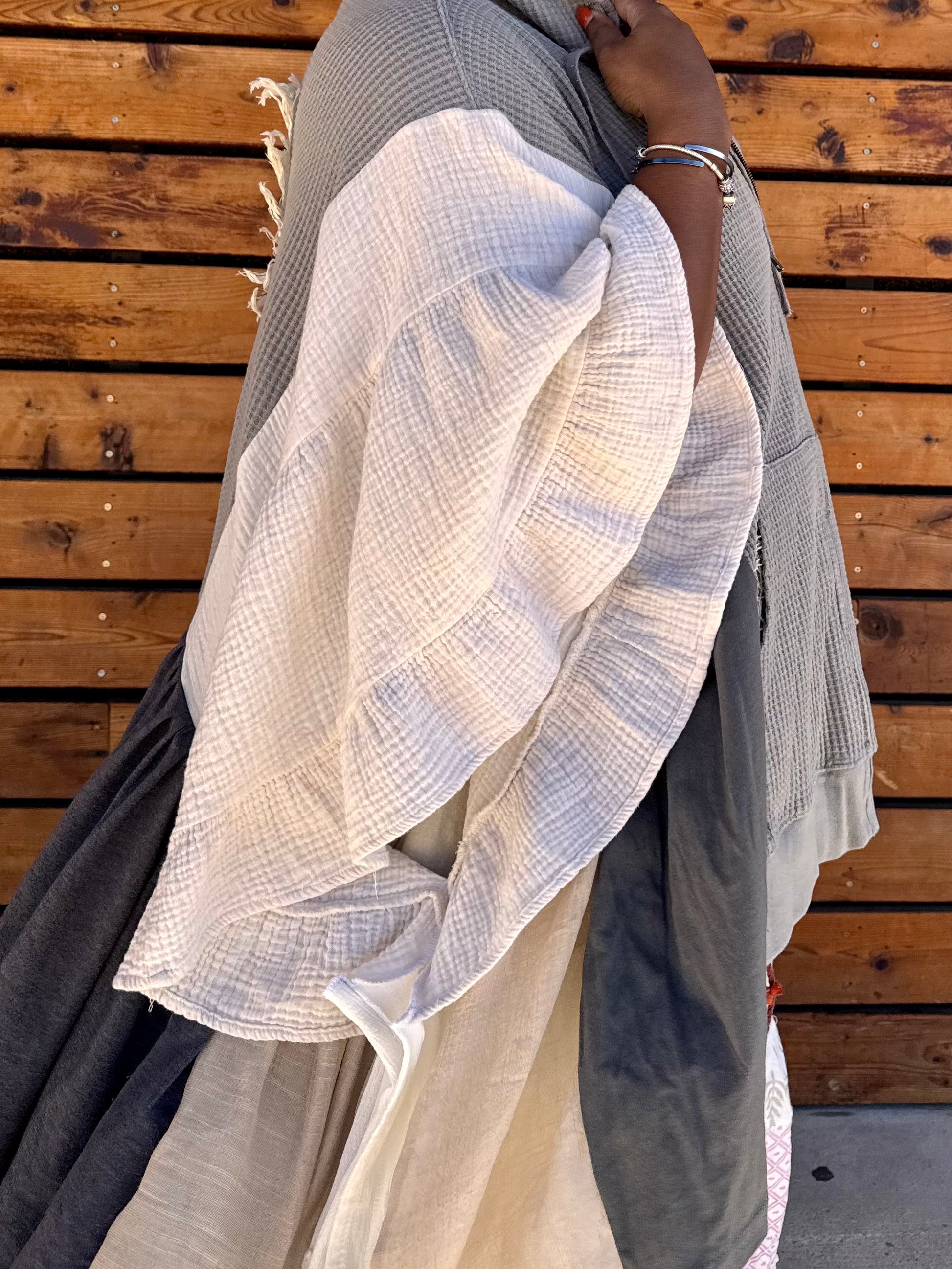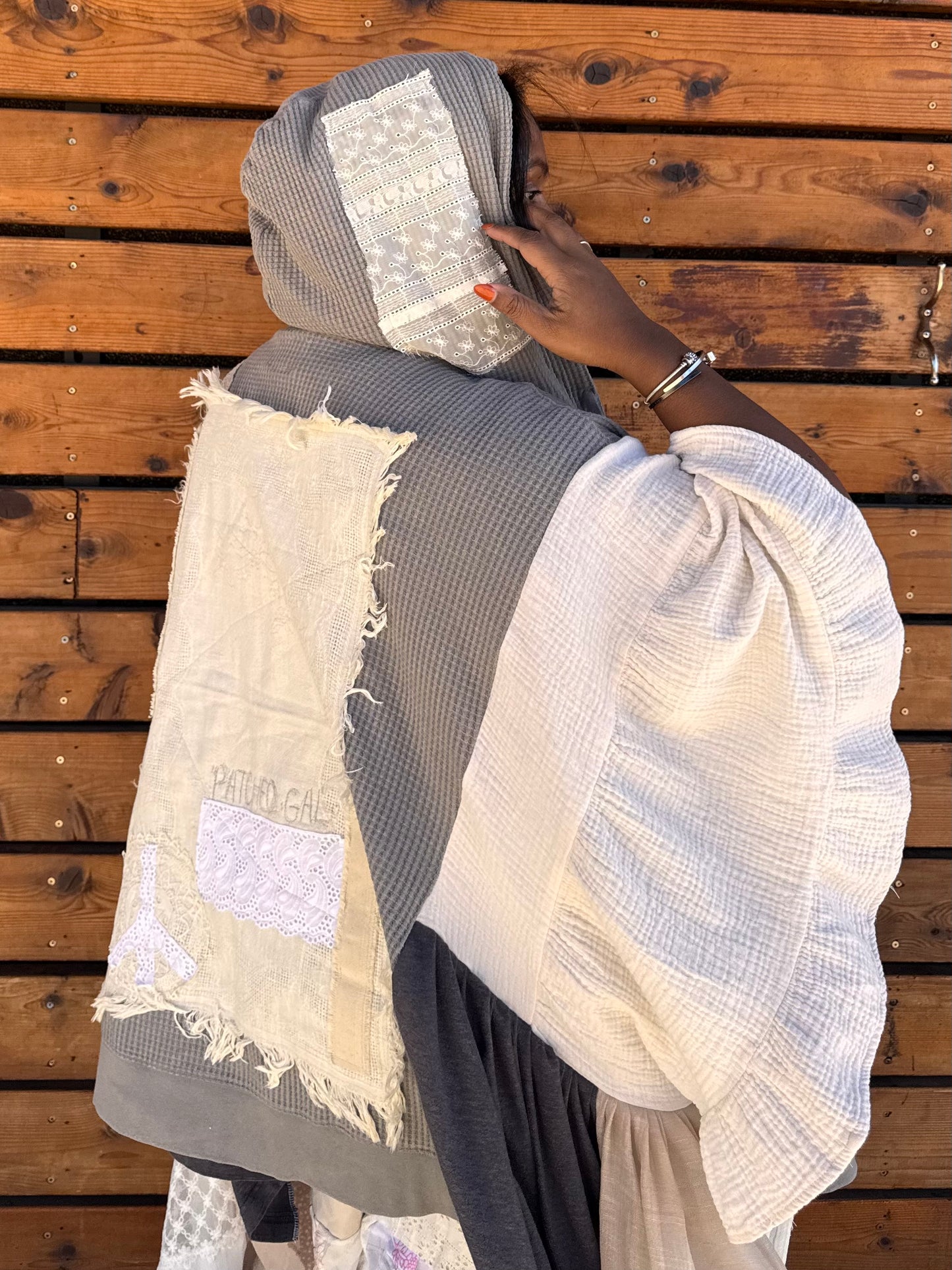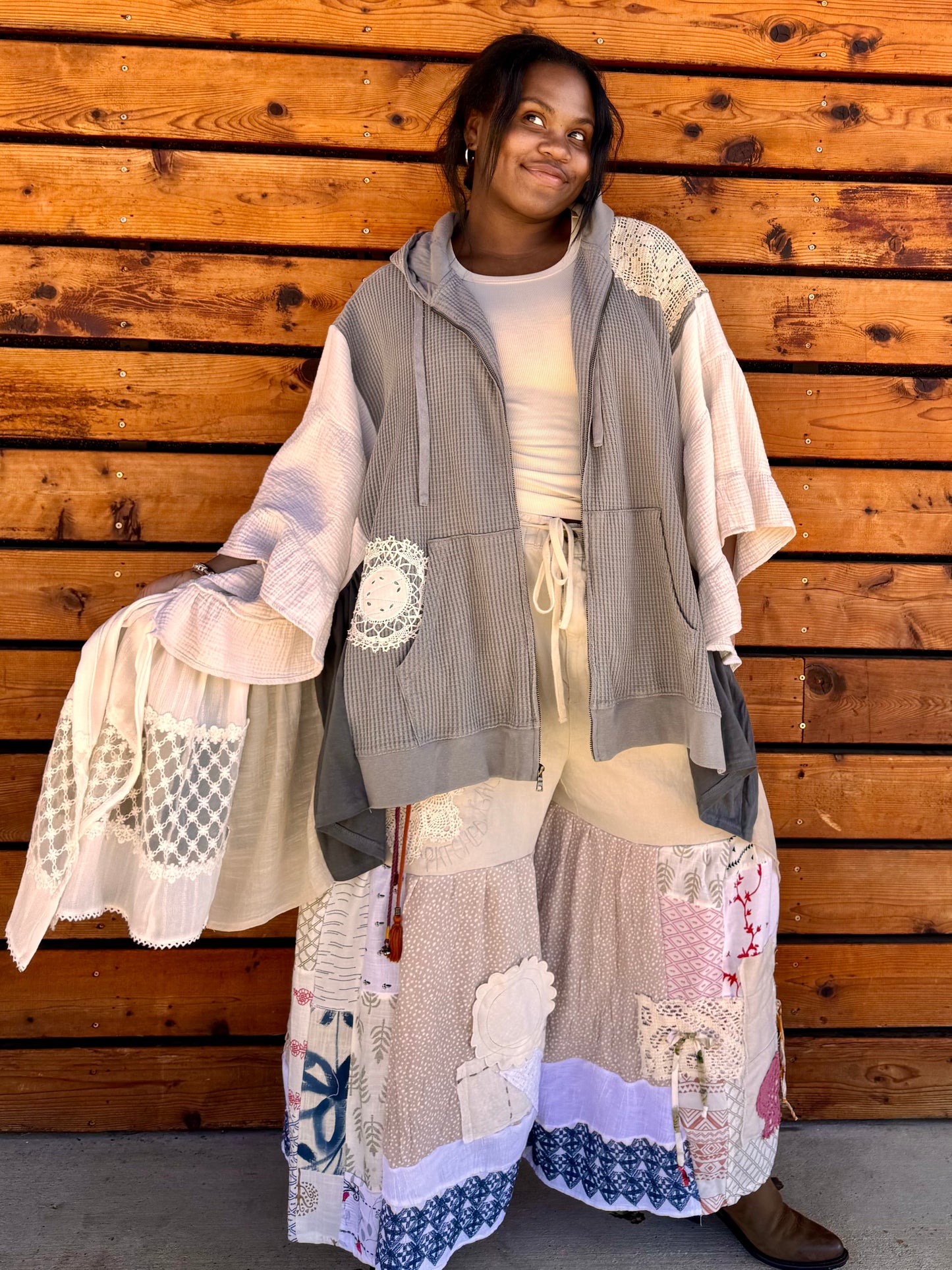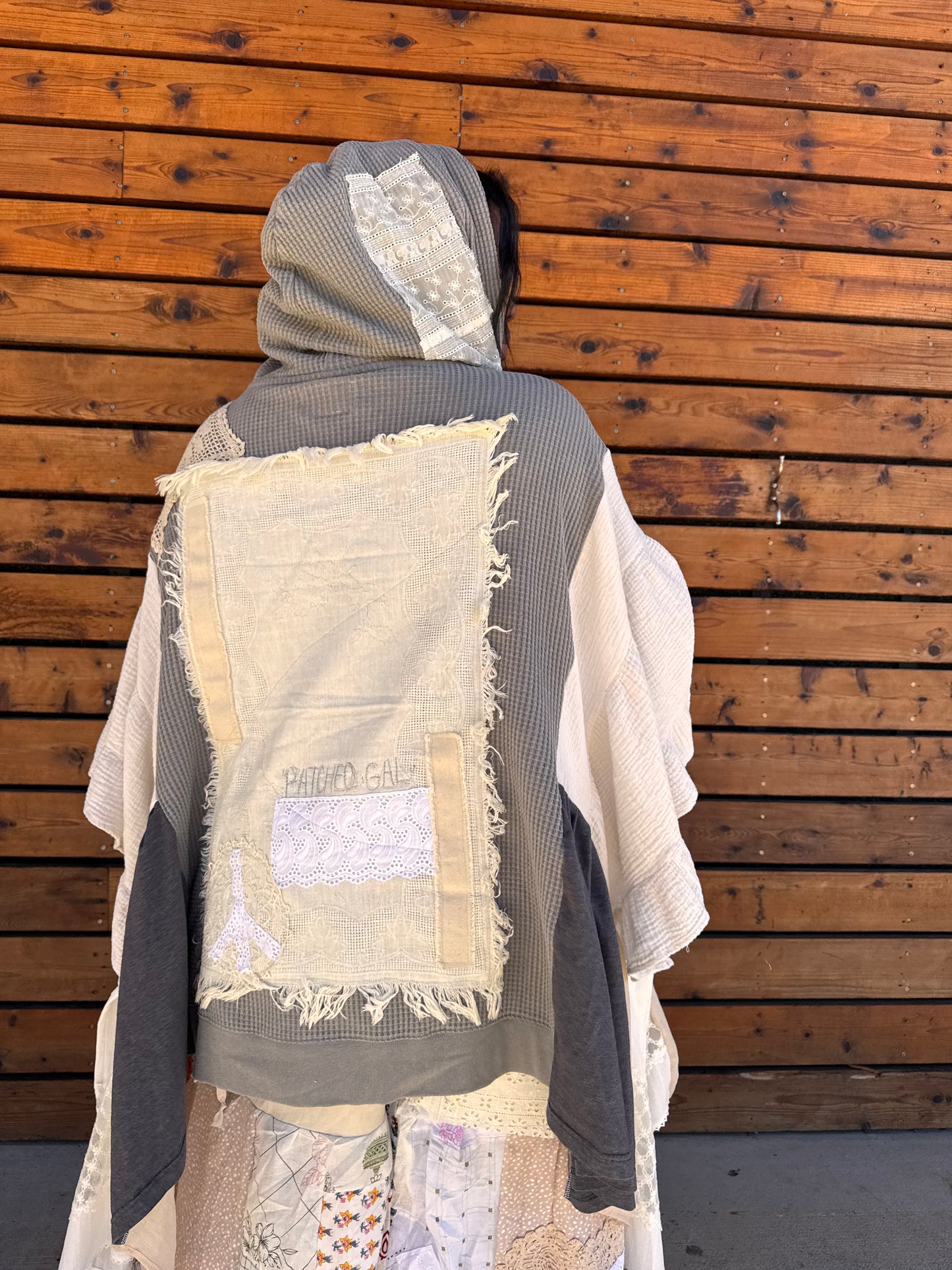 - Upcycled from a zip up jacket, lace doiley's, skirts, and table cloths.