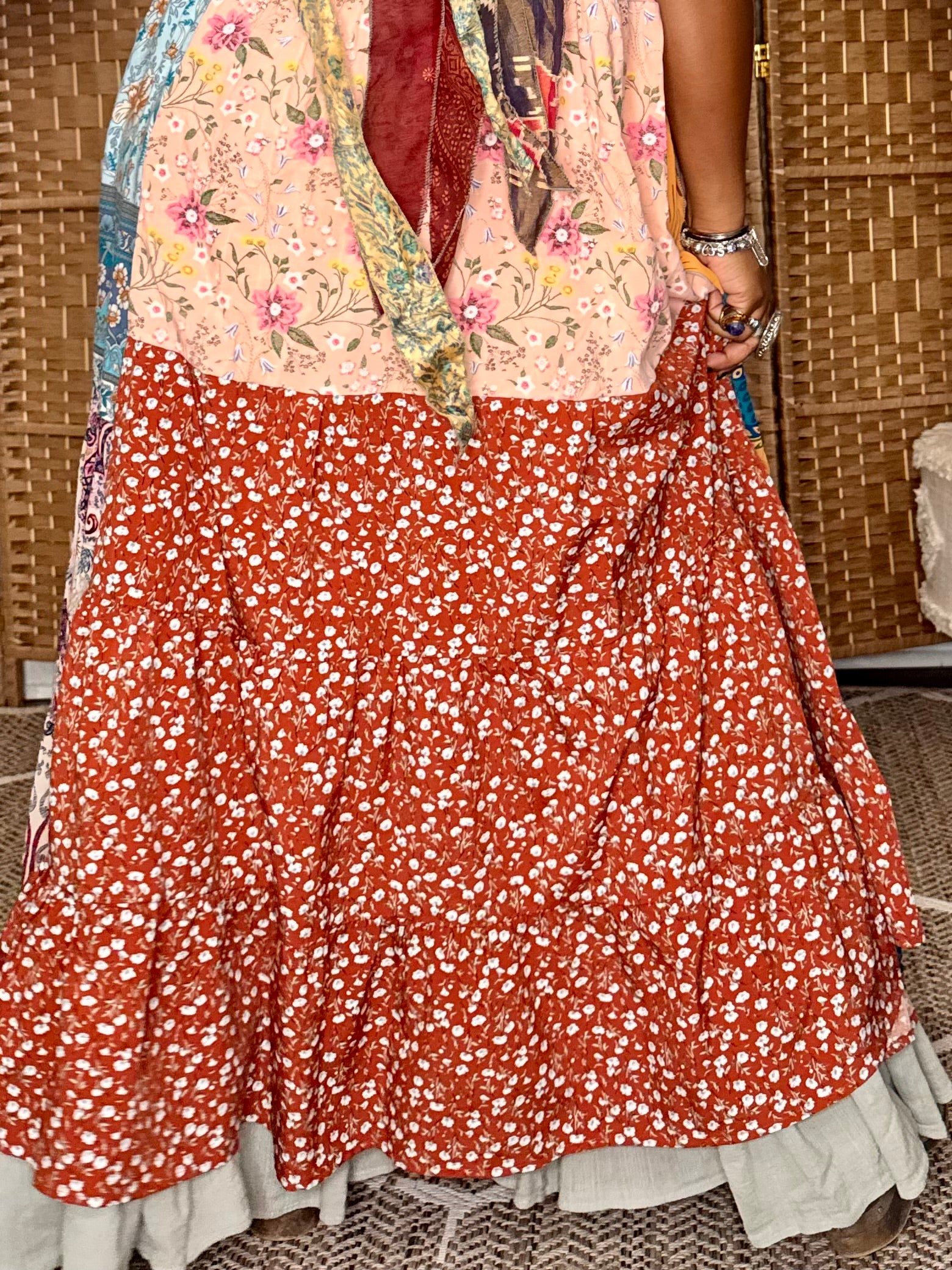 - All fabrics are hand arranged and cut into pieces to make a beautiful skirt.