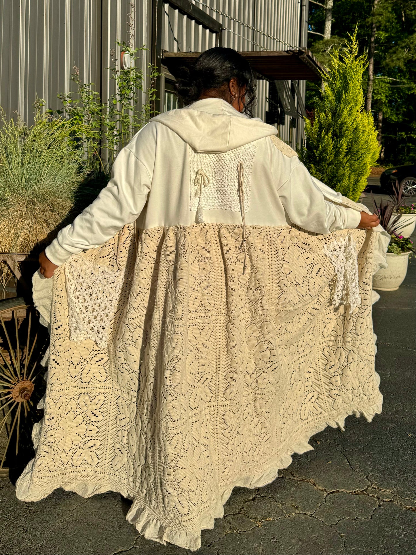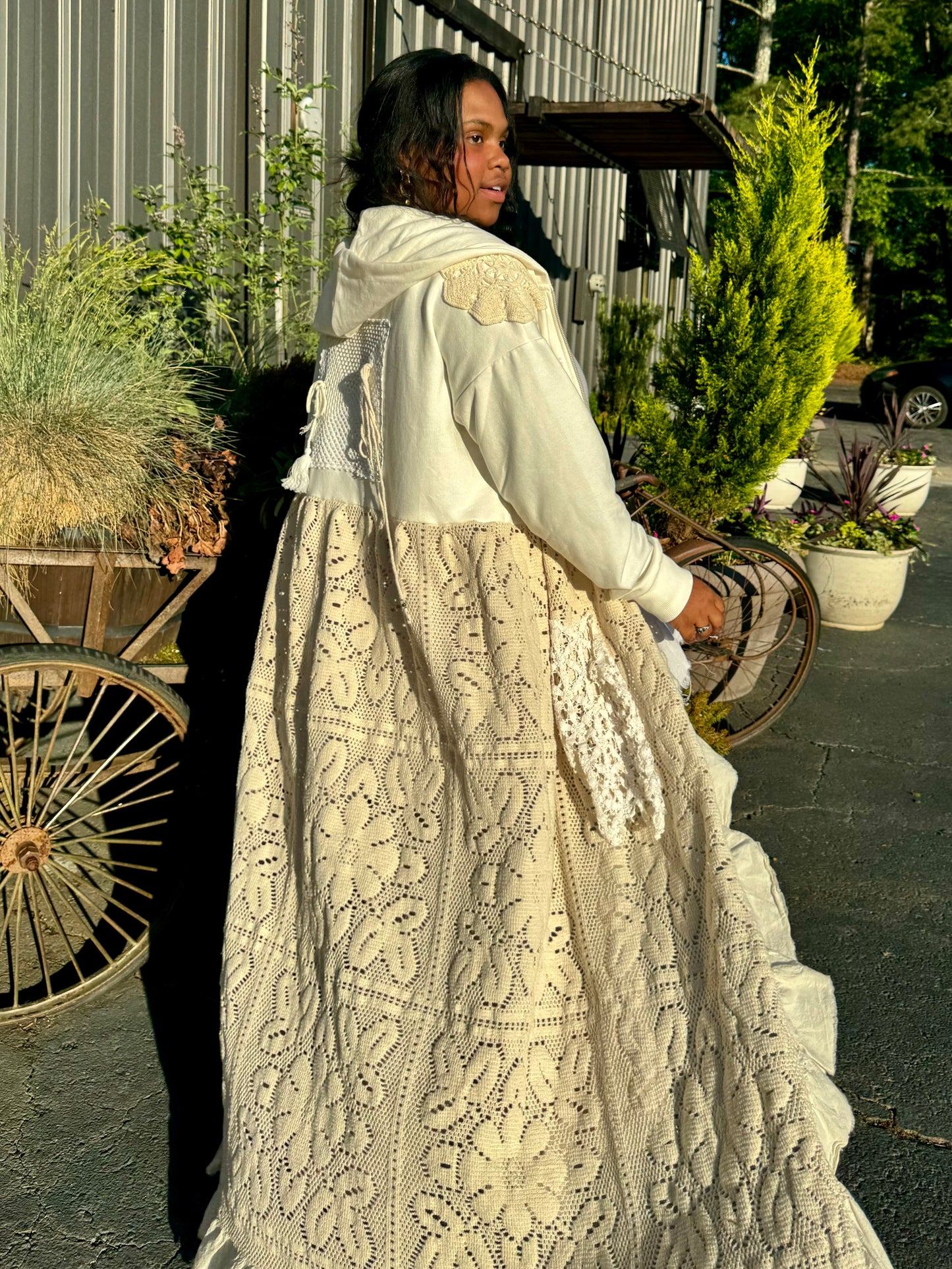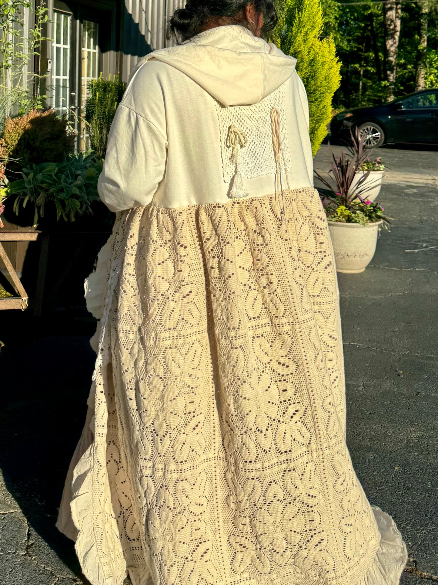 - Upcycled from a quilted bedspread and a denim jacket.