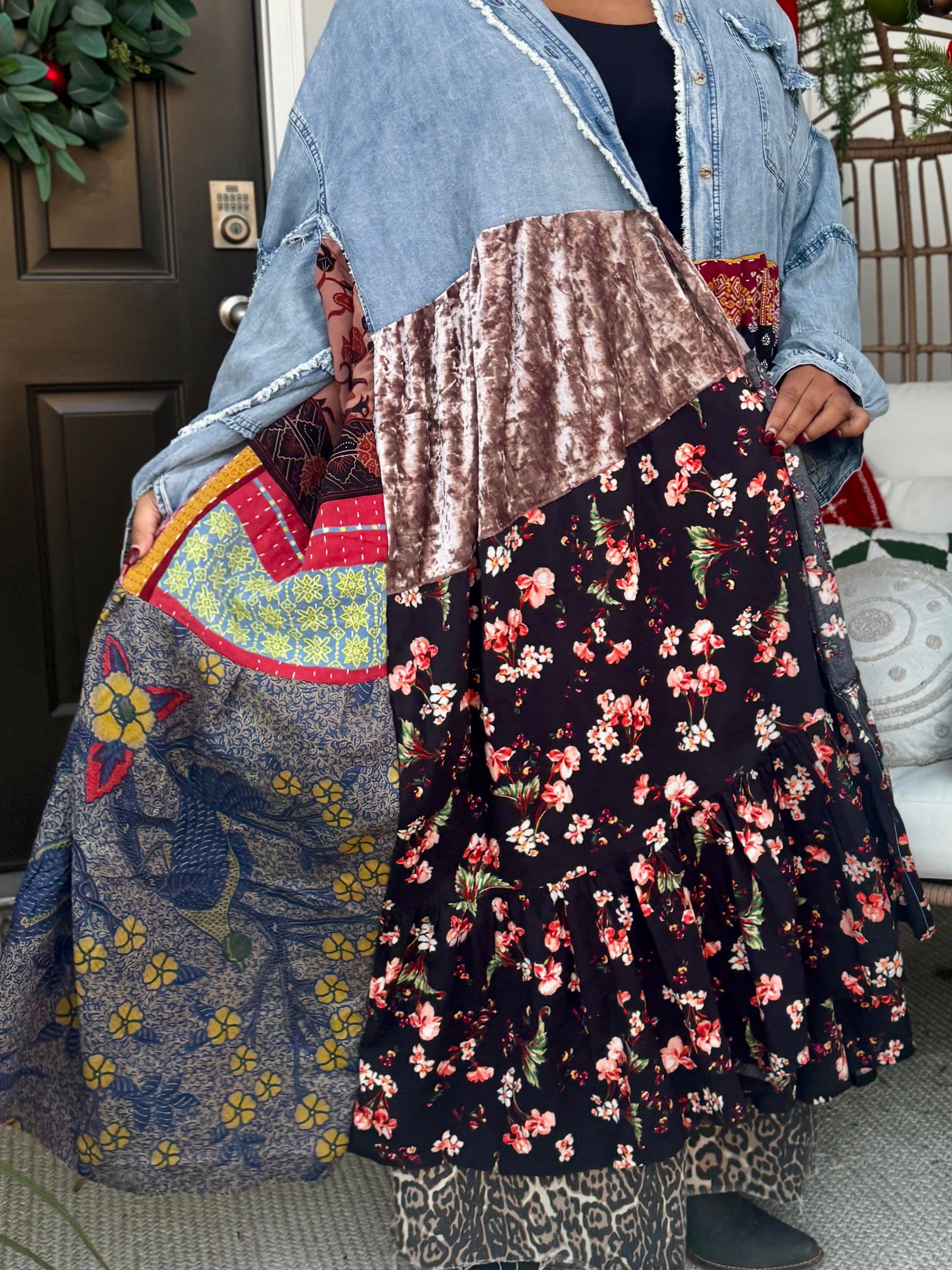 - Upcycled from a denim flannel, dresses, and skirts .