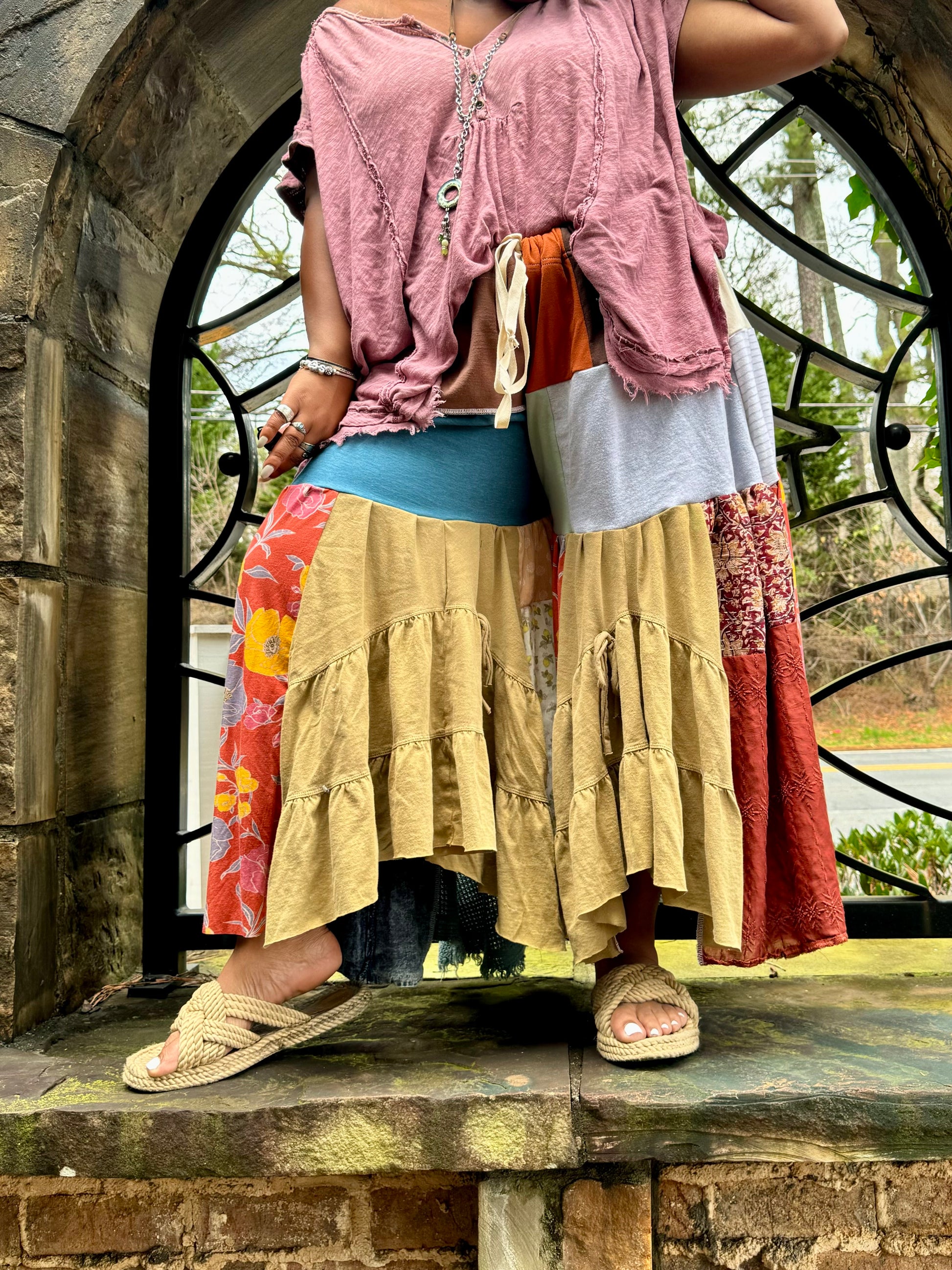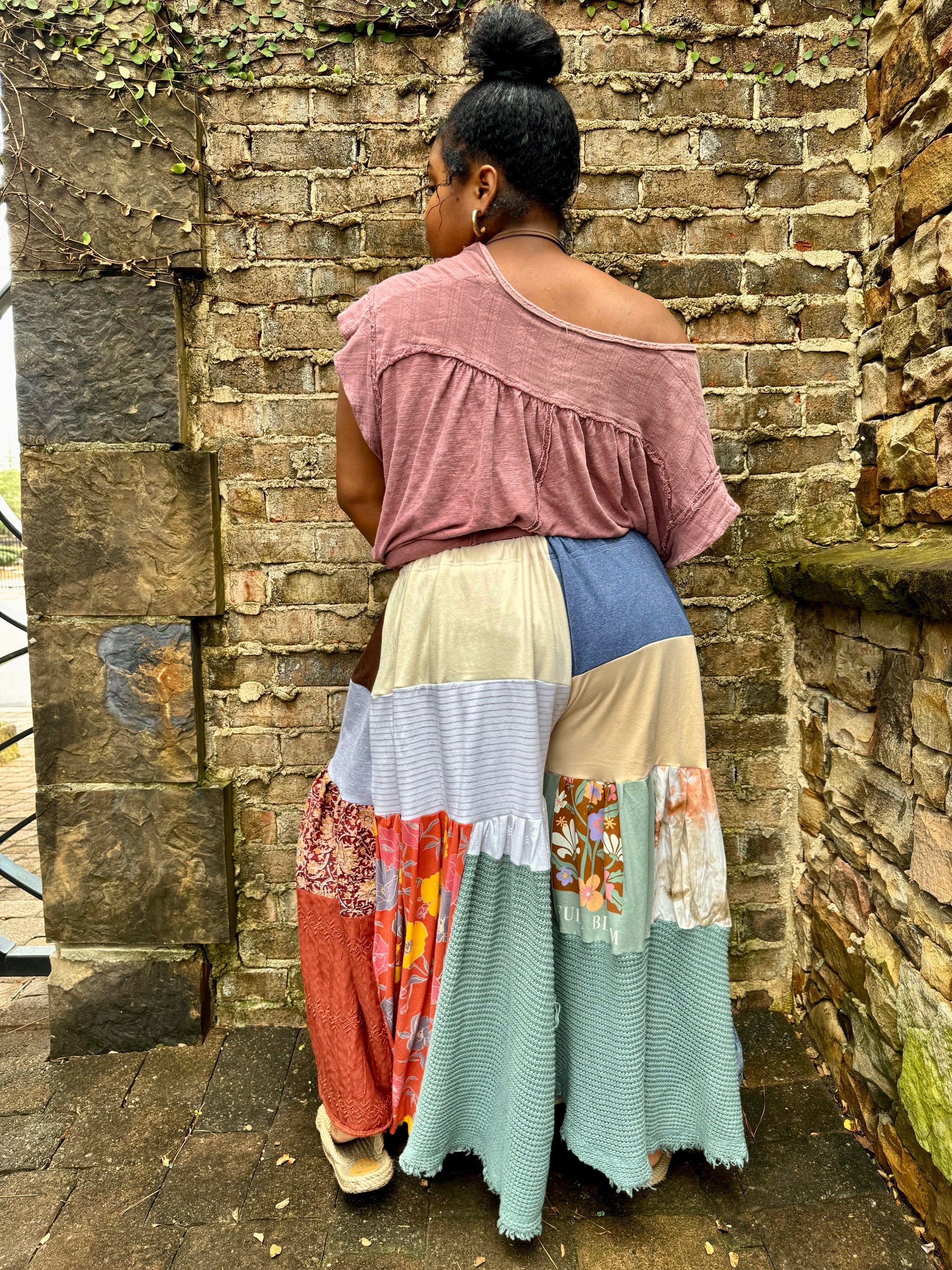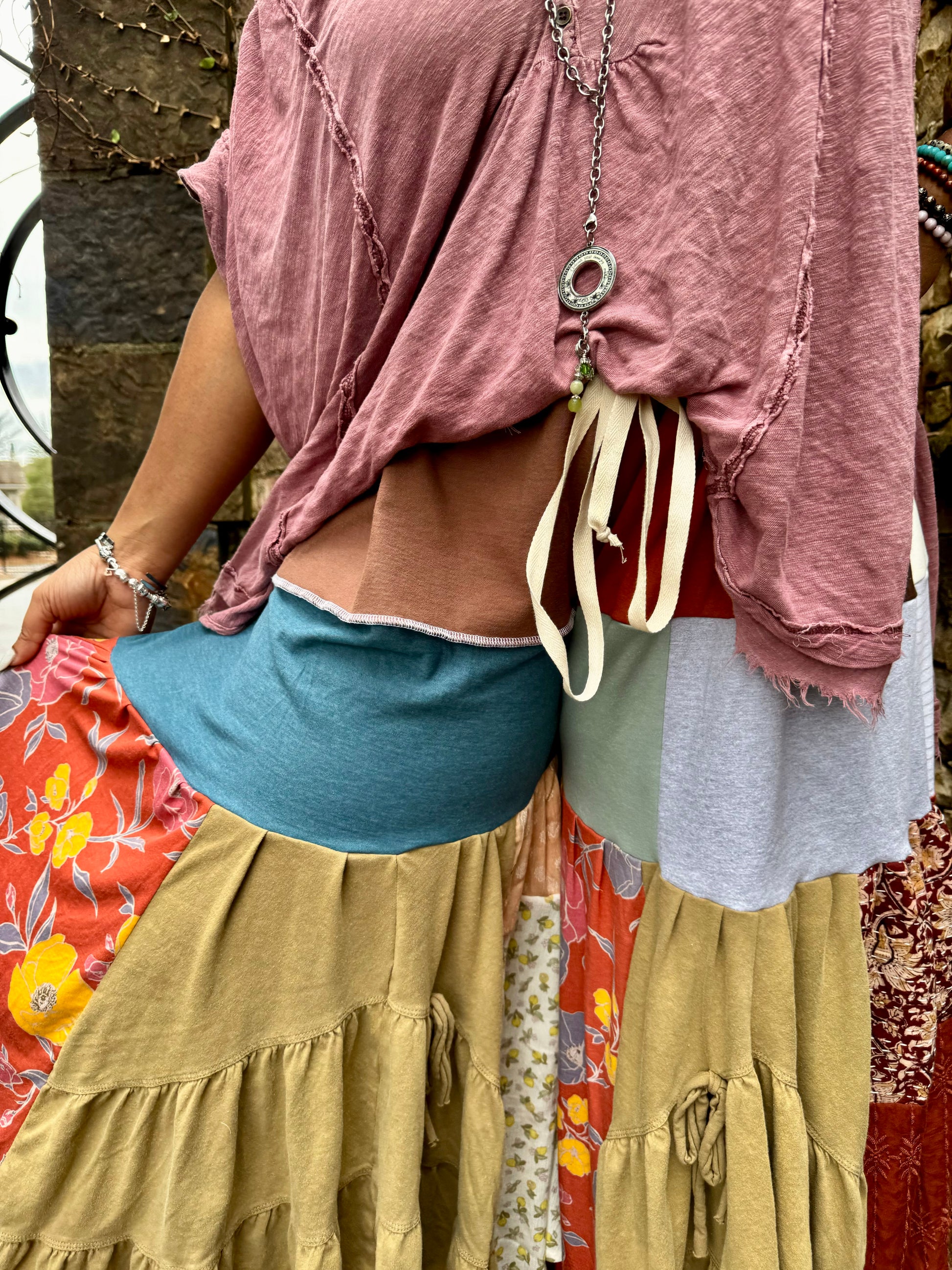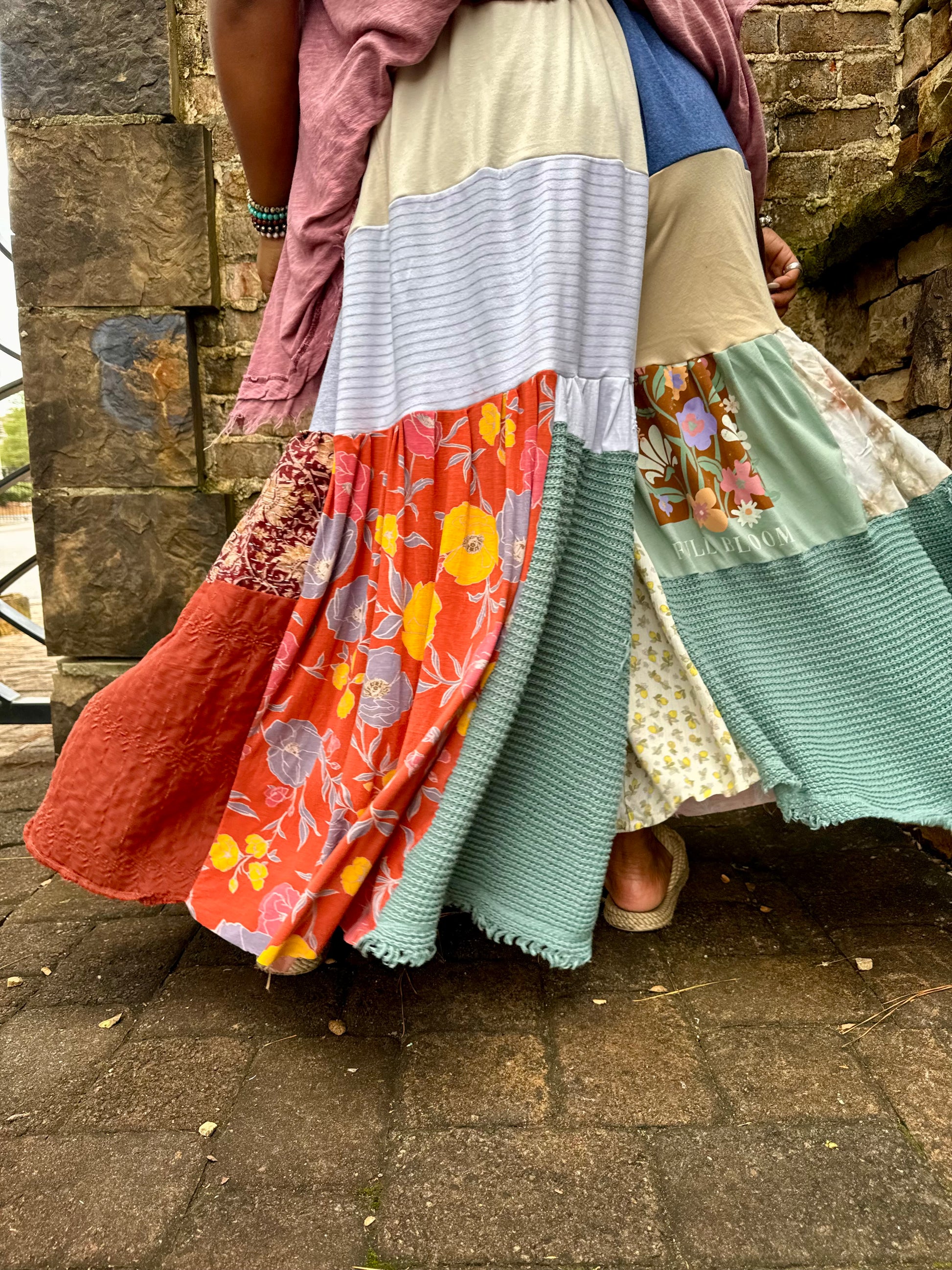 - Double lined tshirt fabric and a mix of fabrics from dresses and skirts.
