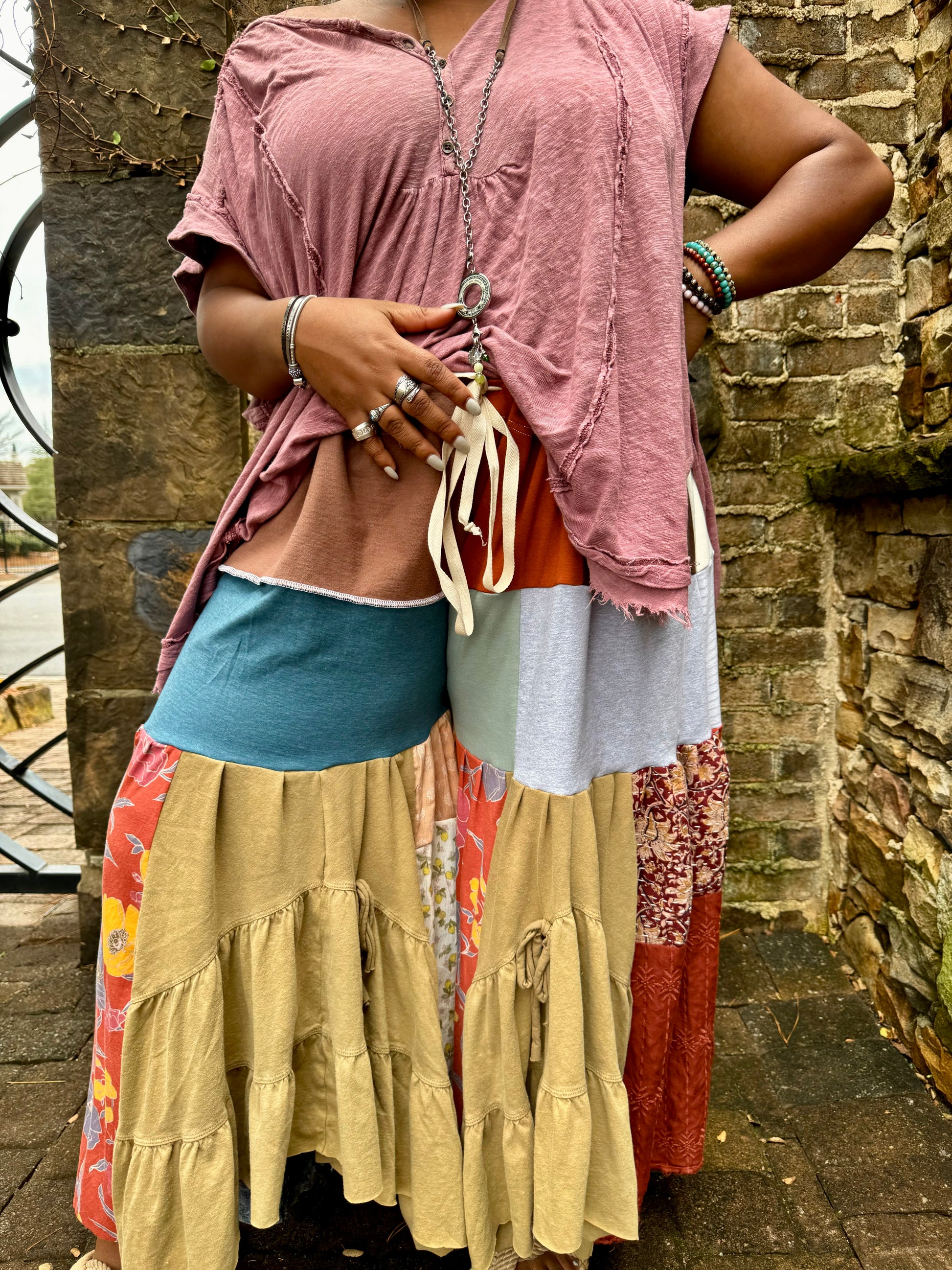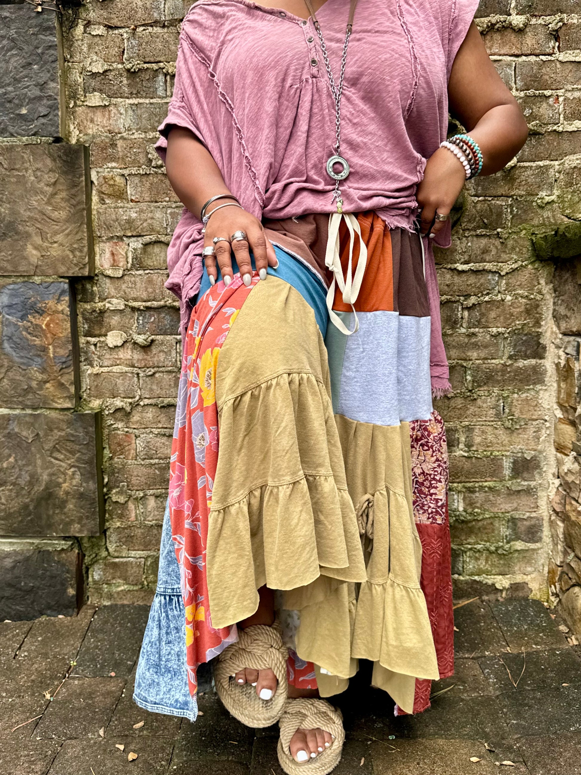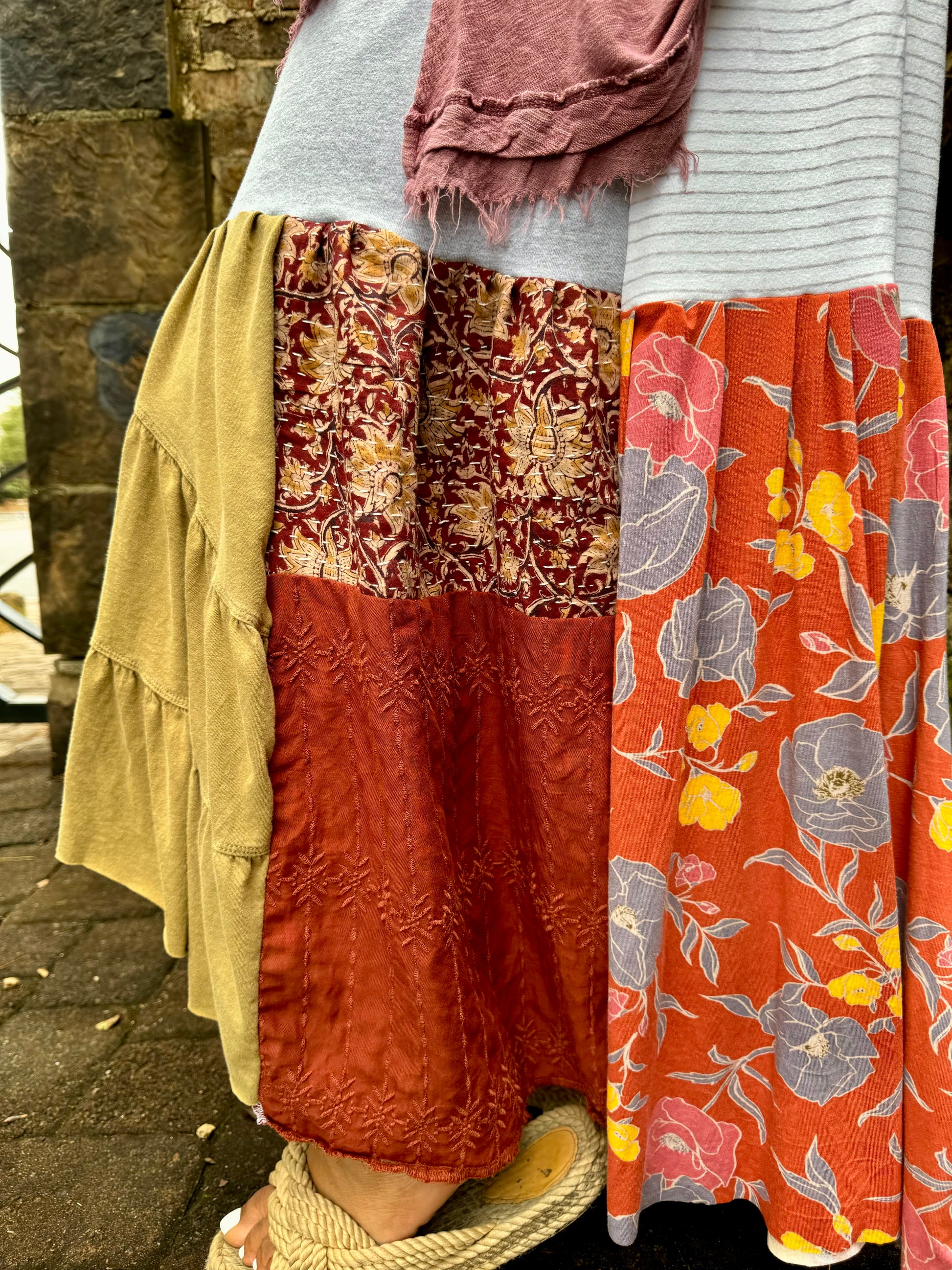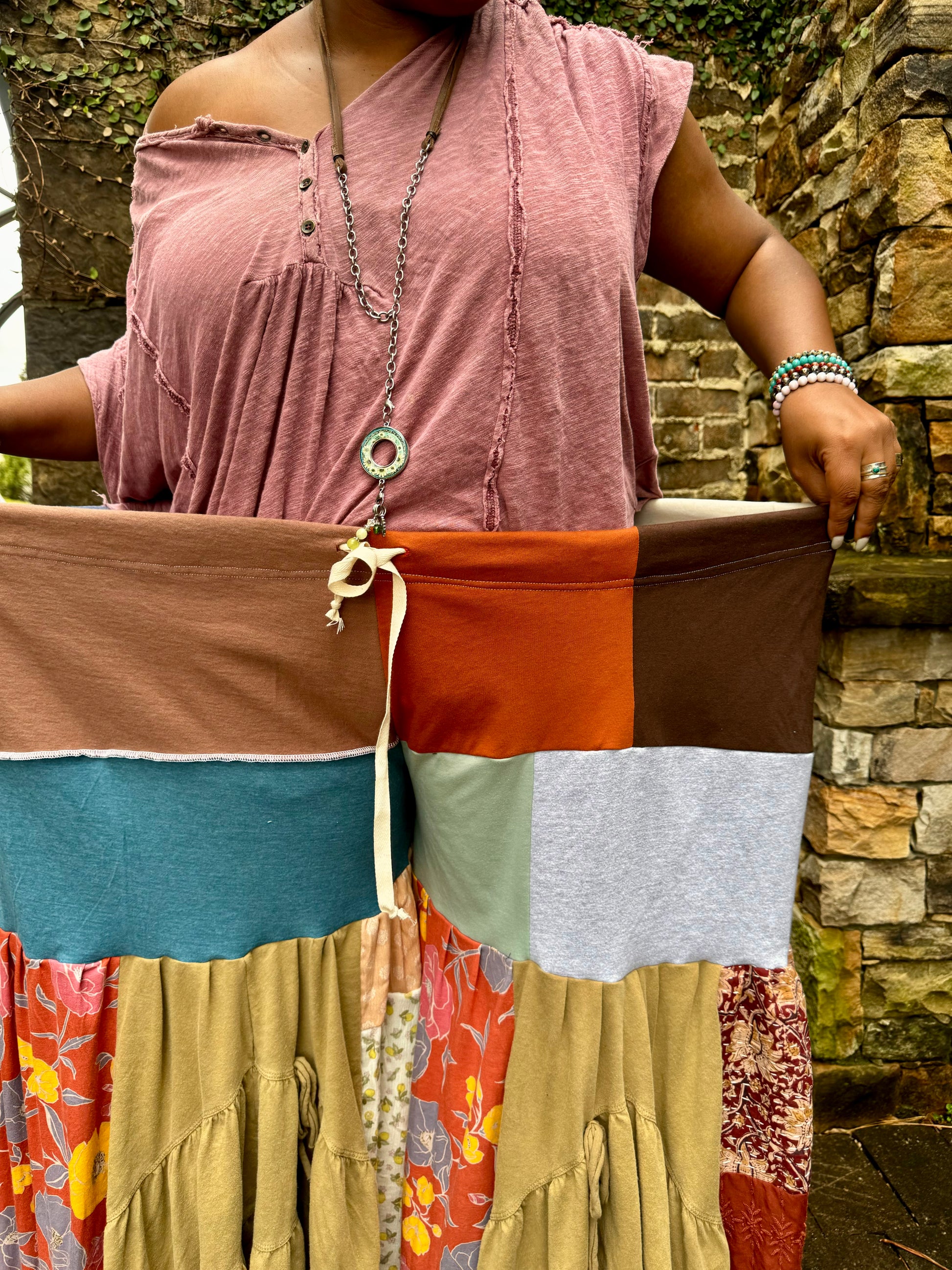 - Double lined tshirt fabric and a mix of fabrics from dresses and skirts.