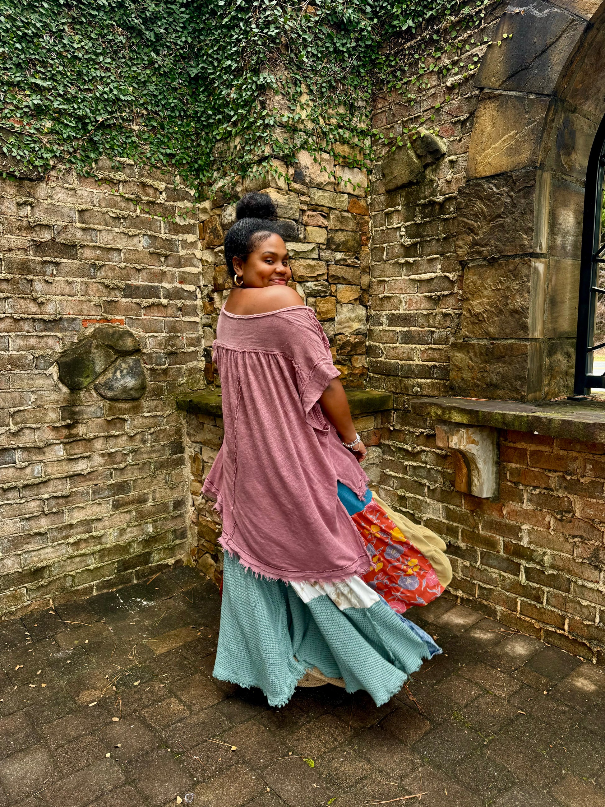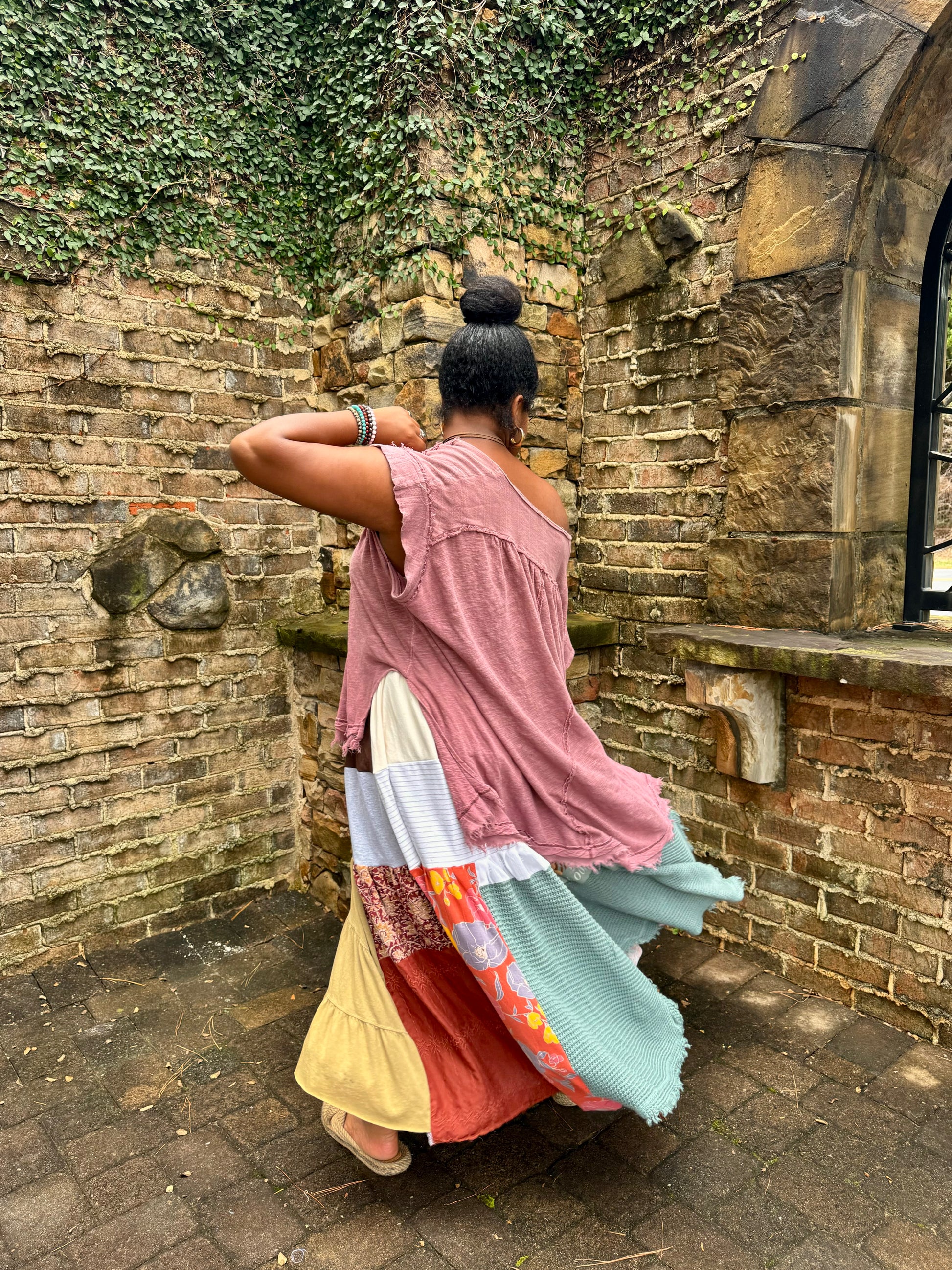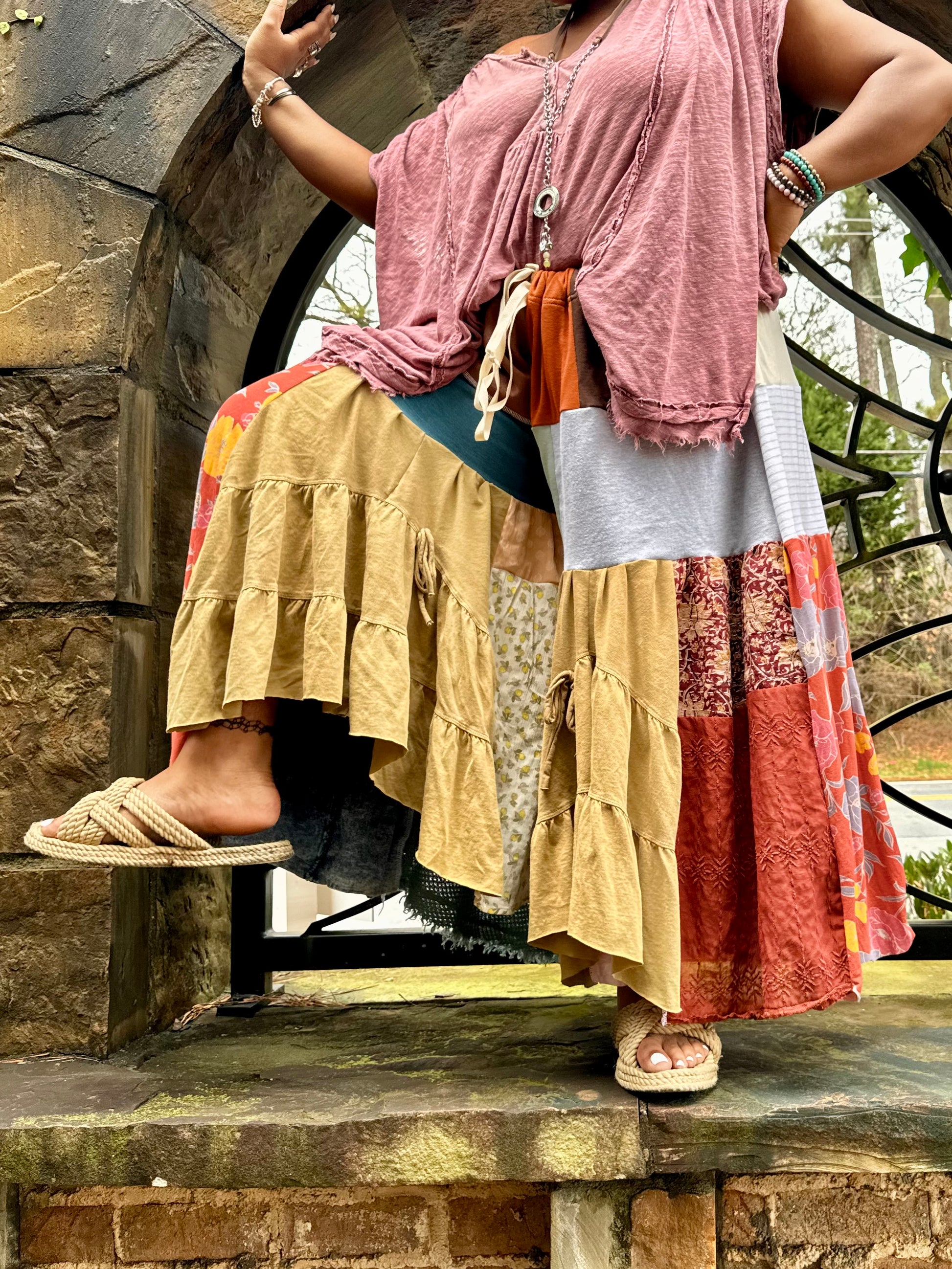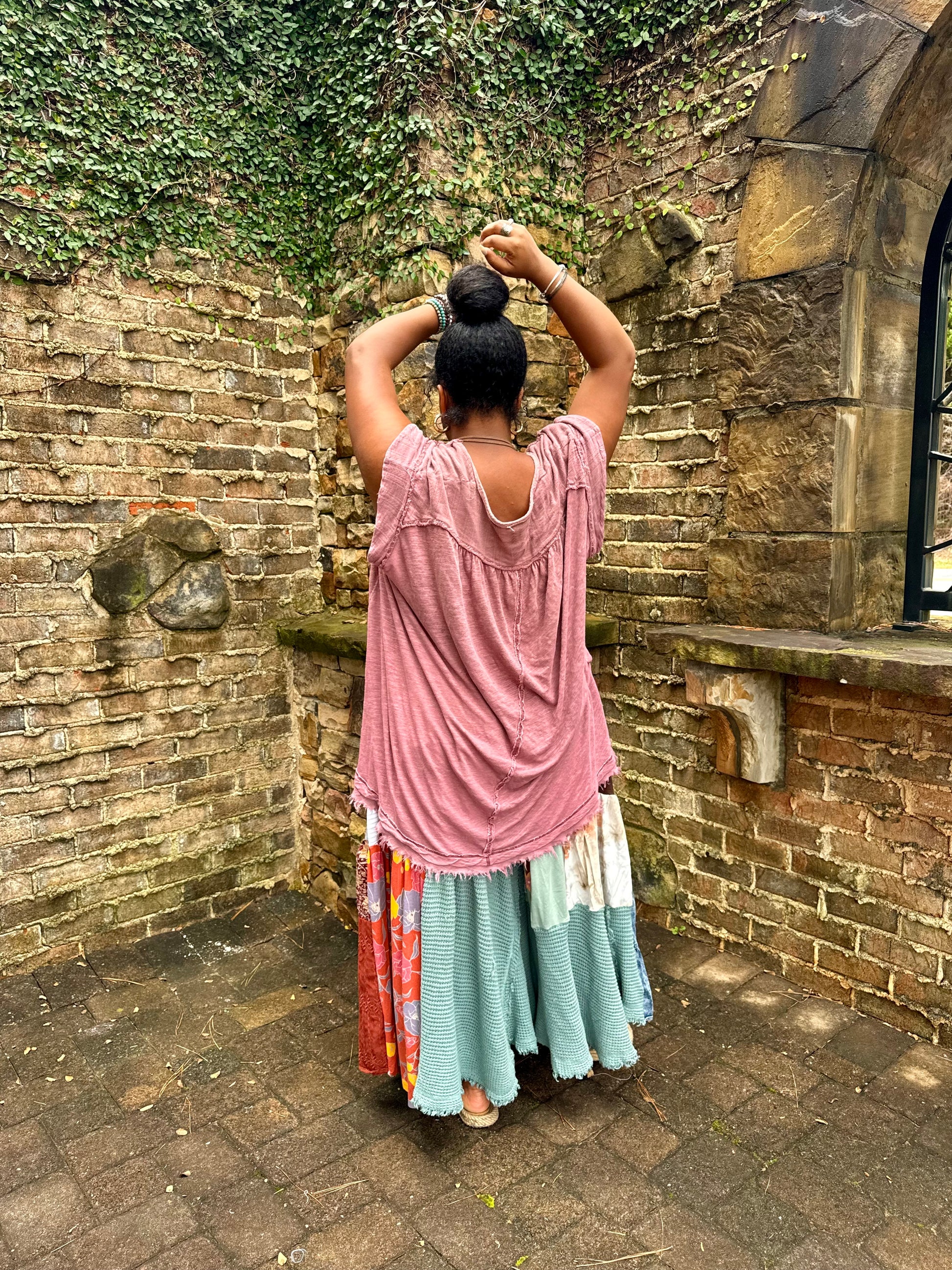- Double lined tshirt fabric and a mix of fabrics from dresses and skirts.