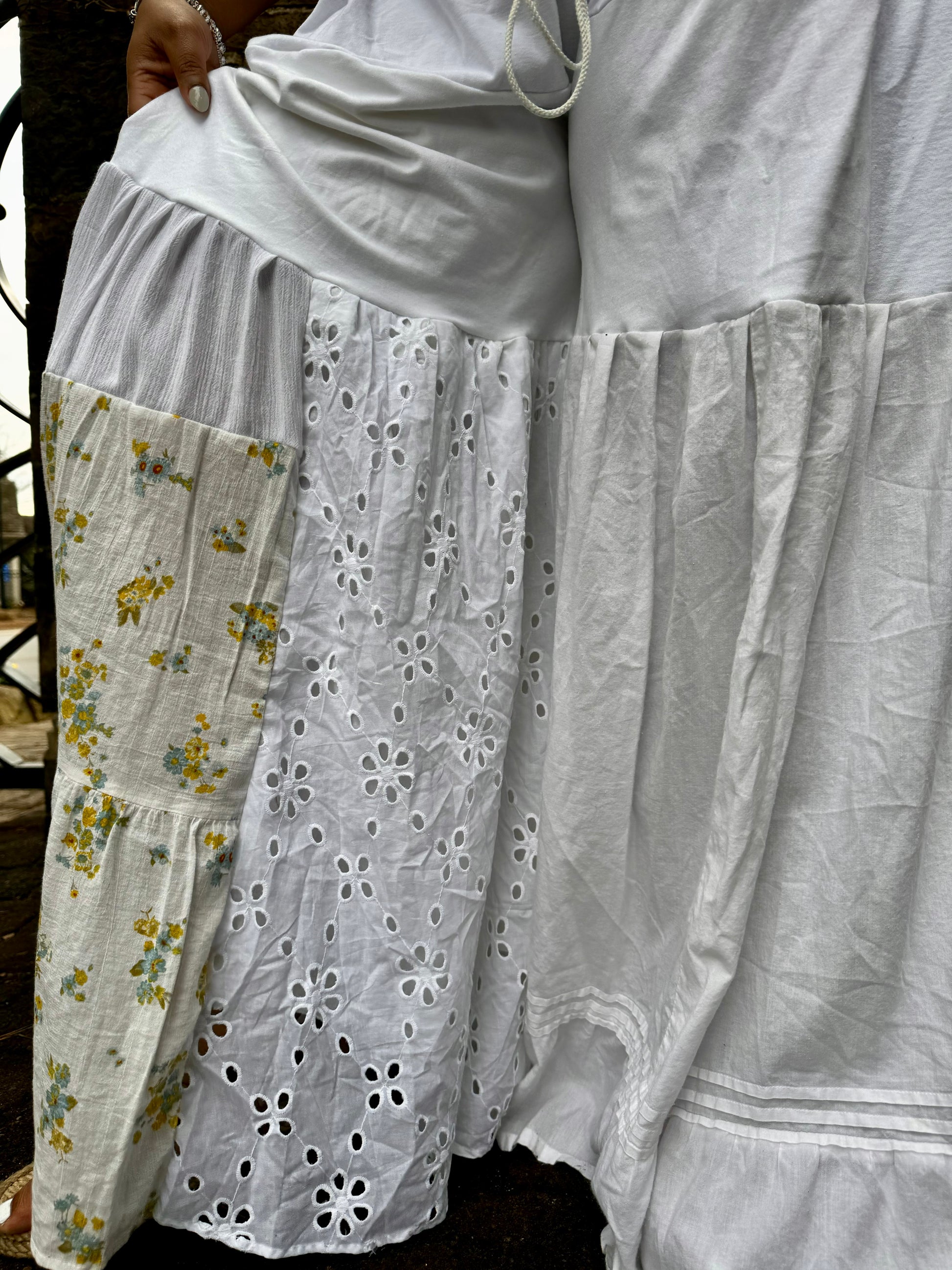- Double lined tshirt fabric and a mix of fabrics from dresses and skirts.