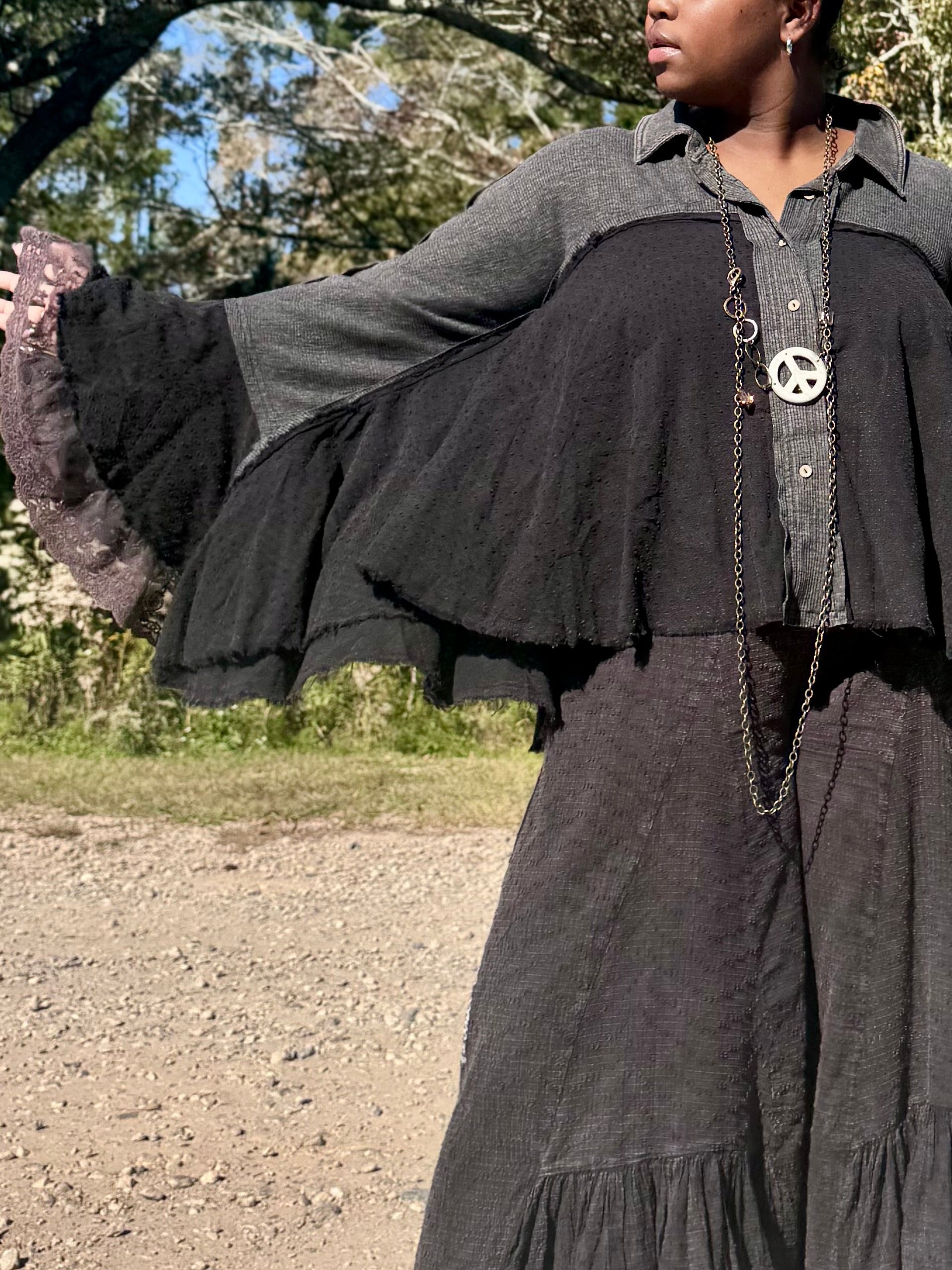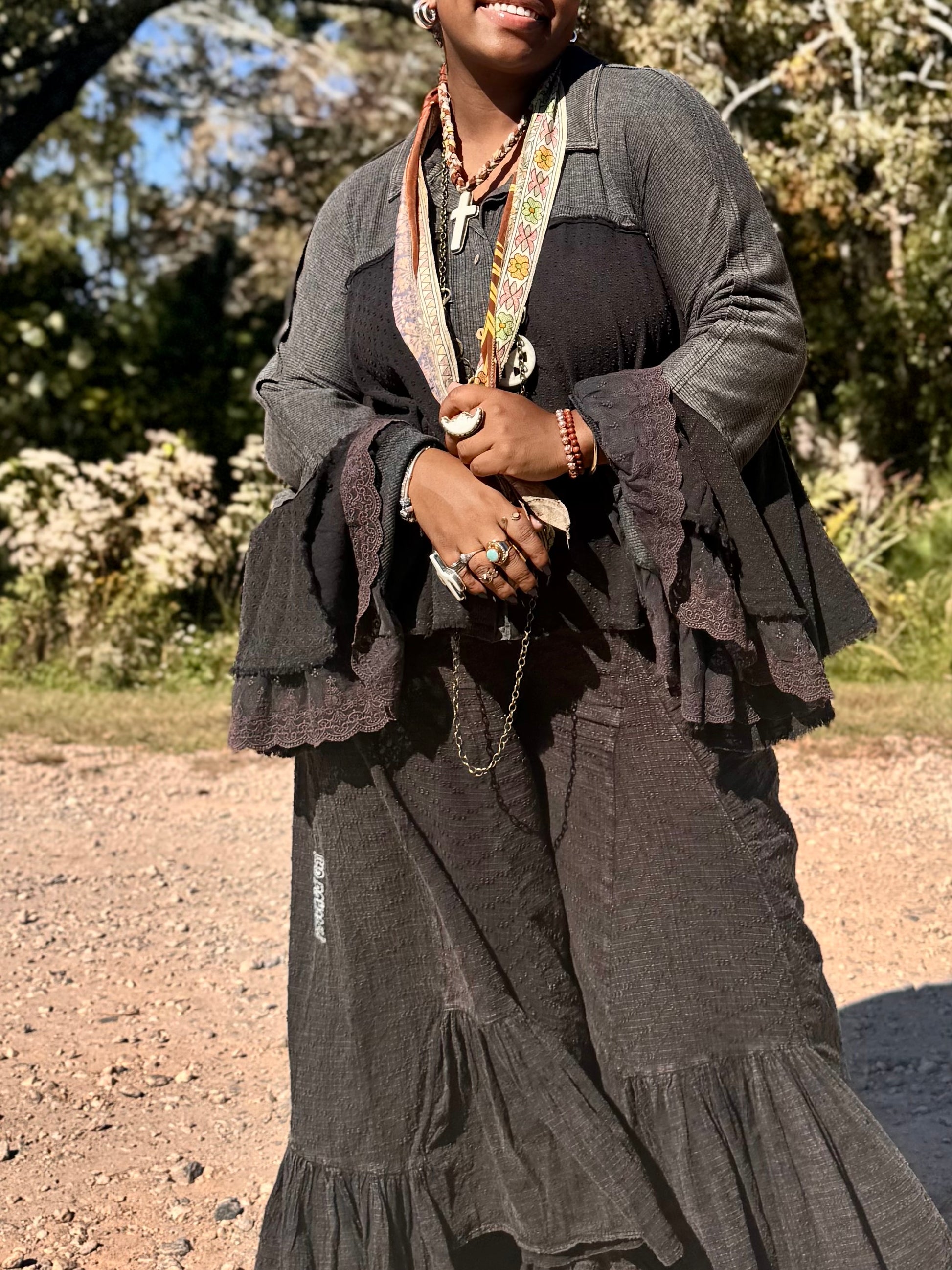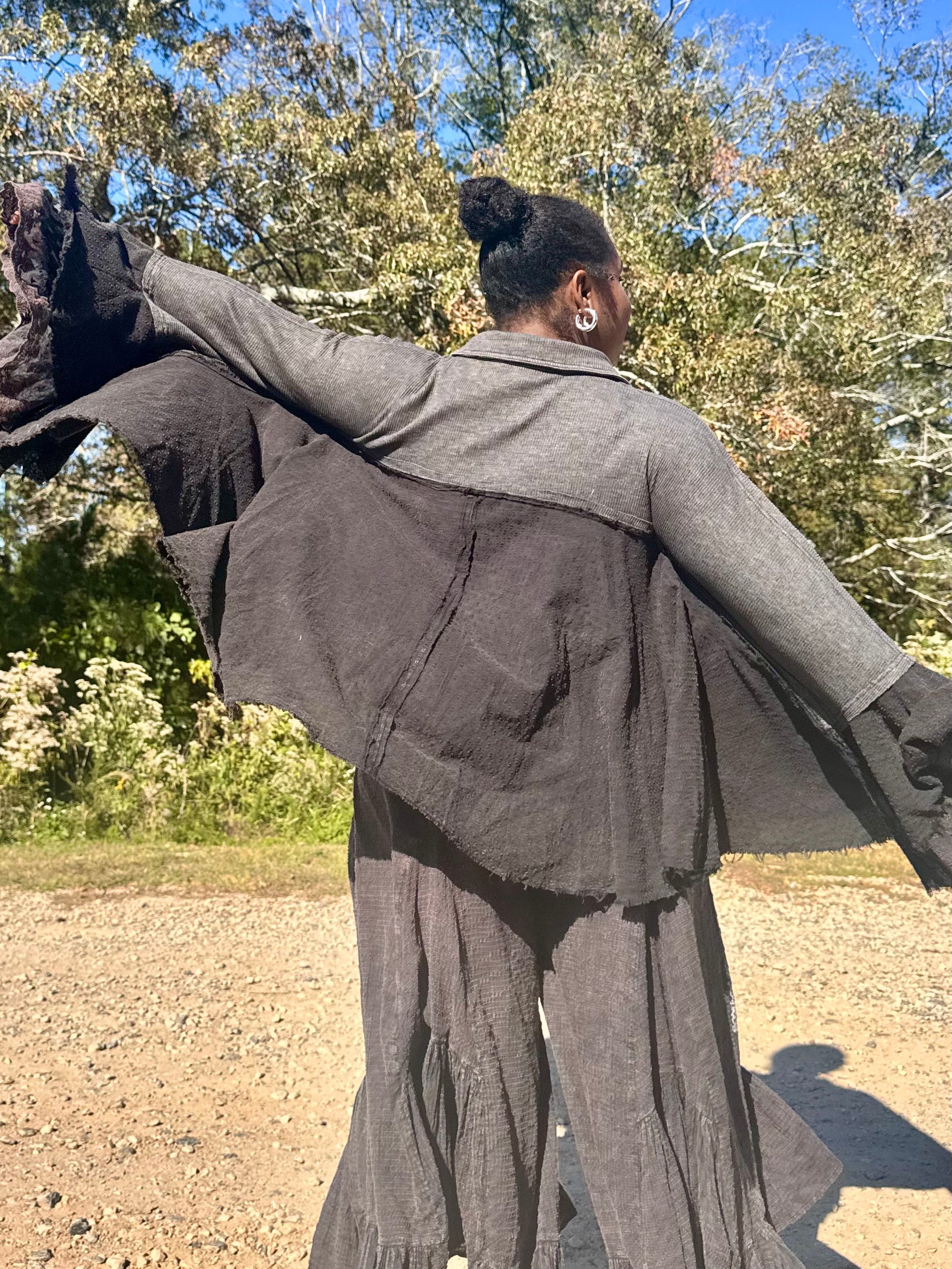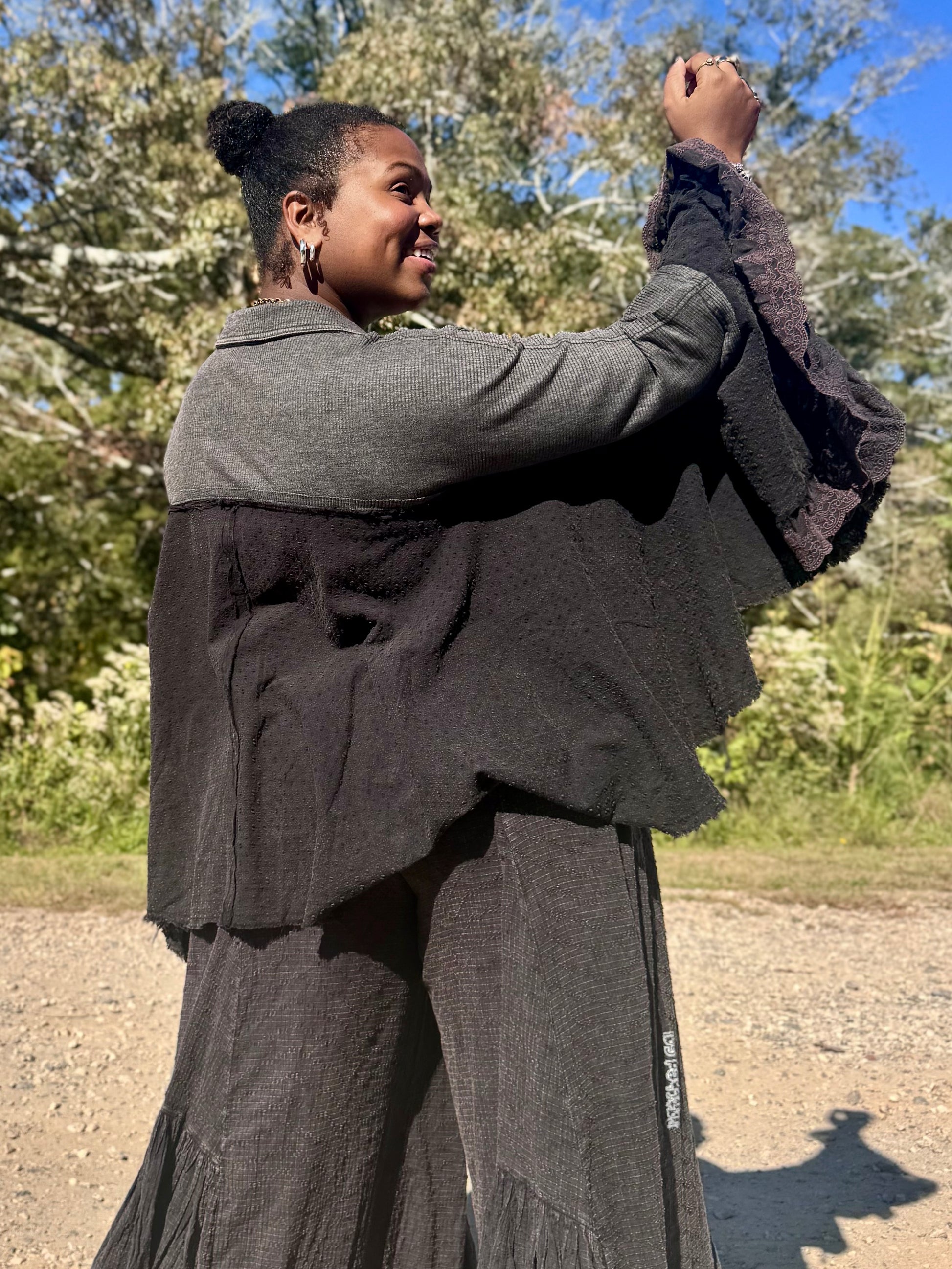 The perfect pants to wear with anything! Dress them up with boots and have fun with layering it over a dress! Looks super cool worn open with our maxi tees!