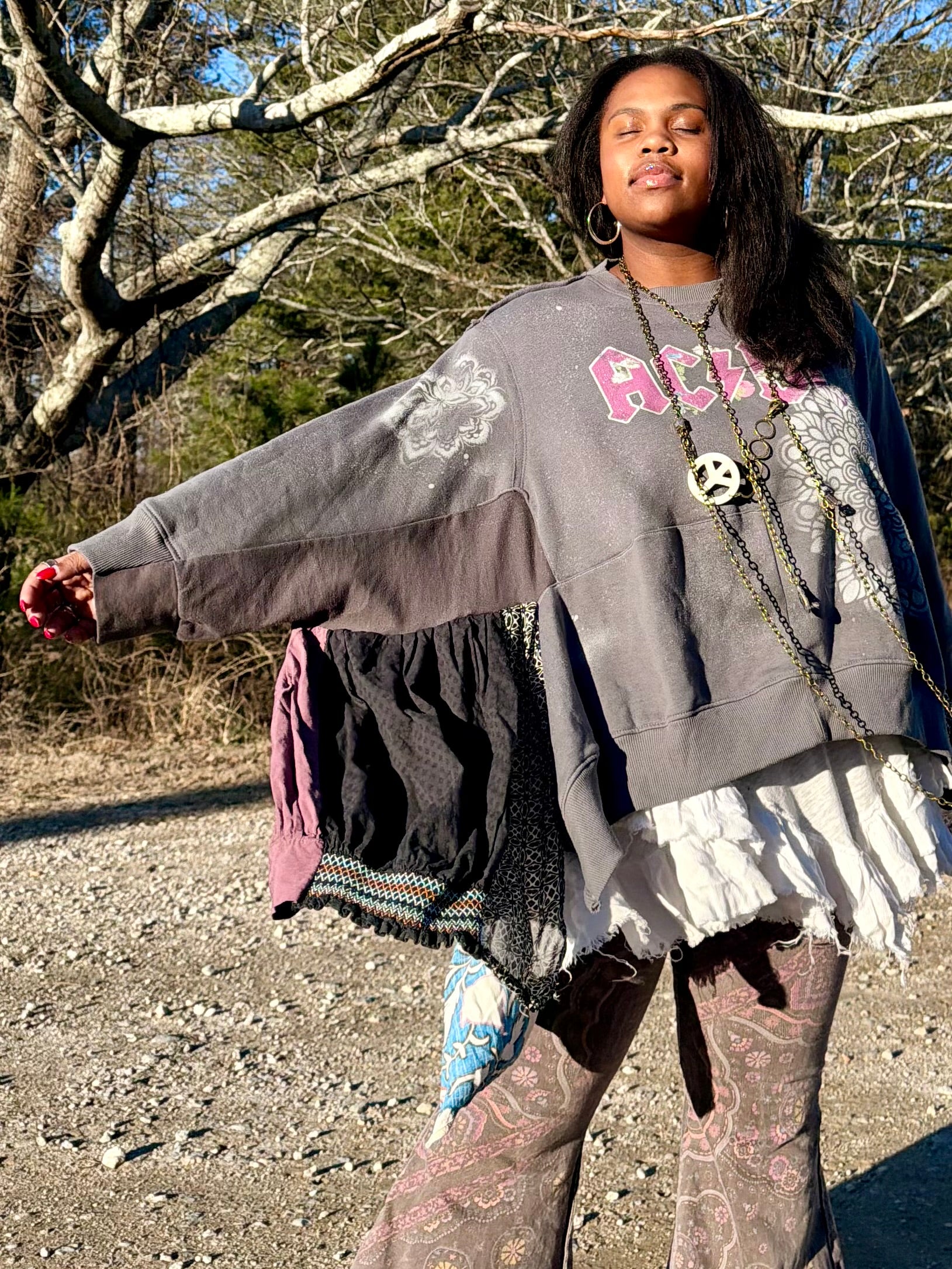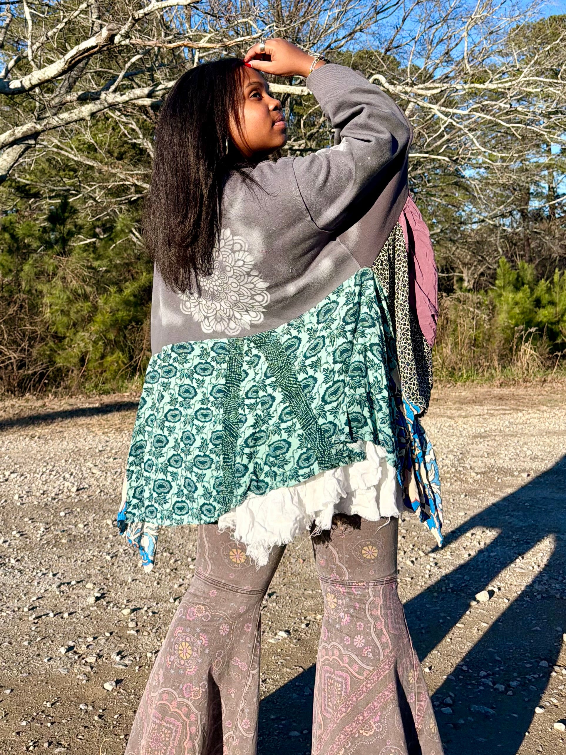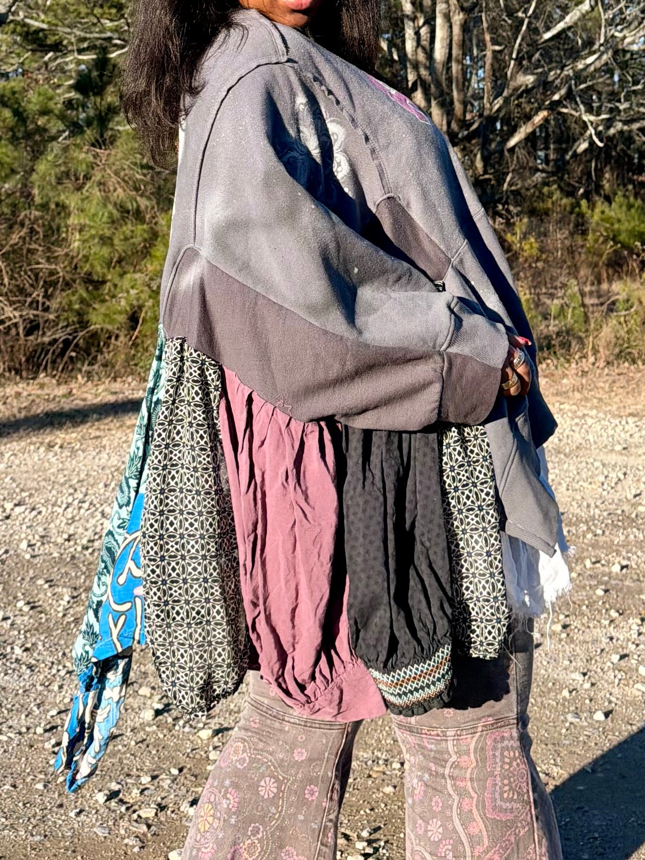 - Upcycled from a zip up jacket, lace doiley's, skirts, and table cloths.