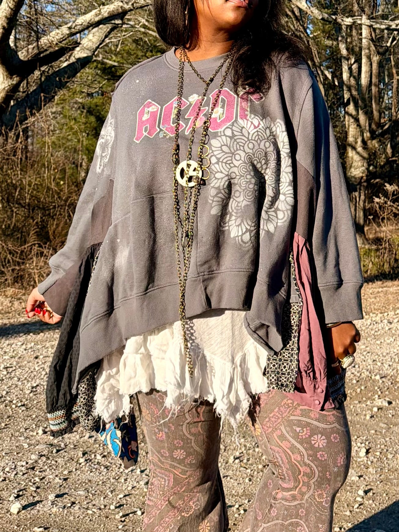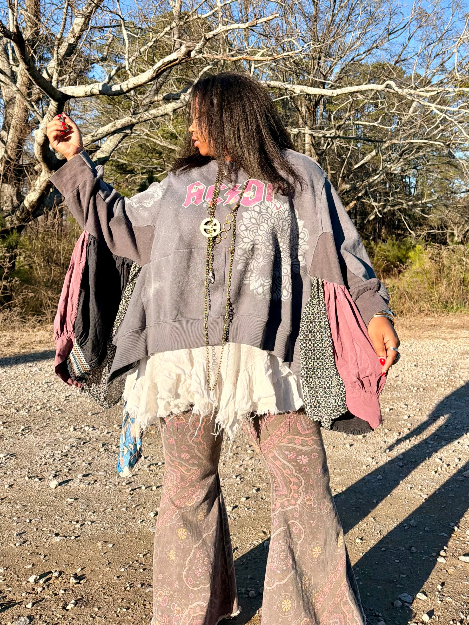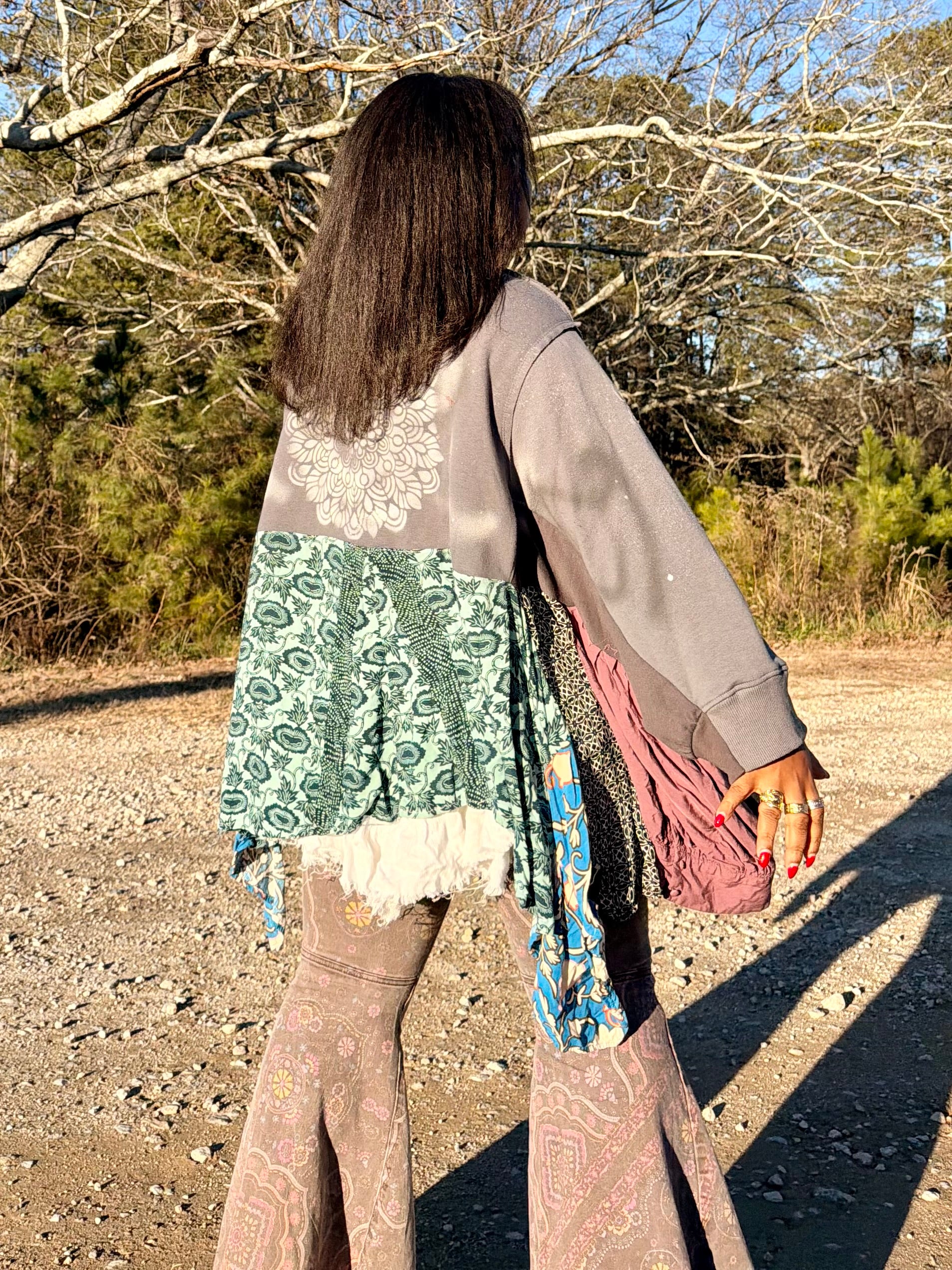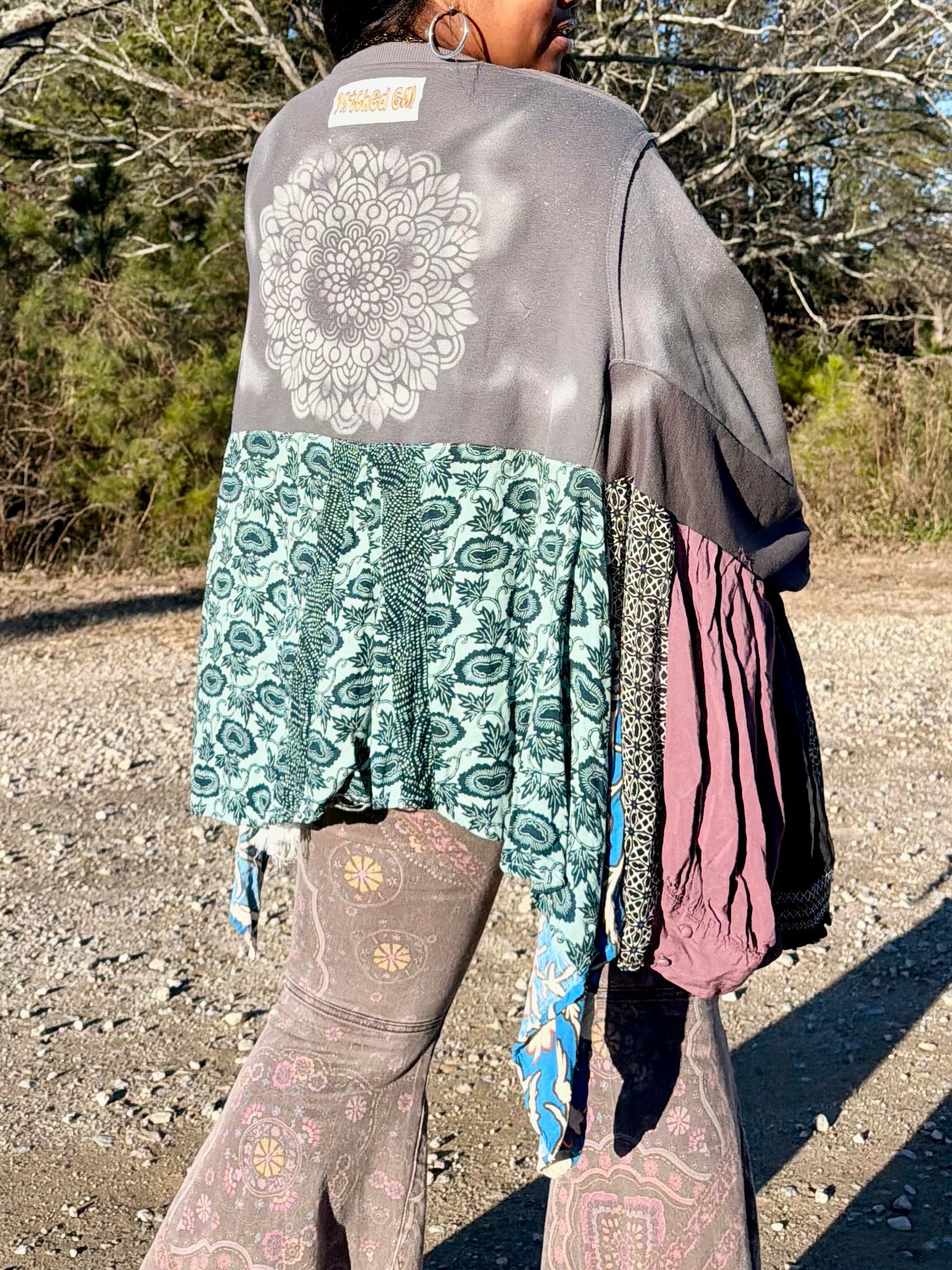- Upcycled from a zip up jacket, lace doiley's, skirts, and table cloths.