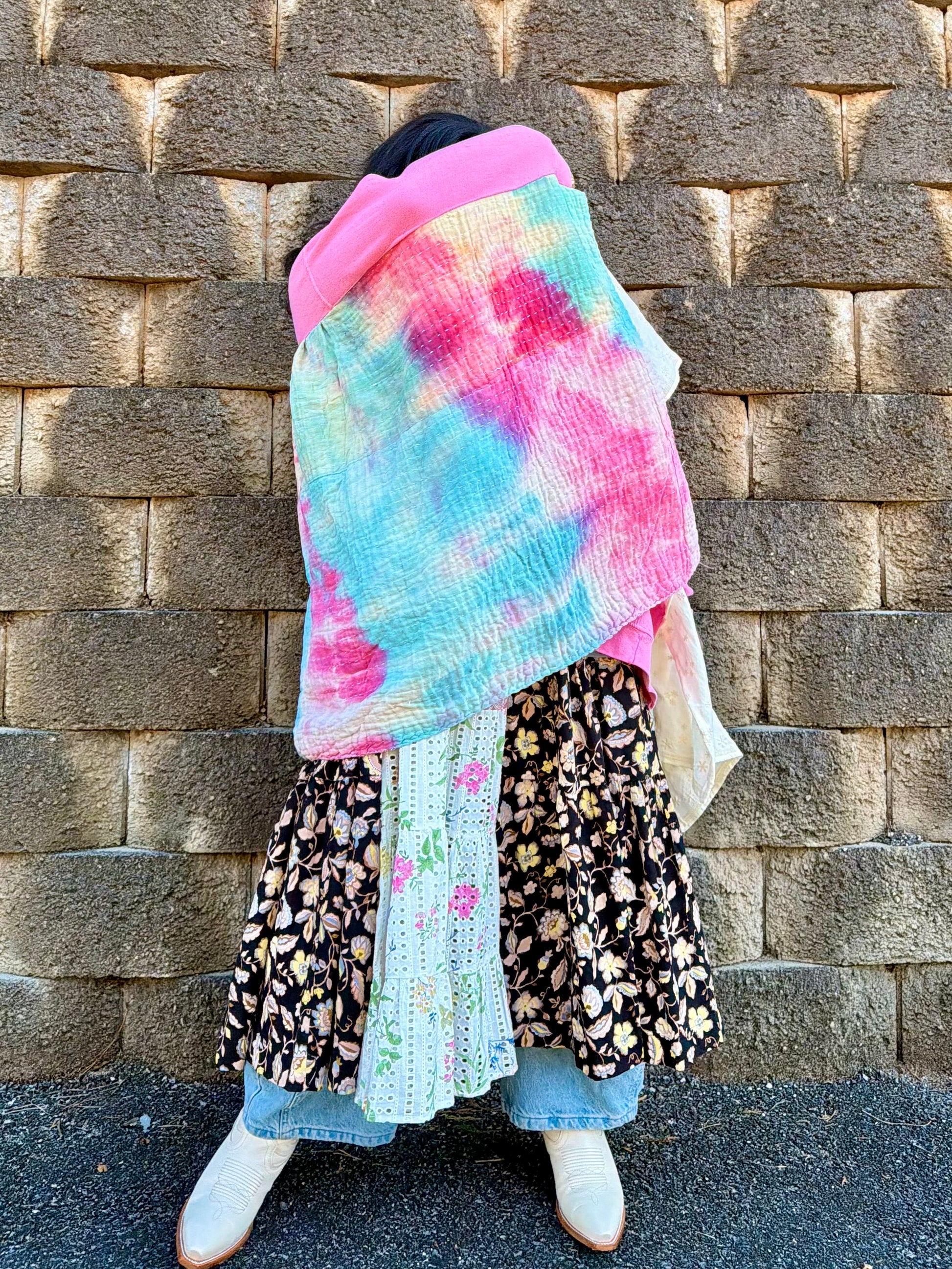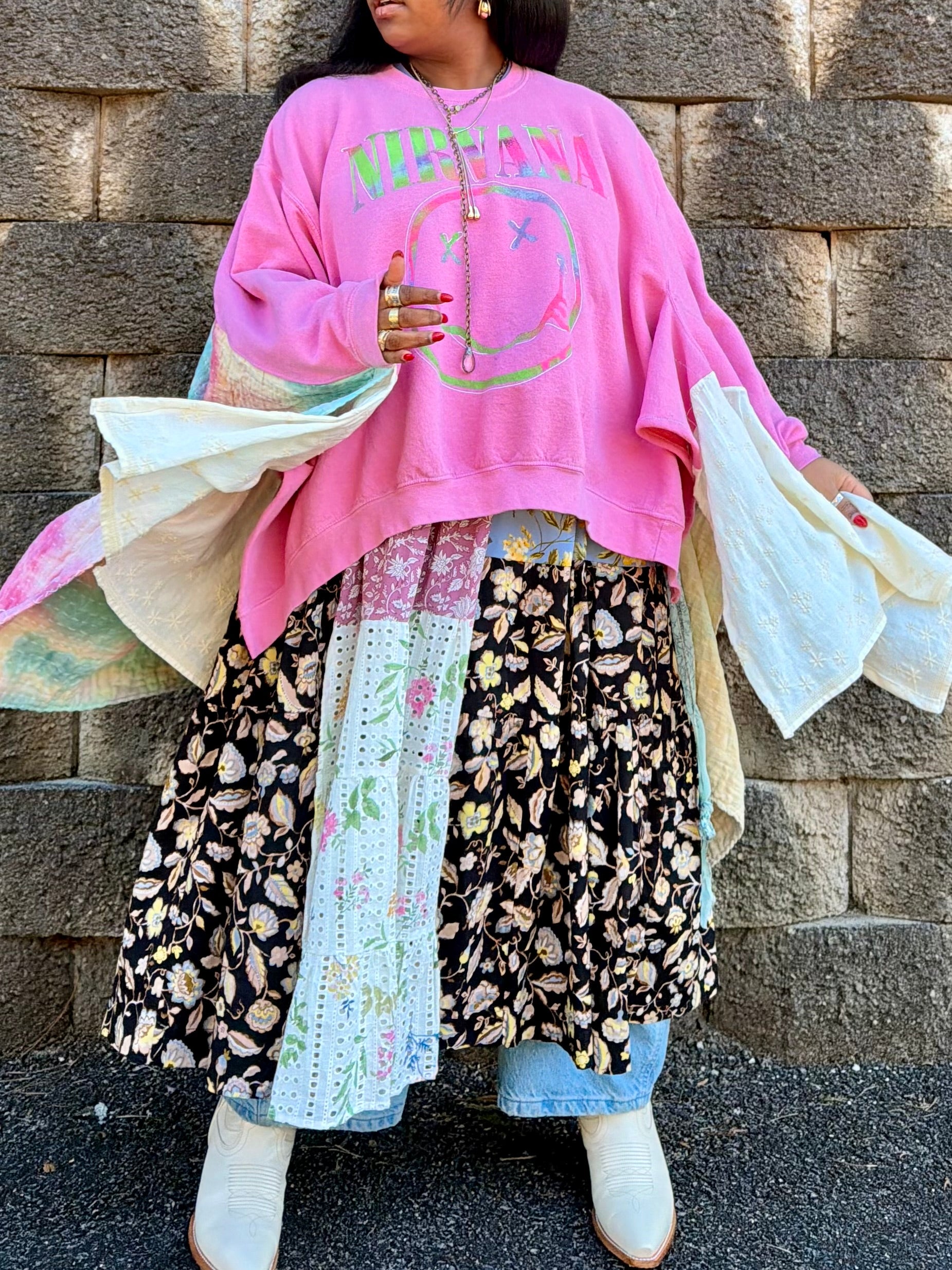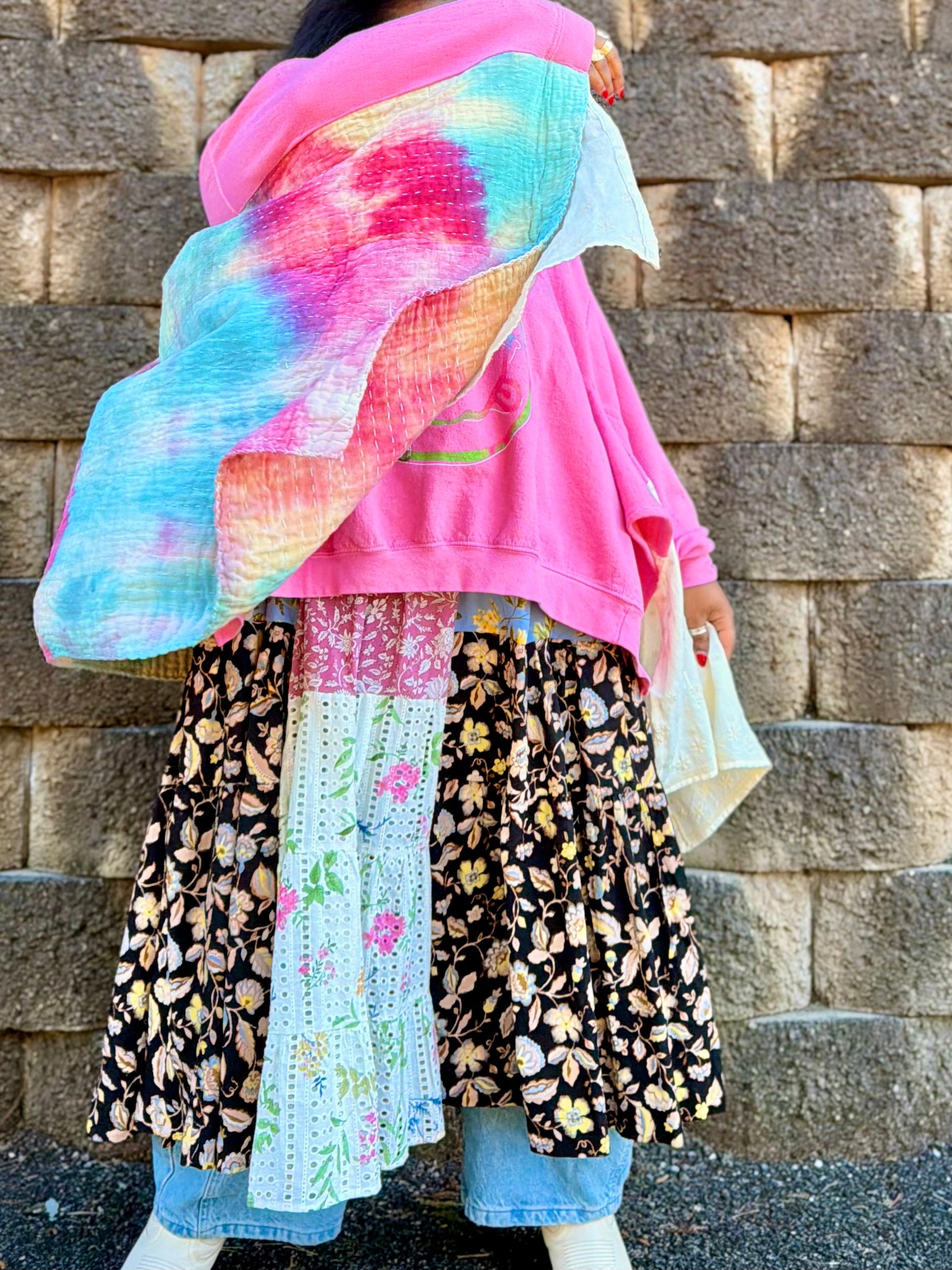 - Upcycled from a zip up jacket, lace doiley's, skirts, and table cloths.