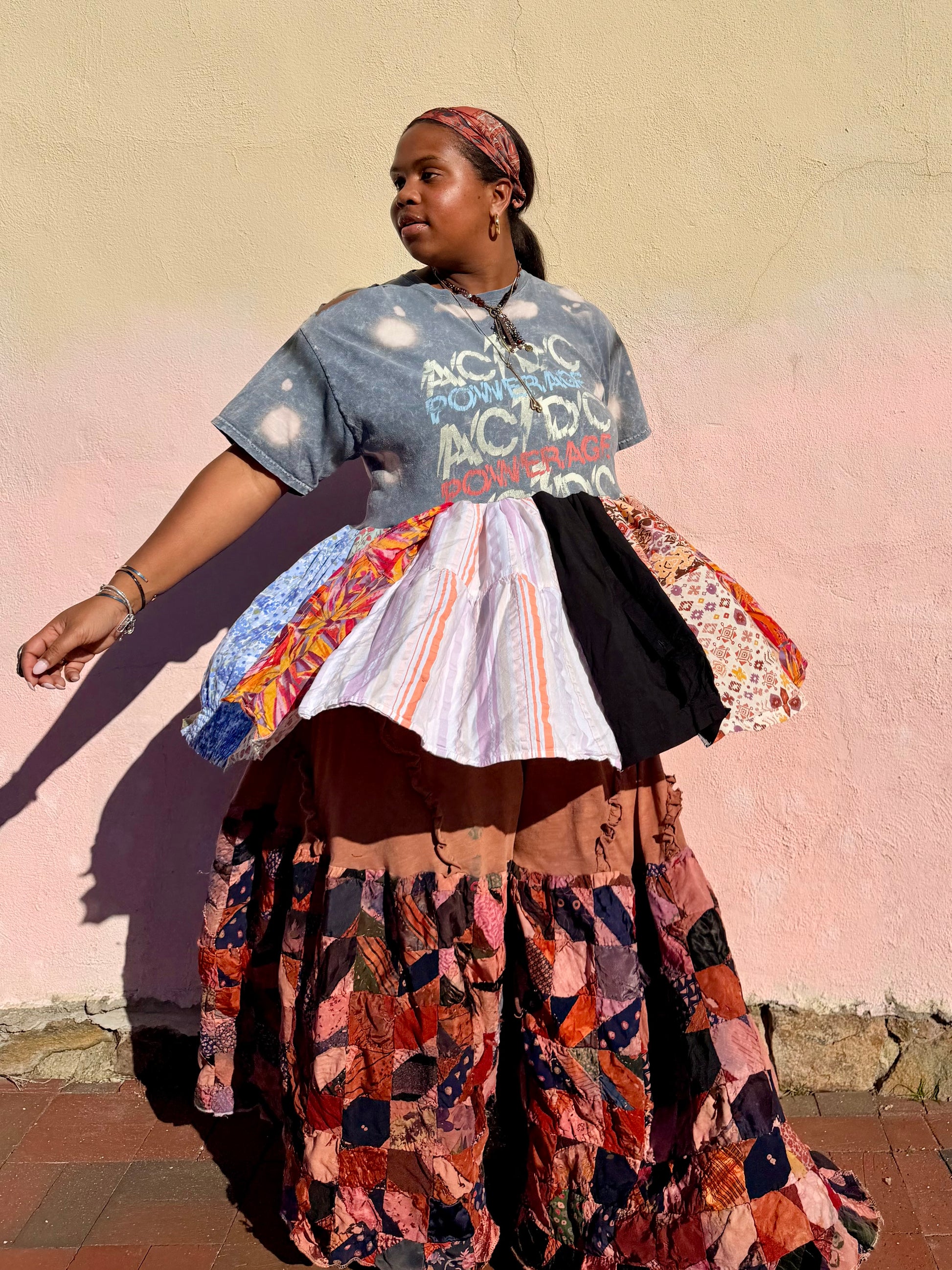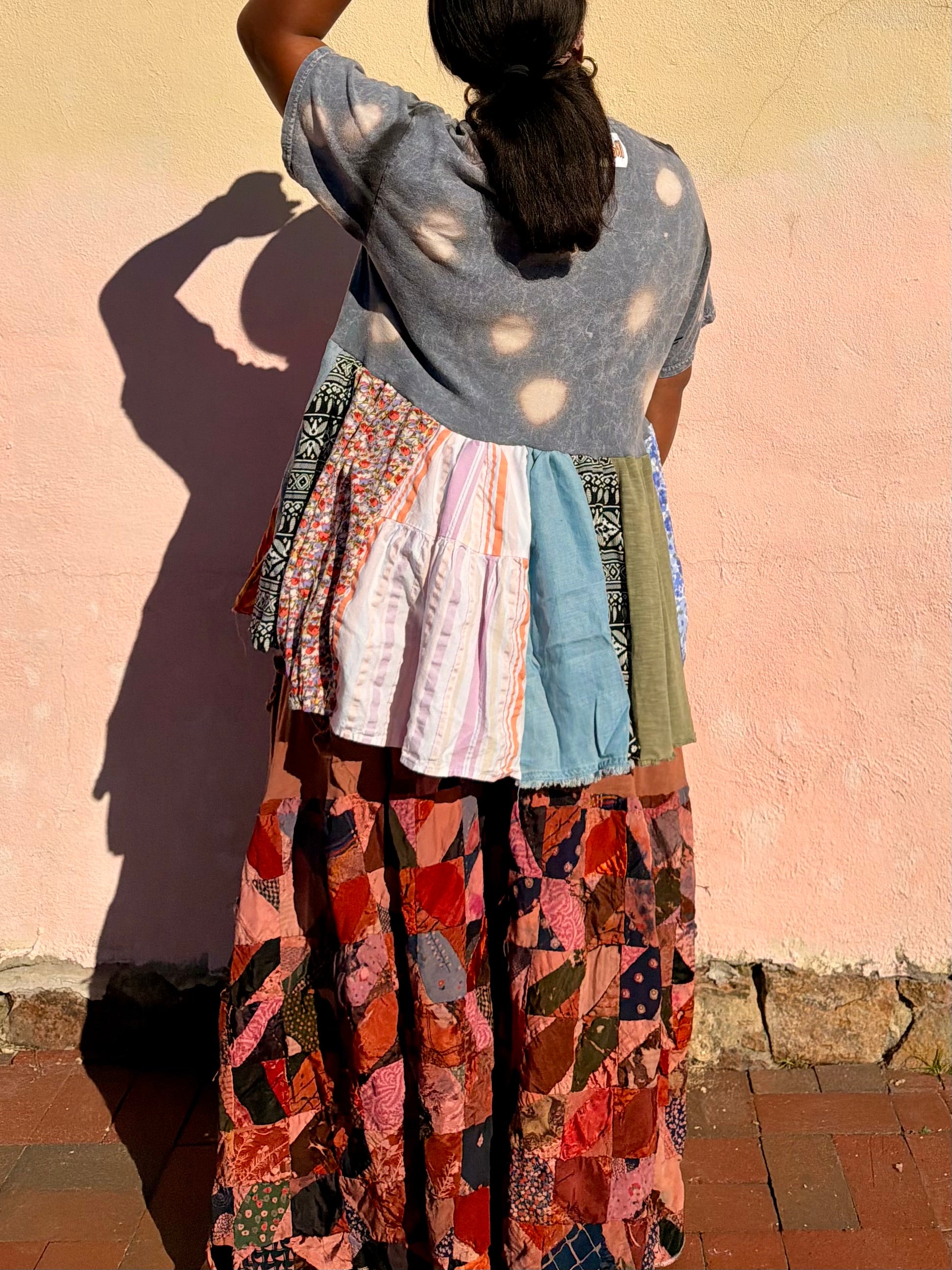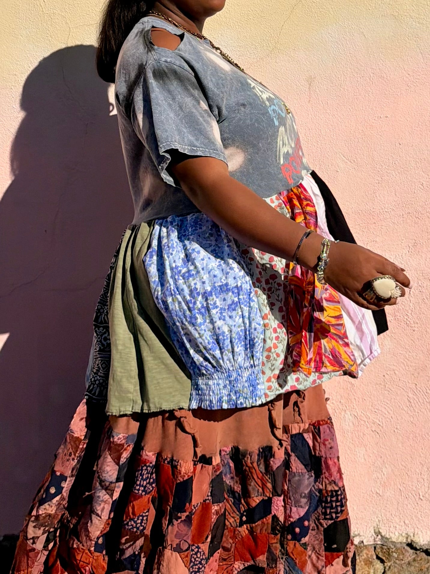 - All fabrics are hand arranged and cut into pieces to make a beautiful skirt.