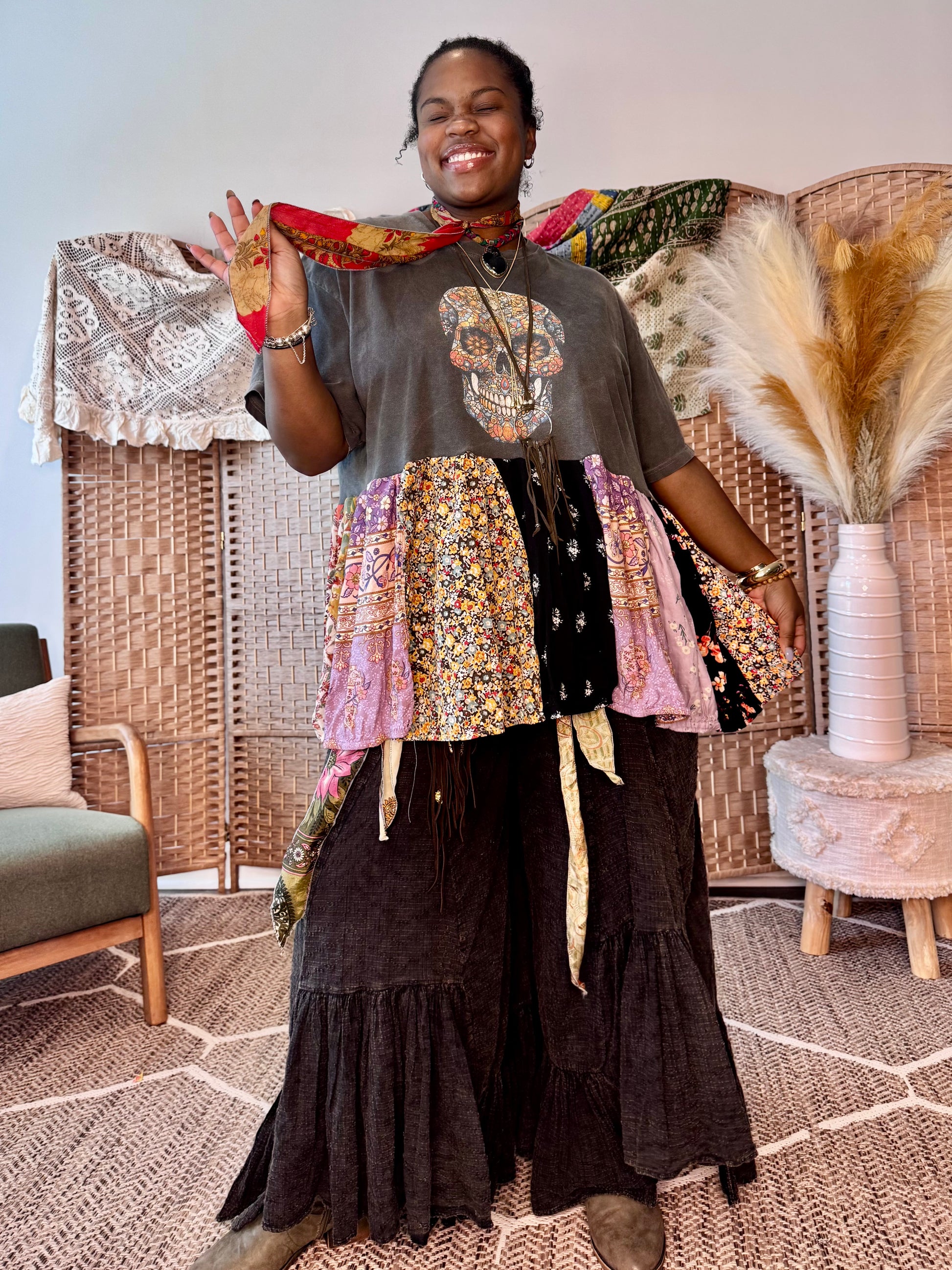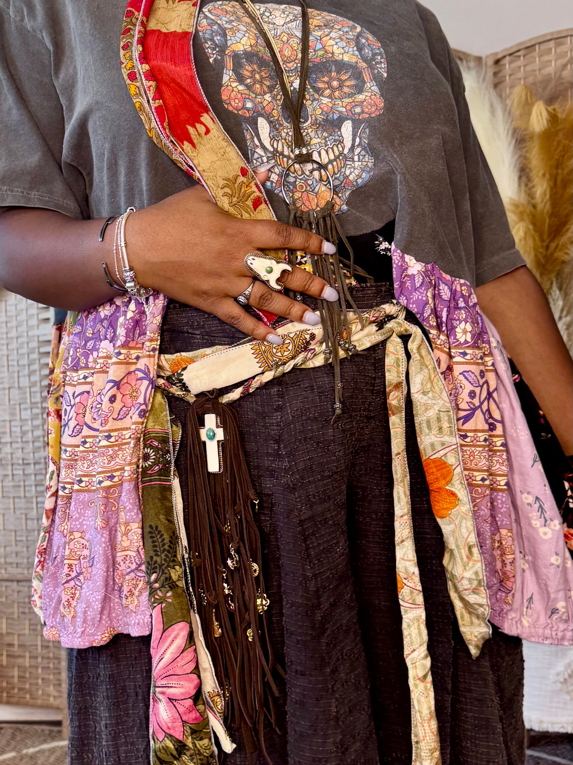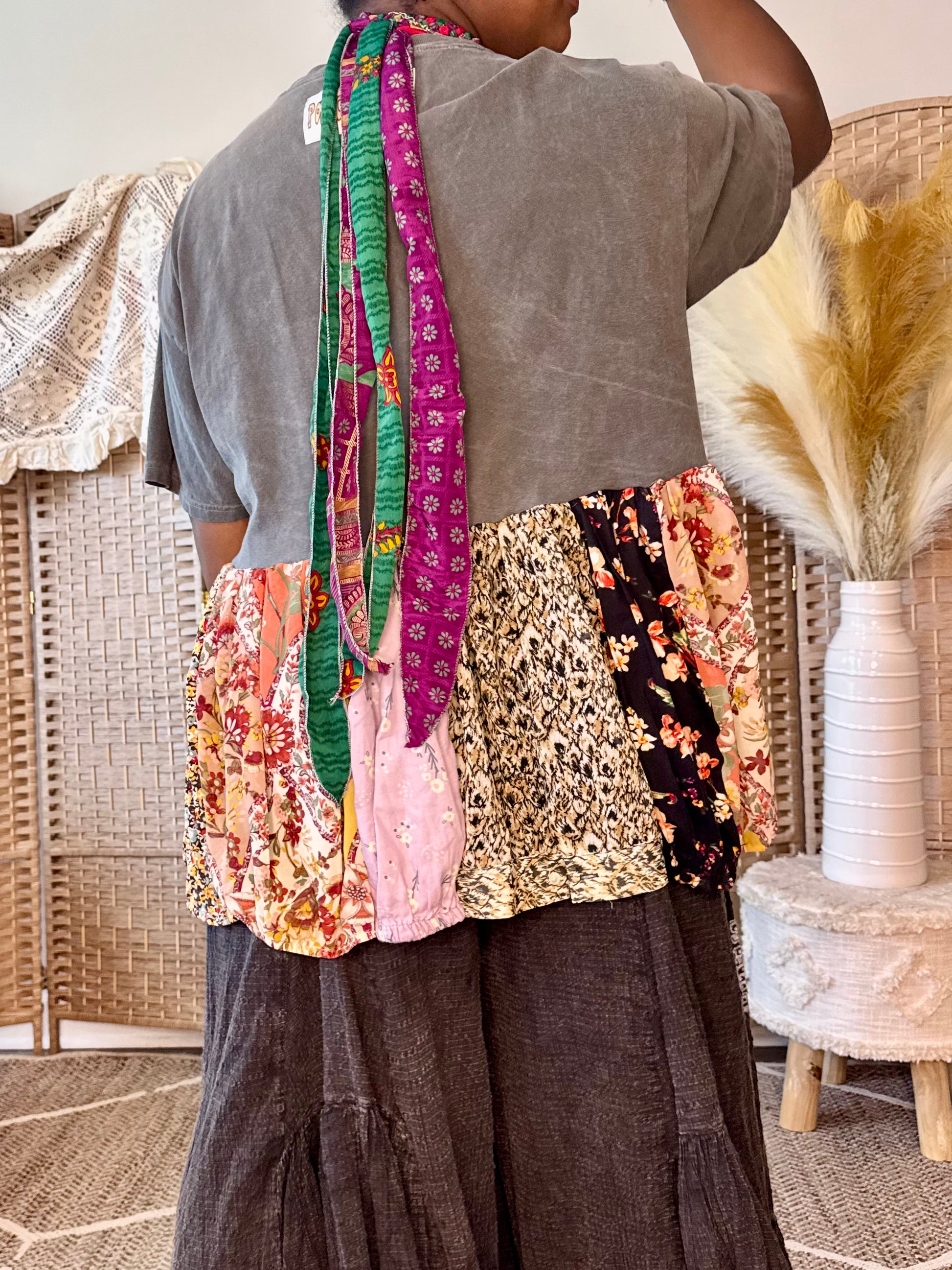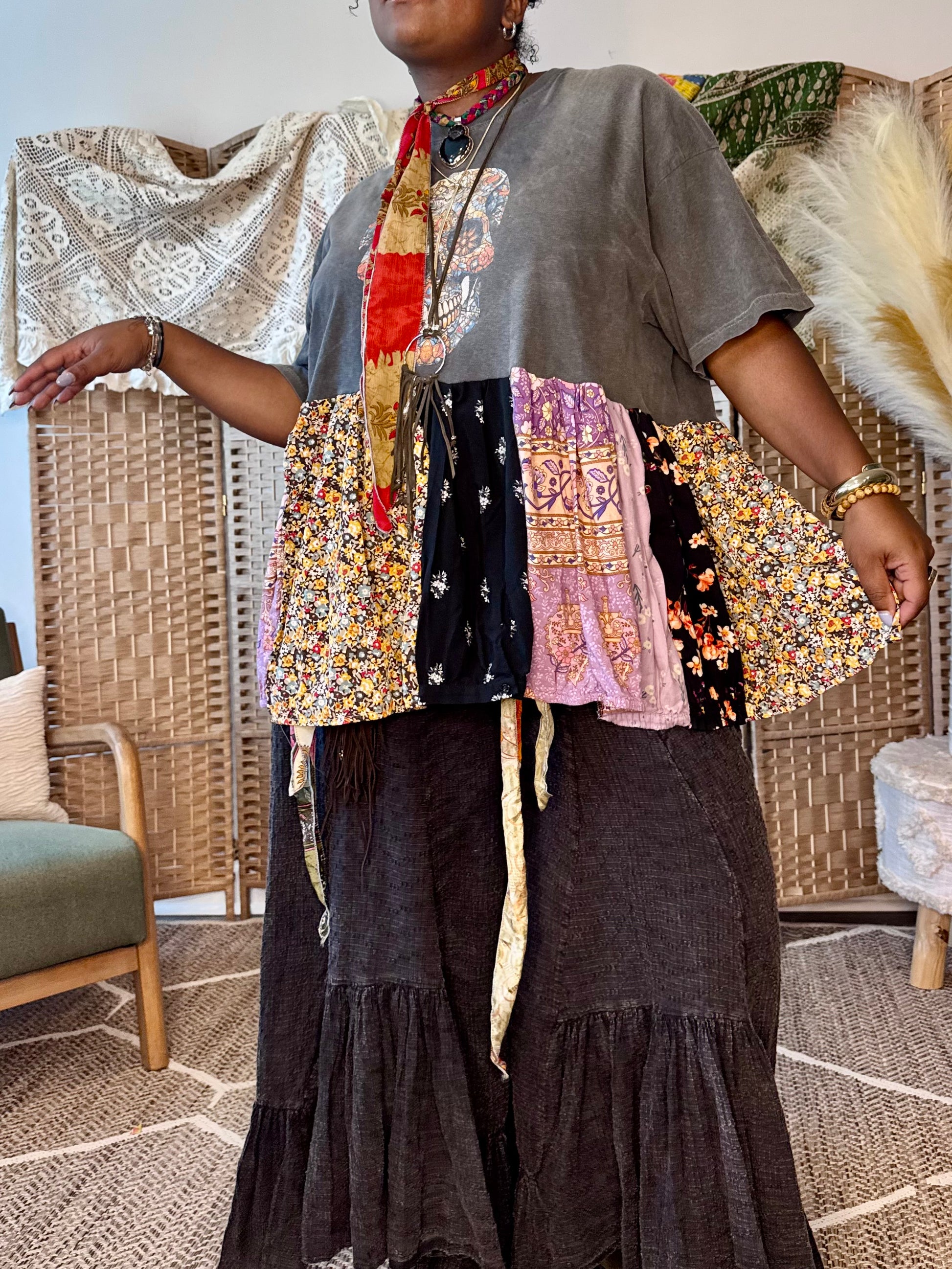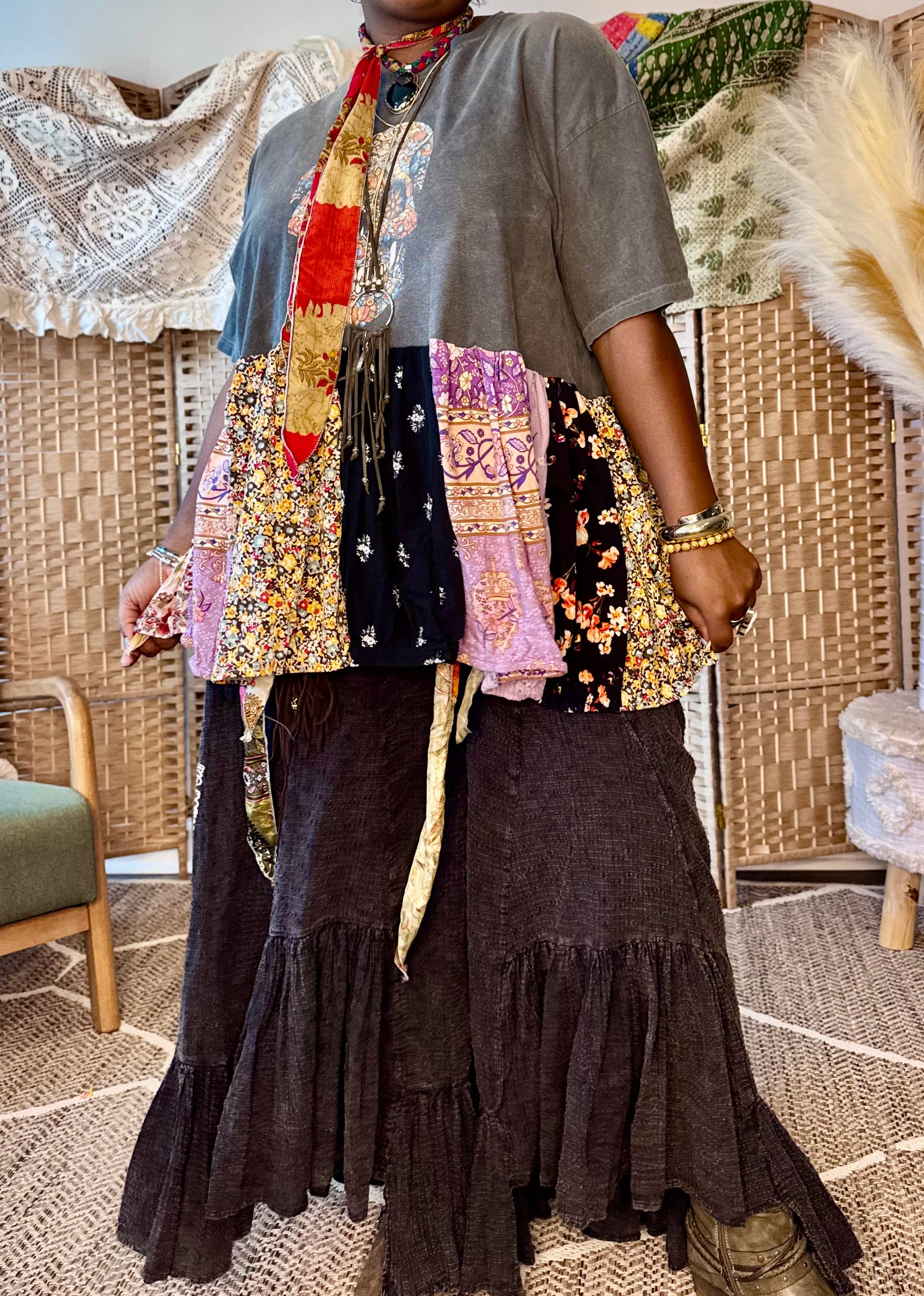 - All fabrics are hand arranged and cut into pieces to make a beautiful skirt.