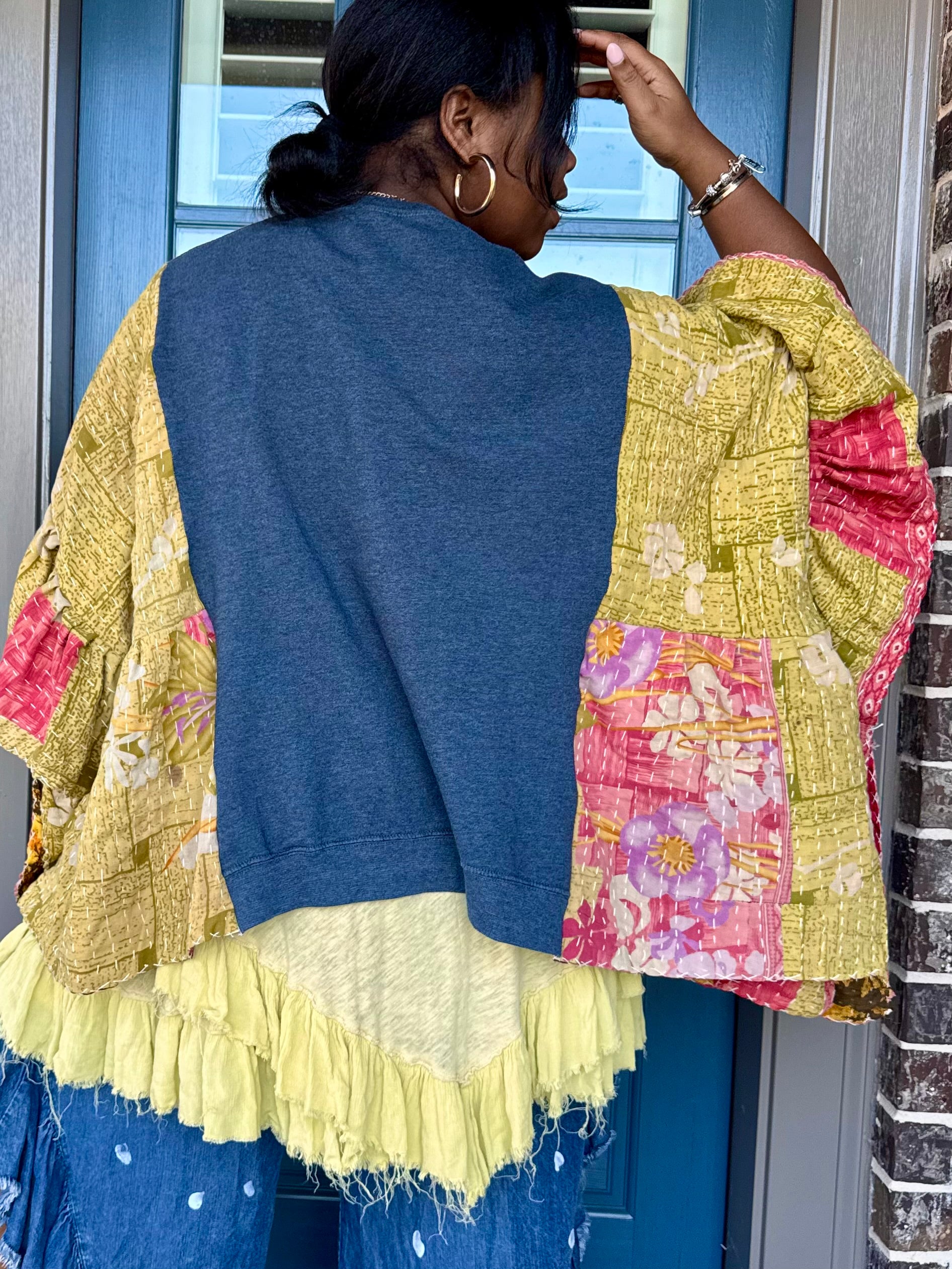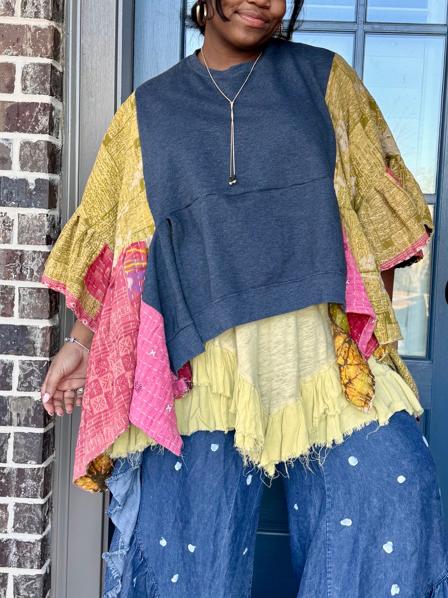 - All fabrics are hand arranged and cut into pieces to make a beautiful sweatshirt.